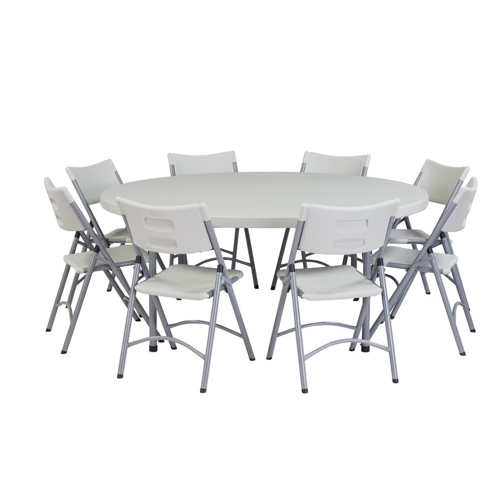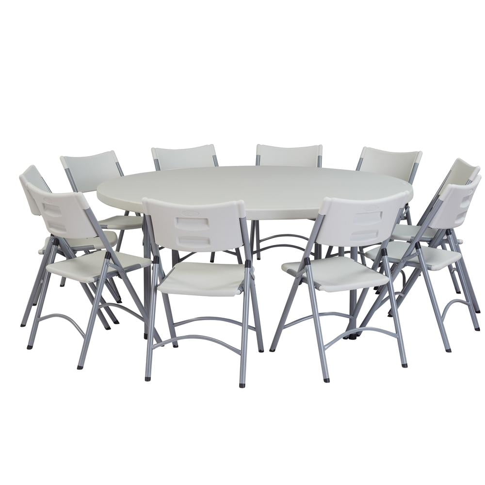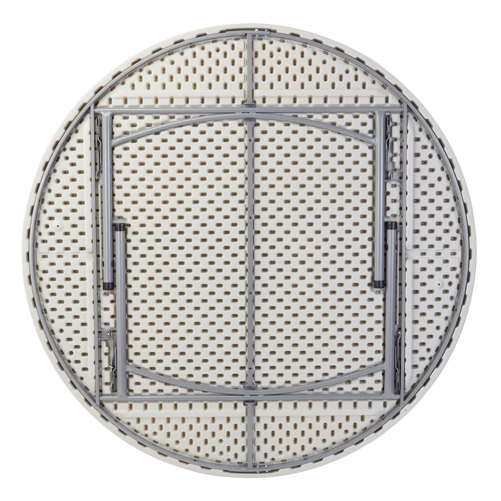 NPS 71″ round blow-molded plastic folding tables are the perfect solution for banquet and cafeteria use. Suitable for indoor or outdoor in any application that calls for affordable, lightweight, weather-resistant and highly durable folding tables. Their lightly textured design keeps them scratch-resistant yet still enables a surface smooth enough for writing. The plastic tabletop is designed to hold up to 700 lbs. of distributed weight! The tabletop color is a light speckled gray matching the textured gray powder-coated 19-gauge steel frame.