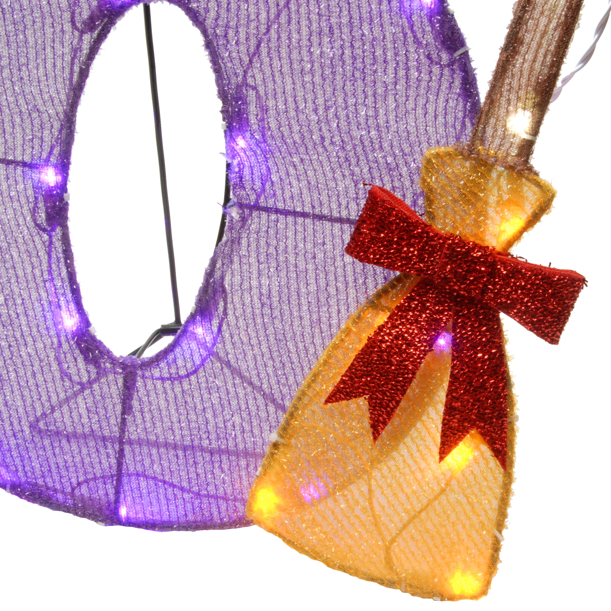 Halloween themed 23 inch wall or floor decoration depicting the outline of the word BOO with a witch’s hat resting on the B and a broomstick on the O. Dazzle guests with this enchanting accent piece, featuring LED lights that illuminate the decoration a bright orange, green and purple. Hang on a wall, door or in a window using the convenient mounting loops to fill your home with spooky splendor. Operated by a wall plug-in, this decoration is easy to set up. Simply plug into an outlet, turn on the lights and let the holiday fun unfold before your eyes.