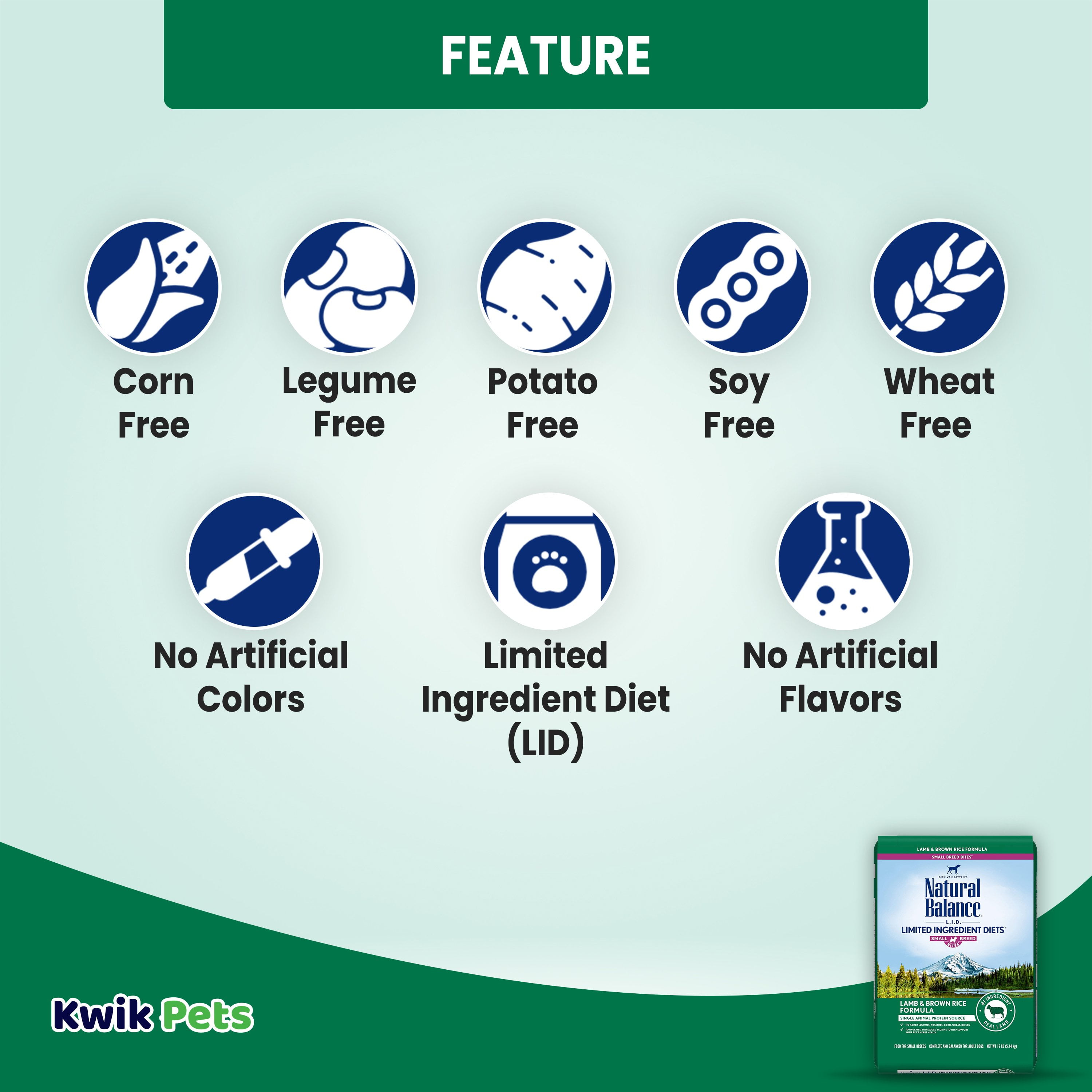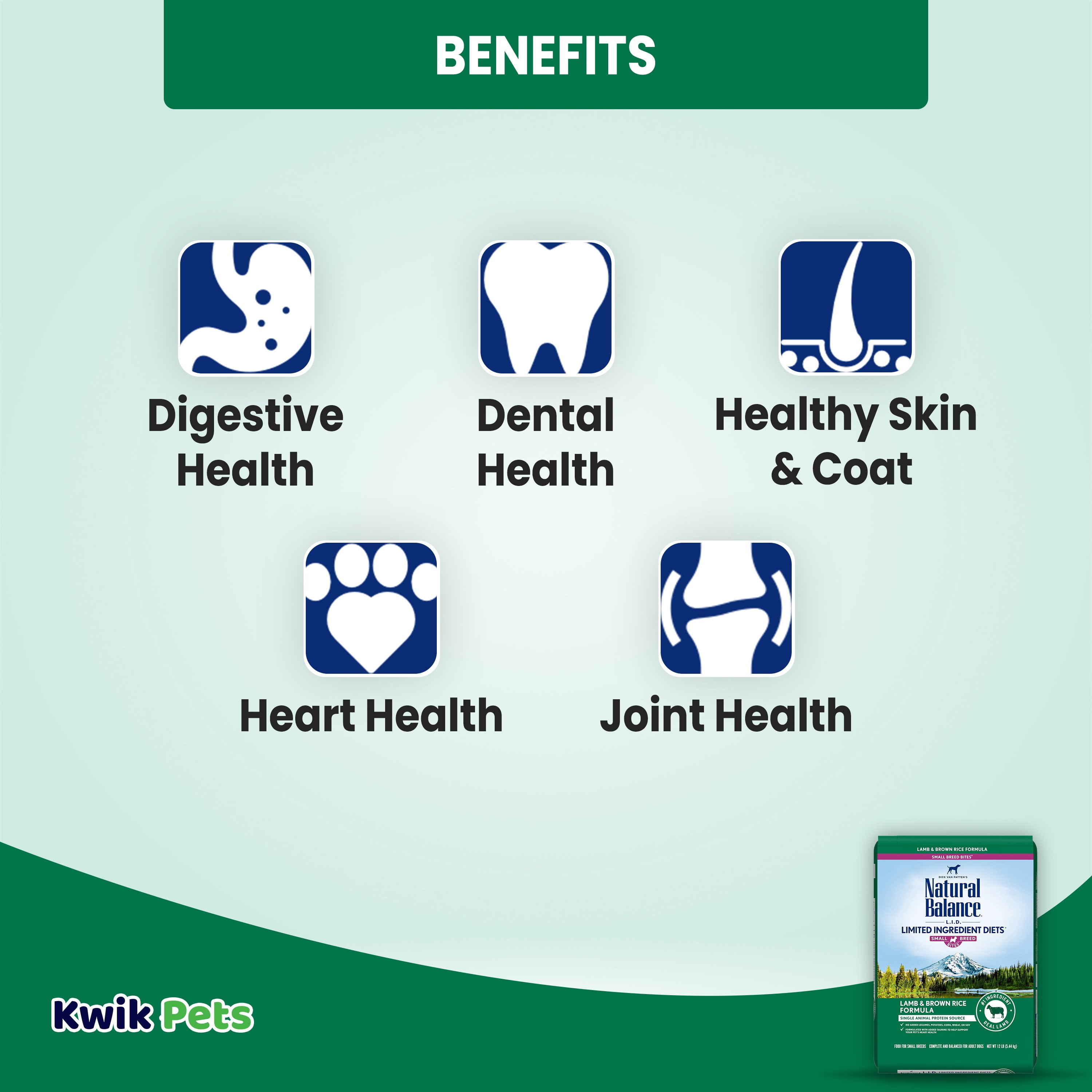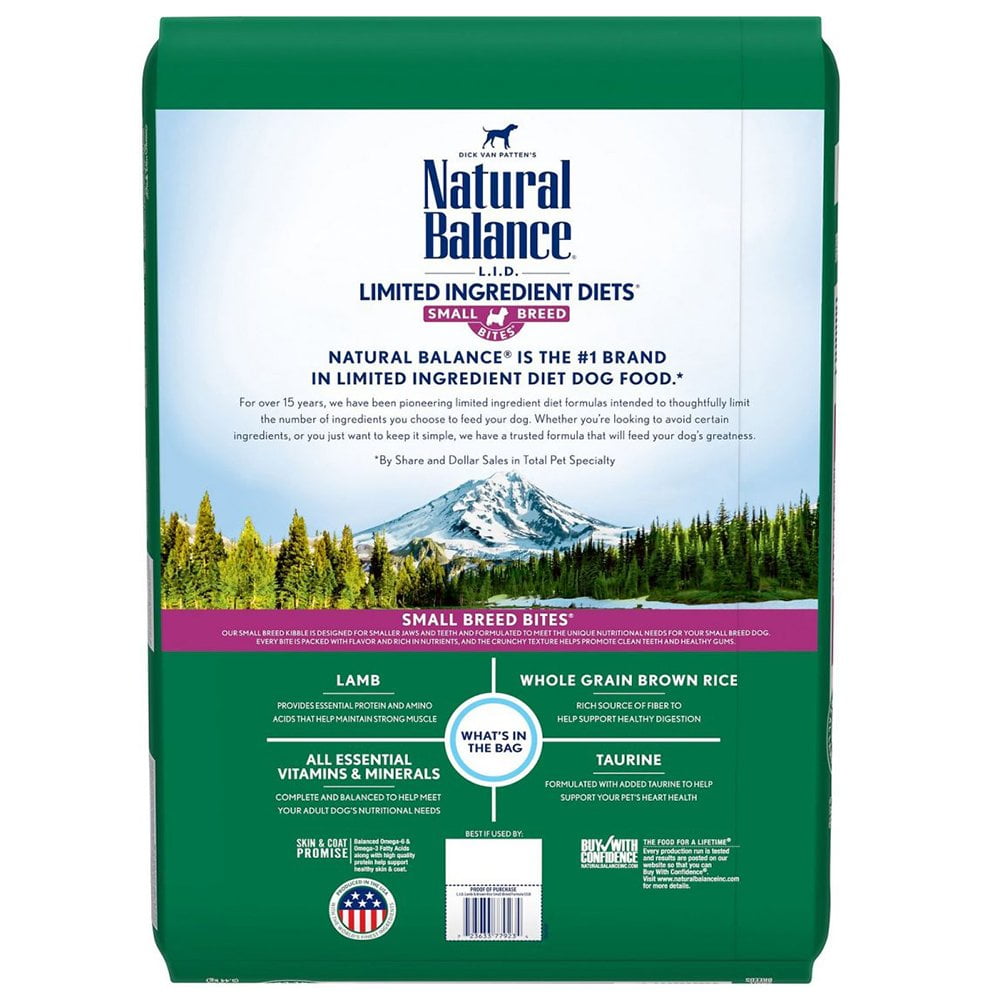Help bring out your best budâs best with the select, simple, premium ingredients and delicious taste of Natural Balance L.I.D. Limited Ingredient Diets Lamb & Brown Rice Small Breed Formula Dry Dog Food. This grain-inclusive premium dog food is made with no gluten ingredients. The first ingredient is real lamb, which provides amino acids to help build the strong muscles your dog needs to make the most of your adventures together. Meanwhile, whole-grain brown rice contains fiber to help support healthy digestion and our smaller kibble is designed to accommodate the unique needs of your small breed dog. And with essential vitamins and minerals, this delicious lamb and brown rice formula dog food is complete and balanced. To top it all off, like all Natural Balance products, itâs backed by our Buy With Confidence promise, so you can rest assured that itâs healthy, tasty and safe.