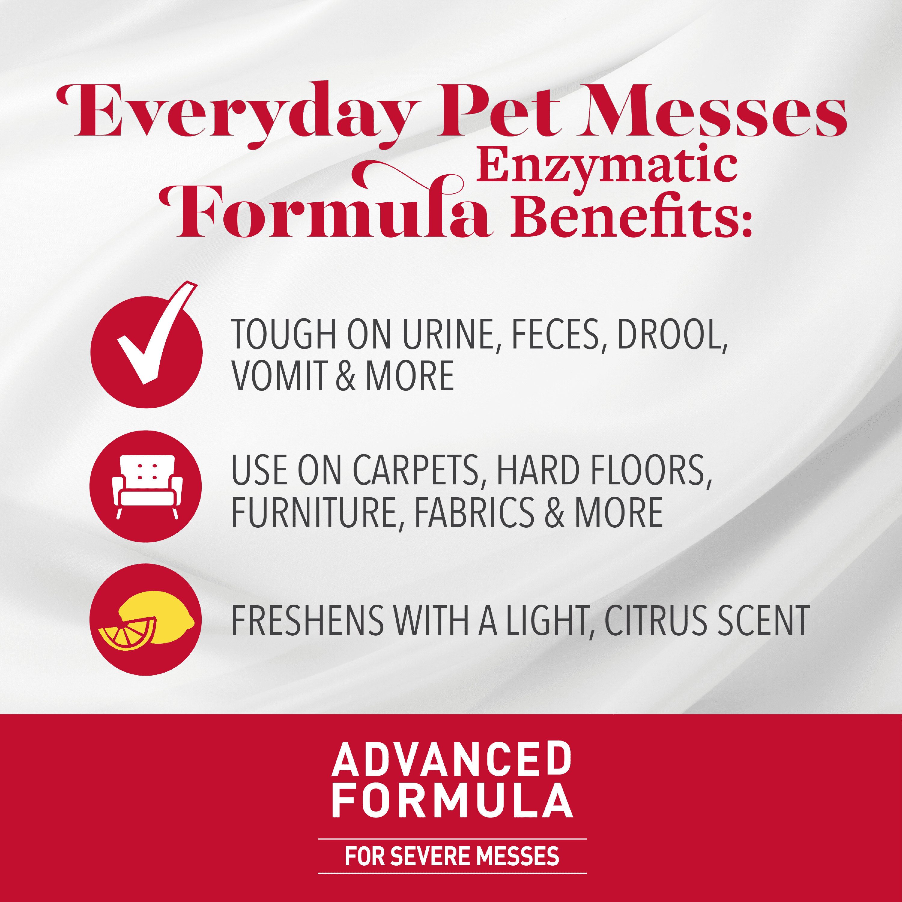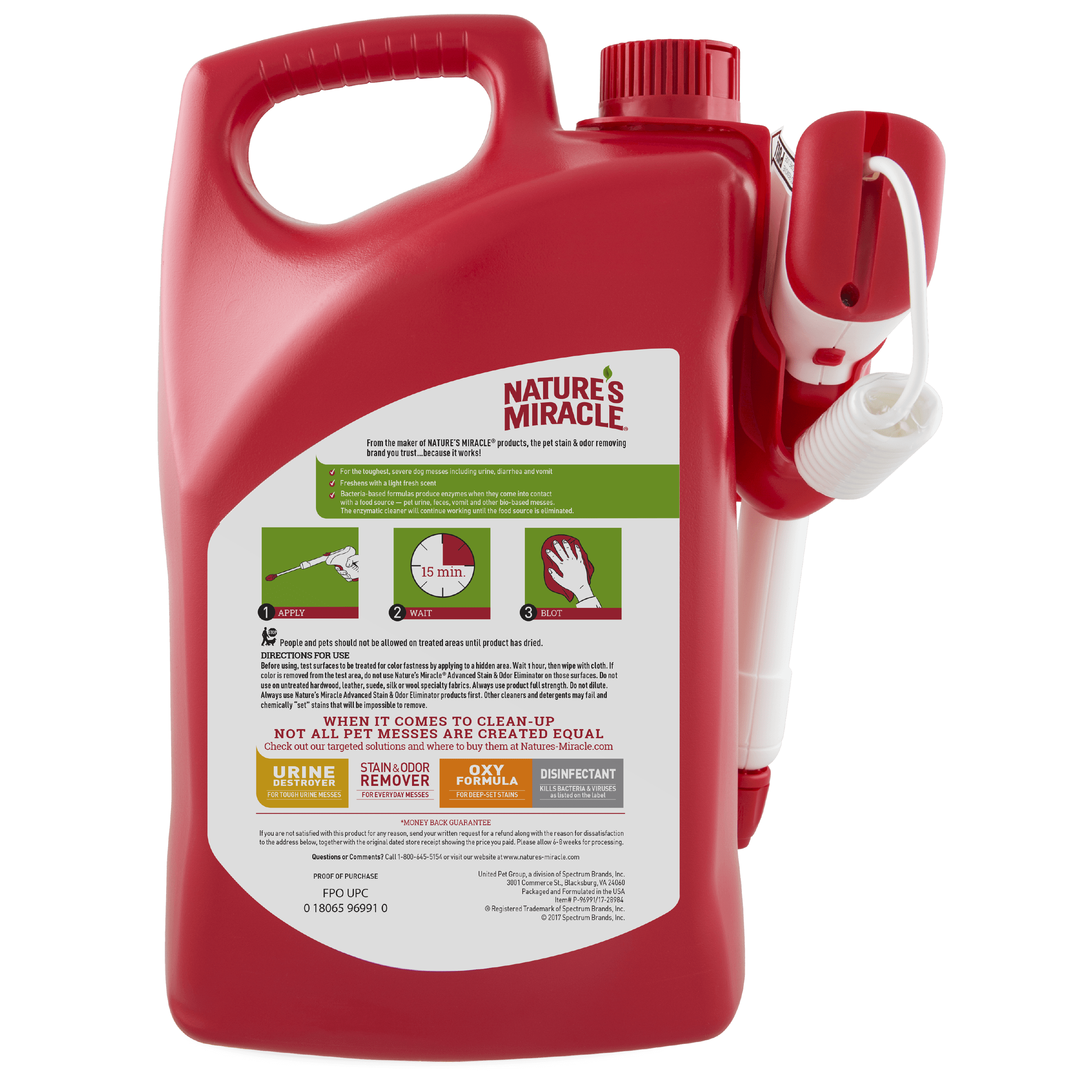 Nature’s Miracle pet stain and odor removers have been a trusted brand for pet mess cleanup for more than 35 years. Whatever pets do, you can trust Nature’s Miracle stain and odor removers, training aids, disinfectants and litter products to undo. Accidents happen, as every dog owner knows. Nature’s Miracle Advanced Stain & Odor Eliminator for dogs is an enzymatic, severe-mess stain and odor remover that actually discourages re-soiling by removing the odor of even the toughest dog messes. Bacteria-based formulas produce enzymes when they come into contact with a food source – pet urine, feces, vomit and other bio-based messes. This enzymatic cleaner continues working as long as the food source is present. Freshens with a light fresh scent. Includes the AccuShot continuous power sprayer with an extendable wand.Use on carpets, hard floors, furniture, fabrics and more (see the product label for a complete list of fabrics). Do not use on untreated hardwood, leather, suede, silk or wool specialty fabrics. Always use this product at full strength. Just apply, wait 15 minutes, then blot up stain with a white cloth. When used as directed, this product is safe to use around your pets and in your home.Always use Nature’s Miracle products first. Other cleaners and detergents may fail and chemically “set” stains that will be impossible to remove.