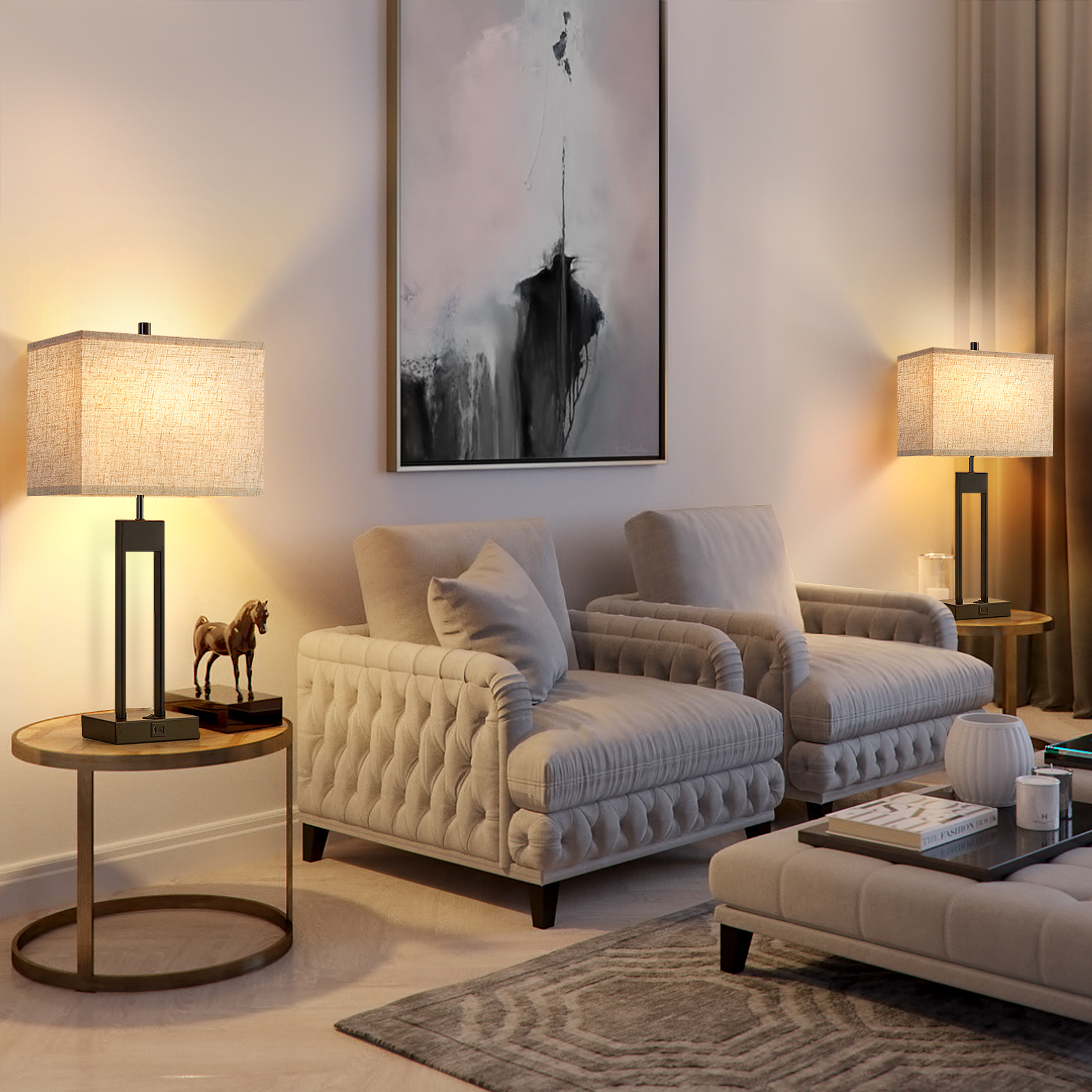 Upgraded USB A+C charging Ports: These bedroom lamps set of 2 built-in USB A and USB C ports allows you to conveniently charge your mobile phones, kindles, headsets, diffusers, speakers, and other electronics. Whether the light is on or off, you can keep your desktop organized and tidy with this table lamps Table Lamp with 3 Color Modes: The bedside table lamp is designed with 3 Color Modes: Warm White, Natural White, and Day White((2700K, 3500K, 5000K). You can change the light with the rocker switch. Different Modes create a different atmosphere to meet your daily needs. The lamp will provide you with a comfortable and one-of-a-kind home lighting experience Rocker Switch Night lamps: We have found that many people are troubled by runaway touch control lamps. To solve this problem, this bedside lamp is designed with a traditional push button on the base, turn on /off the light by pressing the button. So you never worry about sudden lighting at the wrong time such as at midnight Included 2 Light Blubs: This table lamp for living room comes with two dimmable 9W LED bulbs, and the brightness is 800 lumen. Eliminating the need to purchase extra bulbs. Give stable, soft lighting without flicker or glare, protecting your eyes. Perfect for the nightstand, bedroom, and living room Minimalist Style Design: Designed with black finish poles and complemented with rectangle fabric lampshades. These lamps for nightstands add style and elegance to your room even when there is no lighting during the day. The material of the lamp body is metal, it is not only fashionable and beautiful, but also durable and avoids tipping, sliding, or moving around