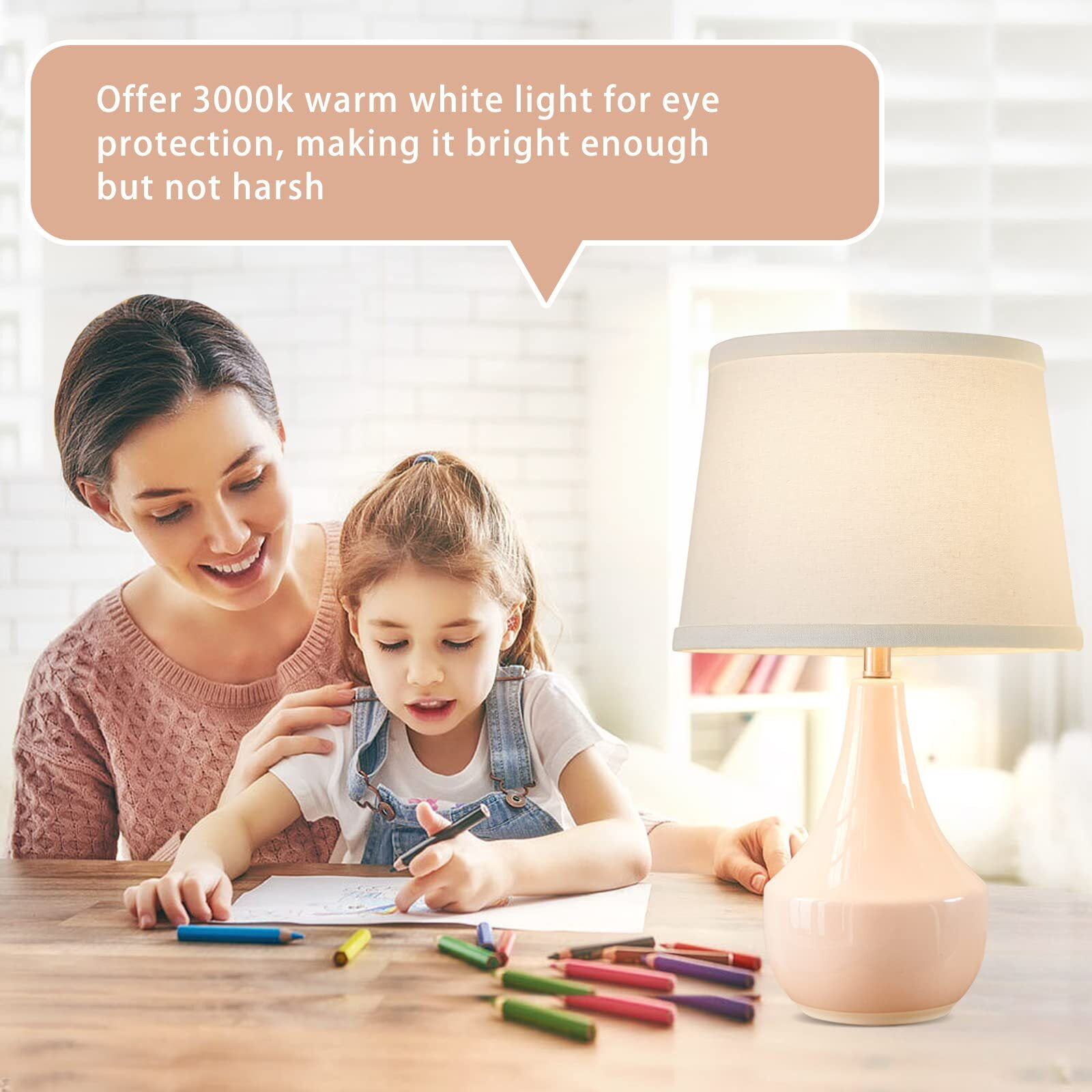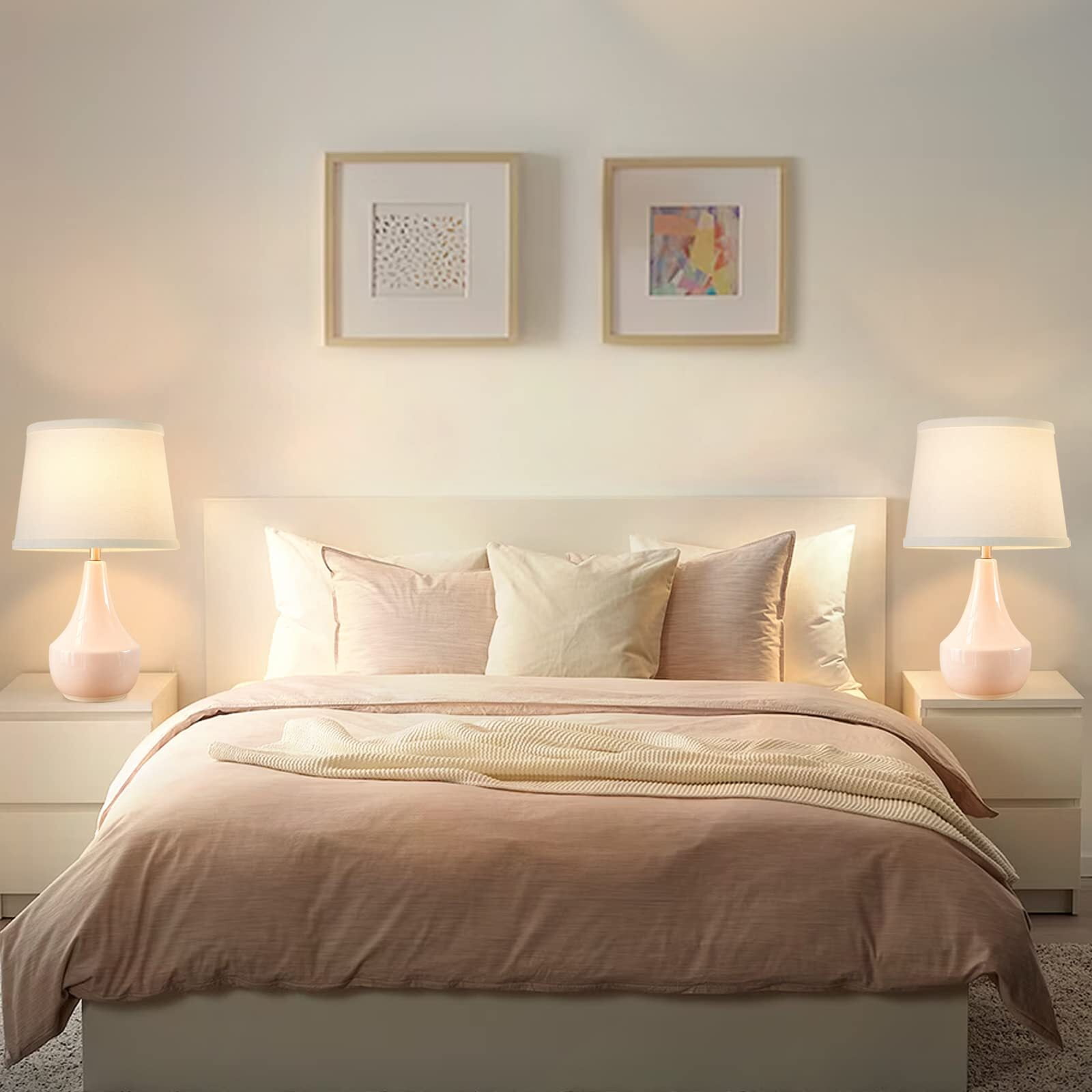 Priority Quality & Easy Assemble Table lamp Lamps for bedrooms are designed to improve life quality, adding an elegant decor to your place. High-end Ceramic lamp body will not fade as the time goes, durable and convenient to maintain. This table lamp are easy to install without tools. Following the instruction to assemble this lamp shade. Offer 3000k Warm White Ligh For Eye Protection This table lamps set of 2 with fabric lampshade soften the light and offer 3000k warm white light, making it bright enough but not harsh, which provides a cozy feeling. With soft light emitted, it can effectively relieve eye fatigue and protect the eyesight of your family. Whether you want to read, write or simply relax, the standing lamp provides ample illumination without straining the eyes. Modern Styles And Widly Use The beside lamp set of 2 are made with ceramic body, which is modern styles, durable and elegant. With a ceramic lamp body means resistant corrosion and tarnishing waterproof. This table Lamp Set of 2 is an ideal nightstand lamp for living room, bedroom. Also ideal as a gift for family and friends. LED A19 Bulbs Included Two A19 LED bulbs(base: E26) are packed with this bedside table lamp for your convenience. No more need to suffer endless comparison and hesitation to decide which bulb to buy. Compare with incandescent bulb, glare free and non-flickering, saving up to 90% electric bill while emitting sufficient glow to illuminate a room.