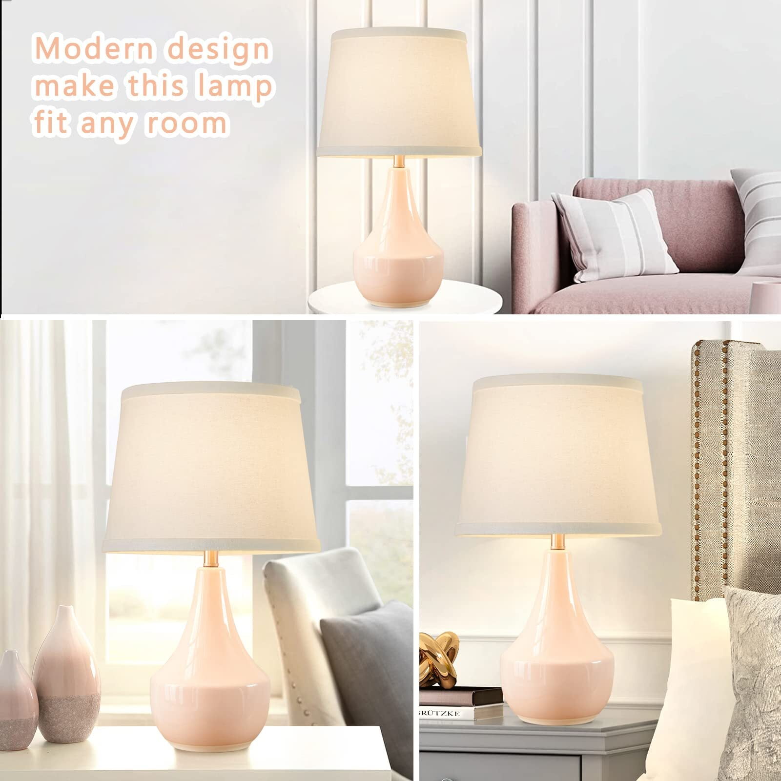 The modern bedside lamps are adopted with the high-quality white fine fabric lampshade and stable LED bulb which not only makes the glow softer to create a warmer and cozy atmosphere for you at night but also effectively relieves eye fatigue and protects the eyesight of your family. whether it is used for reading, working, or as any background light. Product details Style: Modern, Classic, Vintage, Minimalist Color: Pink; White Lampshade Product Dimensions: 11″D x 11″W x 18.62″H Material: Ceramic Lamp Type: Table Lamp Room Type: Office, Living Room Shade Material: Fabric Shape: Bulb Switch Type: Rocker Wattage: 9 watts Item Weight: 6.41 pounds Maximum Compatible Wattage: 60 Watts Voltage: 120 Volts Packing Included 2* Ceramic Lamp Body 2* Fabric Lampshade 2* TLED Bulbs 1* User Manual