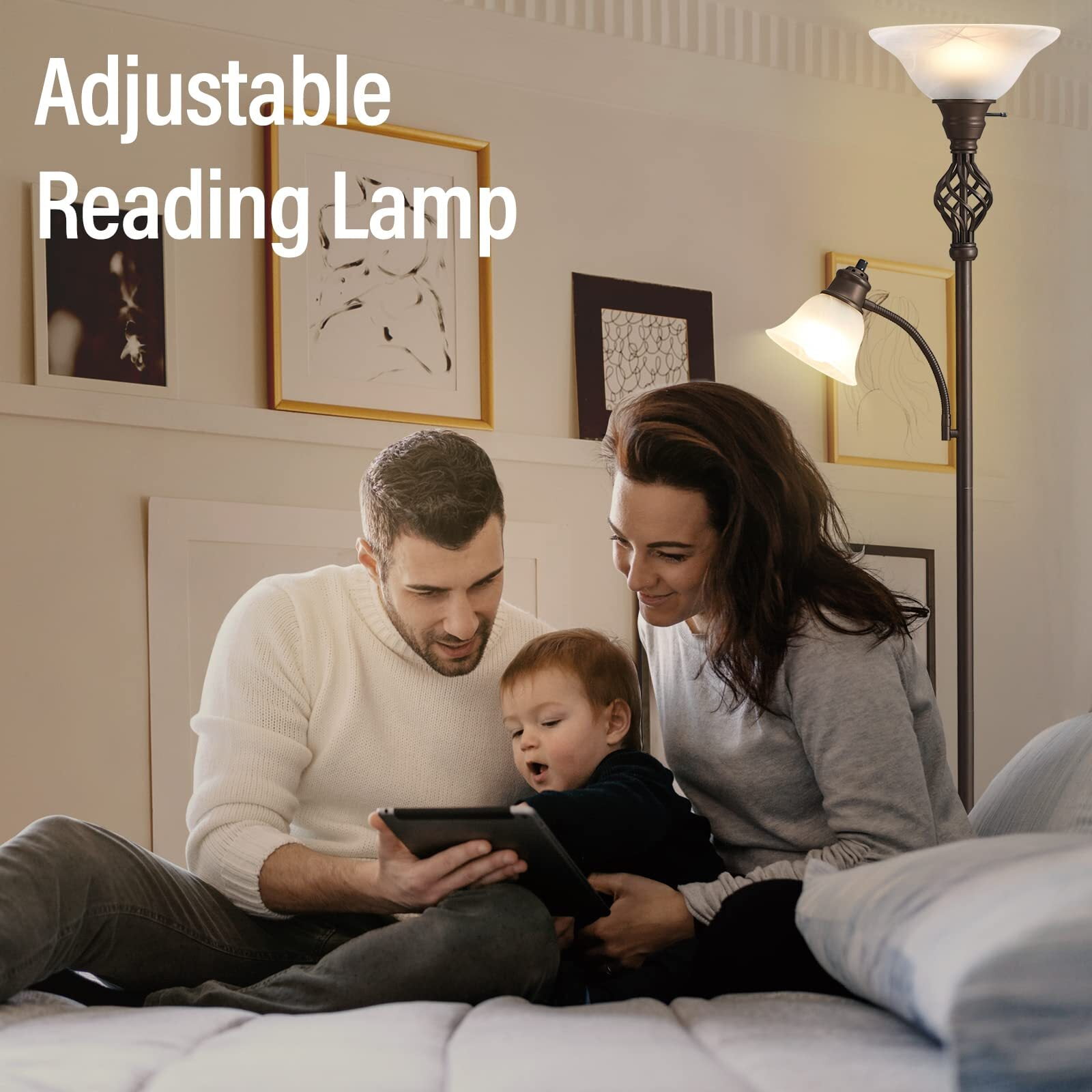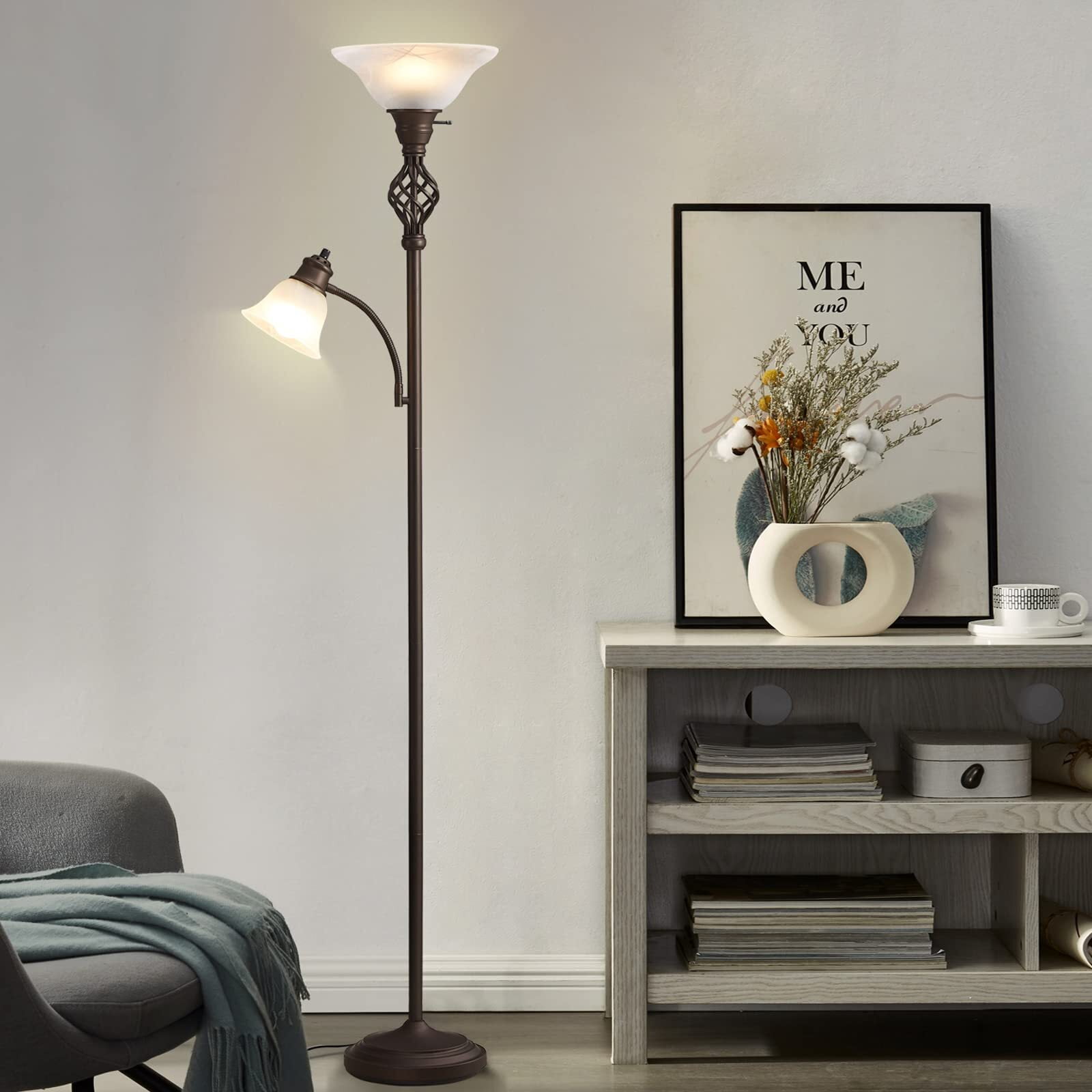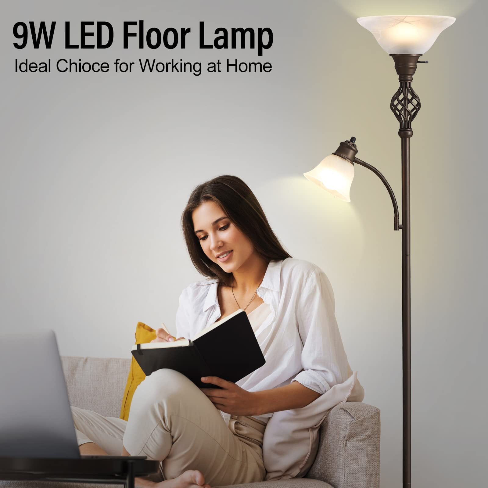] The glass bowl-shaped frosted shade provides ample lighting to any space. The swirling vane details add depth and texture to the glass, making it a true statement piece. The thick glass and the swirl vane details throughout make the floor lamp a beautiful addition to any living room and a wonderful conversation starter. ] Made from high-quality iron, the base of torchiere floor lamps is designed to provide a stable and secure foundation for the floor lamp, preventing it from tipping over even in high-traffic areas of your home. Not only sturdy but also adds a touch of elegance to the overall design of the lamp. ] This separate reading light features a gooseneck arm so that the light can be positioned where it is most needed. Use it near an armchair, bedside, desk, or craft table for just the right amount of light. This reading light can be used together with the floor light or on its own. ] The decorative twisting vine detail adds a touch of timeless charm to this piece of functional floor lamp. Not only a floor lamp for bedrooms, living rooms, offices, or classrooms but also a perfect choice for home decoration. The standing lamp fits well with urban, mid-century modern, casual, or contemporary decor. The floor lamp equipped with 2 A19 9W LED bulbs with a 50,000-hour lifespan, will reduce electricity bills and maintenance costs compared to traditional incandescent bulbs, saving energy and saving your money. The standing lamp keeps a cool touch even after hours of use, so no worries about the overheating issue.