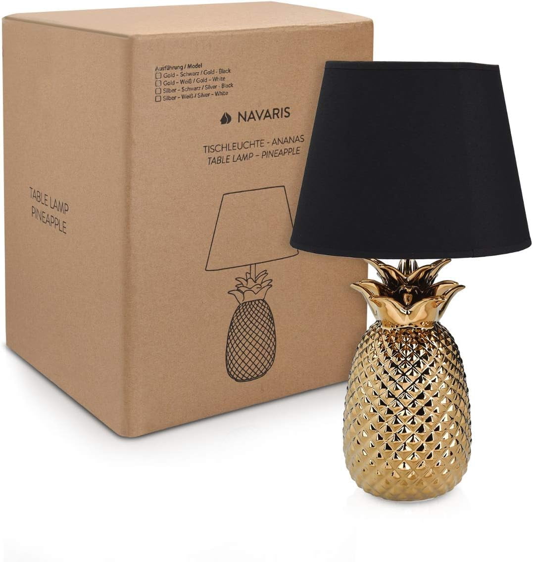 Elevate your home decor with the Navaris Gold Pineapple Table Lamp, a unique and eye-catching accent piece. Featuring a metallic ceramic base and a fabric lamp shade, this 13.8-inch tall lamp adds a touch of tropical style to any room. With a convenient toggle switch on the power cord, you can easily turn the light on and off. Suitable for use with E12 bulbs up to 25 watts, this lamp is perfect for bedside tables, end tables, or desks, bringing a warm and welcoming ambiance to your living space.