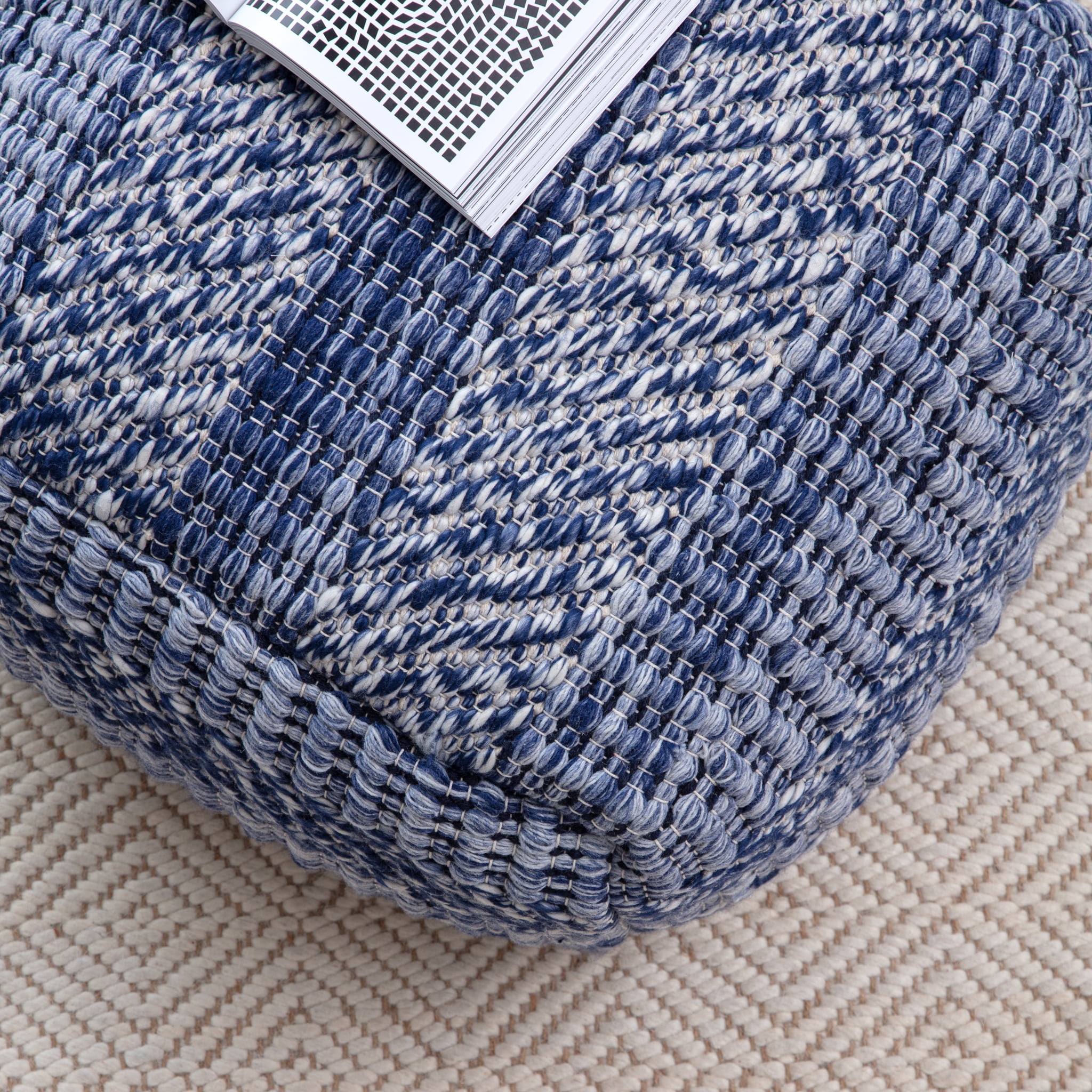 Jacquard-woven Polyester upholstery expertly hand crafted by skilled weavers, finished and filled in the United States Filled with a premium, recycleable, highly resilient expanded polypropelene bead that holds its shape much longer than traditional poufs Easy and durable compliment to any seating arrangement Beautifully cool, nuetral color fits in with almost any decor Large pouf with a supportive, yet comfortable sit Blot liquid spills immediately by pressing a clean, undyed cloth into the spill to absorb as much as possible. Spot-clean using a solution of mild dish soap and water, first testing the solution in a small, inconspicuous area of the pouf to be sure there is no discoloration. If you get a solid (e.g. chocolate bar, melted cheese) on the pouf, use the dull edge of a knife to scrape the solid up as much of possible and then follow provided instructions for liquid spills. If a piece of yarn becomes exposed, do not pull, instead, clip with sharp scissors.