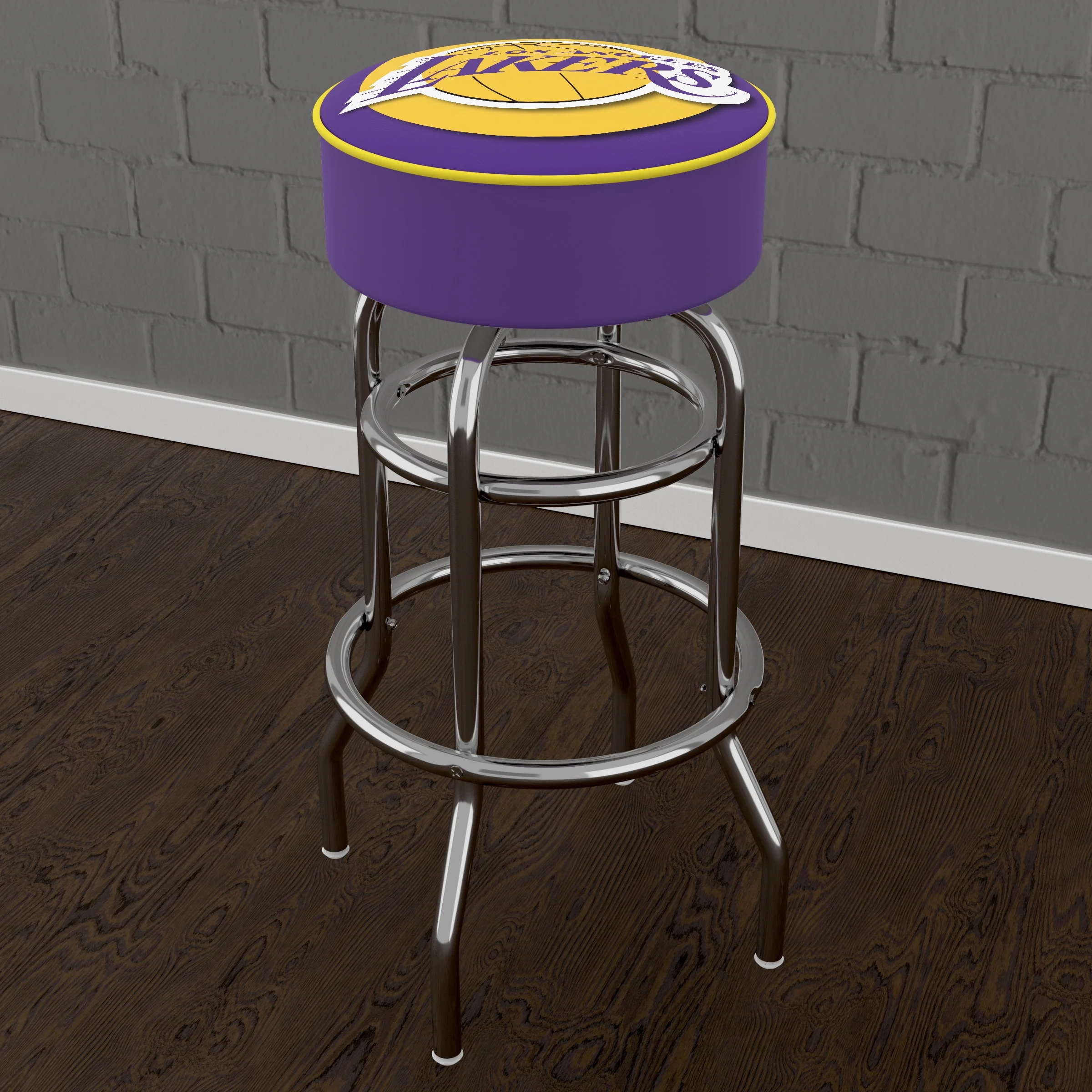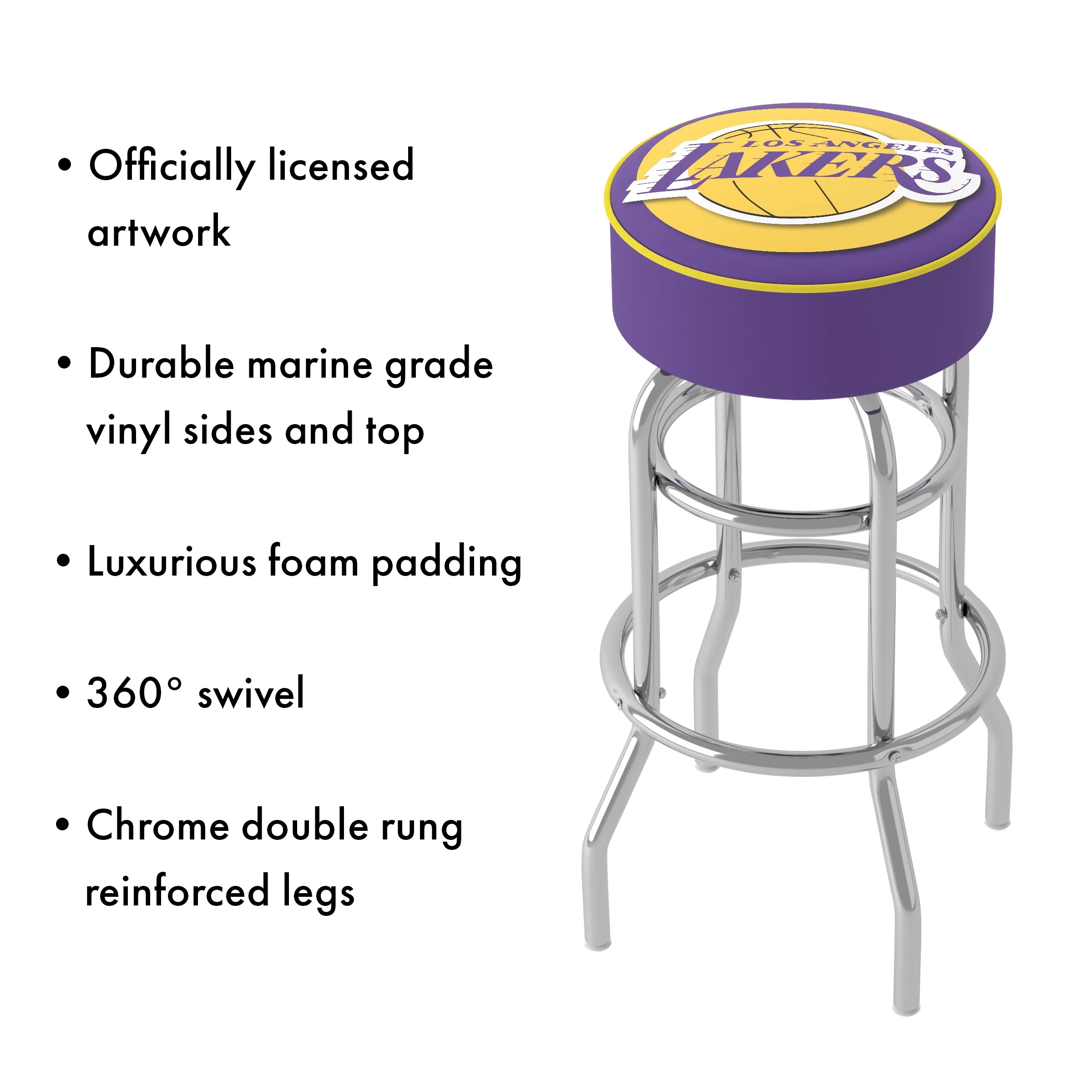 The officially licensed Los Angeles Lakers Bar Stools by Trademark Gameroom will provide you and your guests with a comfortable seat as well as a stylish accent to your game room, garage, or collection. The bar chair seat features an authentic logo highlighted by durable marine grade vinyl sides, and the top is trimmed with quarter inch vinyl beading for added durability. The stool chair comes equipped with luxurious foam padding, a 360-degree swivel, and chrome double rung reinforced legs made of tubular steel that is both lightweight and supportive. Bring style, function, and comfort to your basement, bar, or workshop with the sporty counter stools.