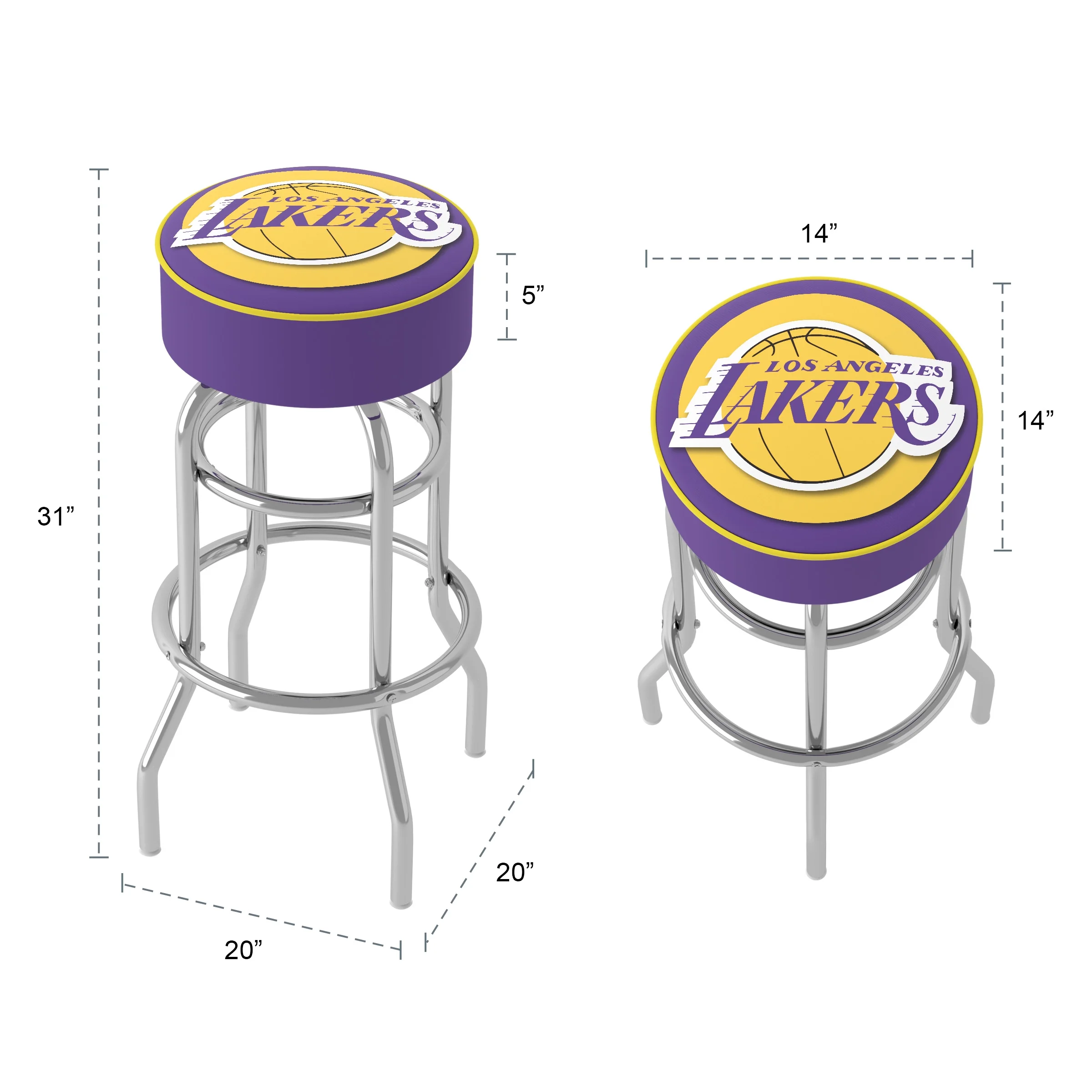 OFFICALLY LICENSED BARSTOOLS – The backless bar stools are sure to bring style to any basement, garage, or man cave with the officially licensed Los Angeles Lakers logo. FOAM PADDED SEAT – The counter stool is equipped with plush foam padding, while the marine grade vinyl sides and quarter inch vinyl beaded top provide added durability. REINFORCED LEGS – The base of the garage stool is constructed from tubular steel with chrome double rung reinforced legs, making this industrial bar stool both lightweight and supportive. 360-DEGREE SWIVEL – The workbench stool features a 360-degree swivel rotation for added versatility and will make an excellent addition to any area of your home or bar. MATERIALS – Chrome Plated Steel, Marine Grade Vinyl, and Foam Padding. DIMENSIONS – (L) 20″ x (W) 20″ x (H) 31″; Seat: (L) 14″ x (W) 14″ x (H) 5″; Vinyl Beading: 0.25″.
