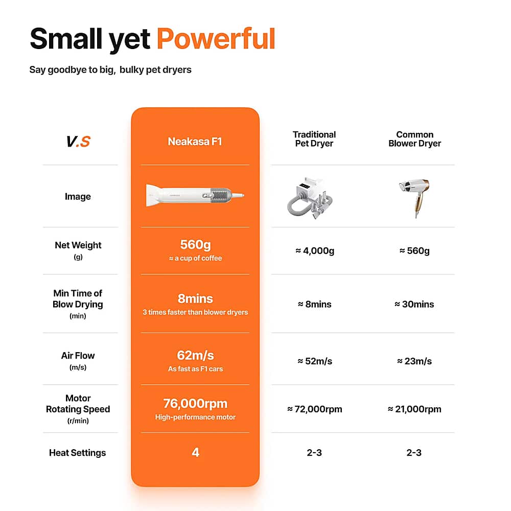 The Neakasa F1 Dryer is the lightweight and portable solution you’ve been searching for. Weighing only 1.2lbs, this dryer will keep your furry friend looking their best no matter where your adventures take you.