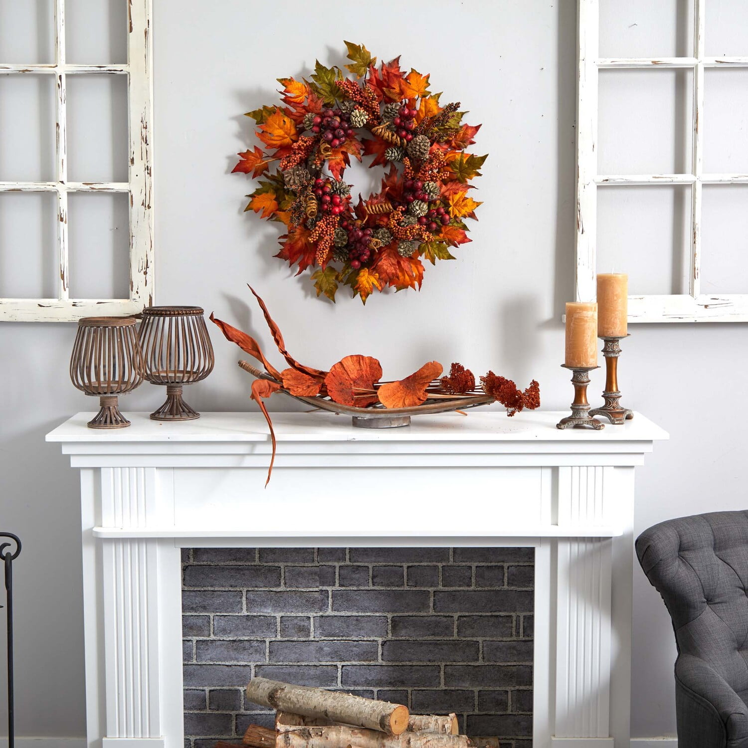 Nearly Natural 24″ Maple and Berry Wreath Set your Autumn and holiday decorating ablaze (ok, not really) with this incredible Maple and Berry Wreath. A full 24″ in diameter, it will find an ideal home in your dining room, living room, or anywhere else that could use a touch of autumn (makes a great office decoration as well.) Best of all, the cornucopia of leaves, twigs, pinecones, and berries never needs care, and will stay looking fresh for years. Height: 24 “, Width: 24 “, Depth: 24 “. Category: Wreath. Brand: Nearly Natural Model Number: 1368-4810Shipping Details