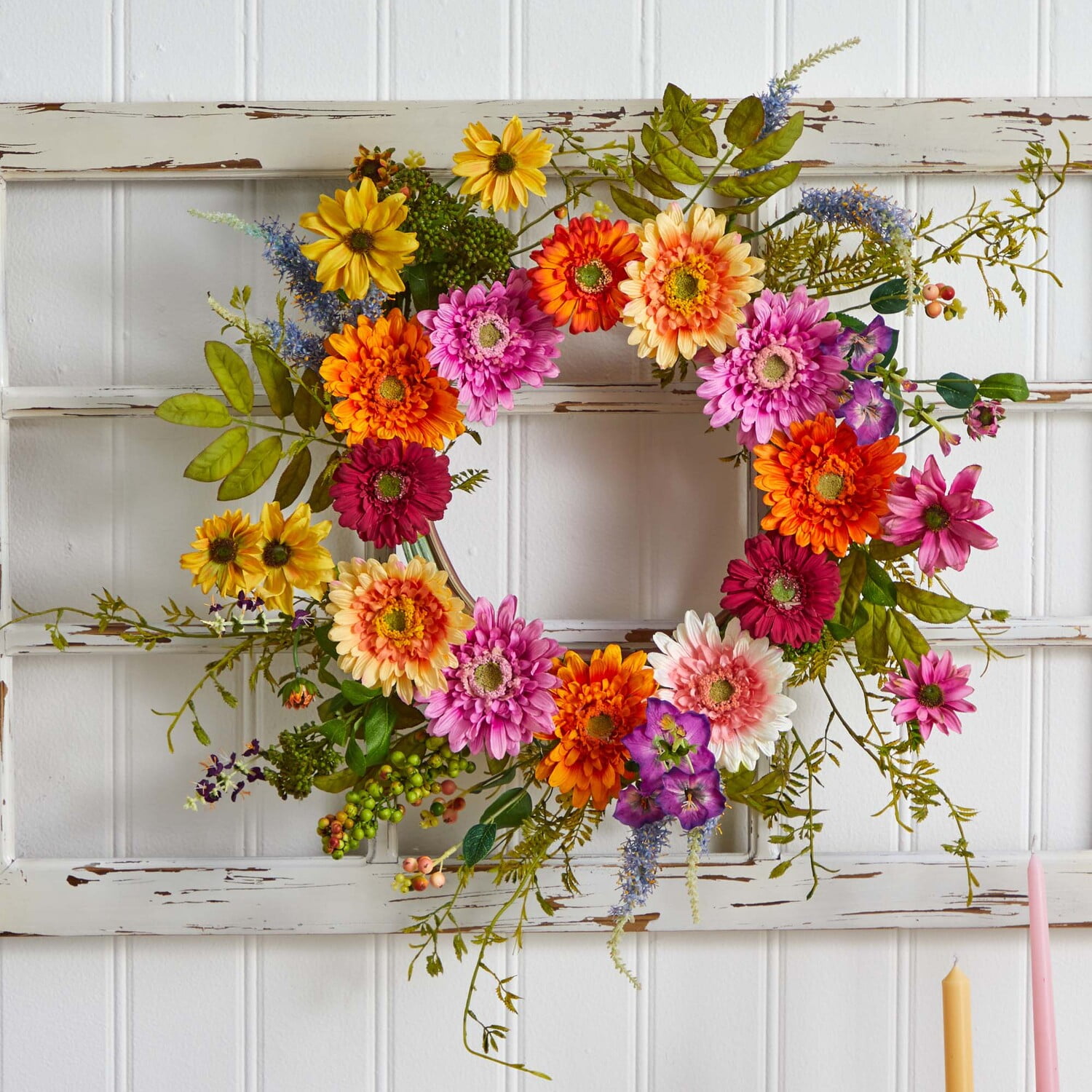 Includes: One (1) wreath Plant type: African sunflower Materials: Polyester, iron wire