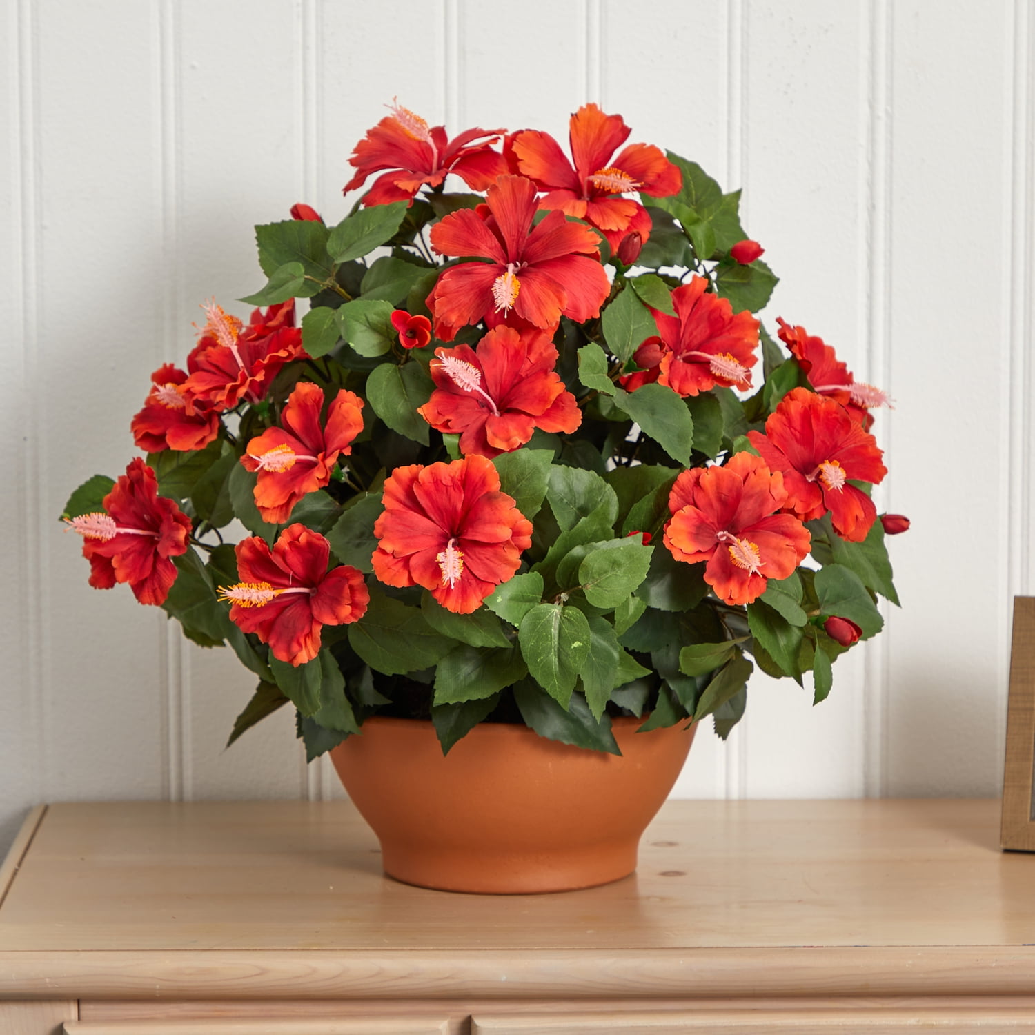Nearly Natural Hibiscus with Clay Planter Everyone loves the Hibiscus. And why not? It’s an ideal combination of lush, pointy greens and delicate (yet intricate) blooms that get more interesting the longer you look. Featuring the “bloom in a bloom” that the Hibiscus is famous for, this wonderful plant will stay looking fresh for years, with nary a drop of water. Makes an ideal arrangement for a kitchen, dining room, an office, or anywhere else that needs a little cheer. Height: 20 “, Width: 22 “, Depth: 22 “. Category: Silk Plant. Pot Size: H: 5 “, W: 11 “, D: 11 “. Brand: Nearly Natural Model Number: 1368-6735Shipping Details