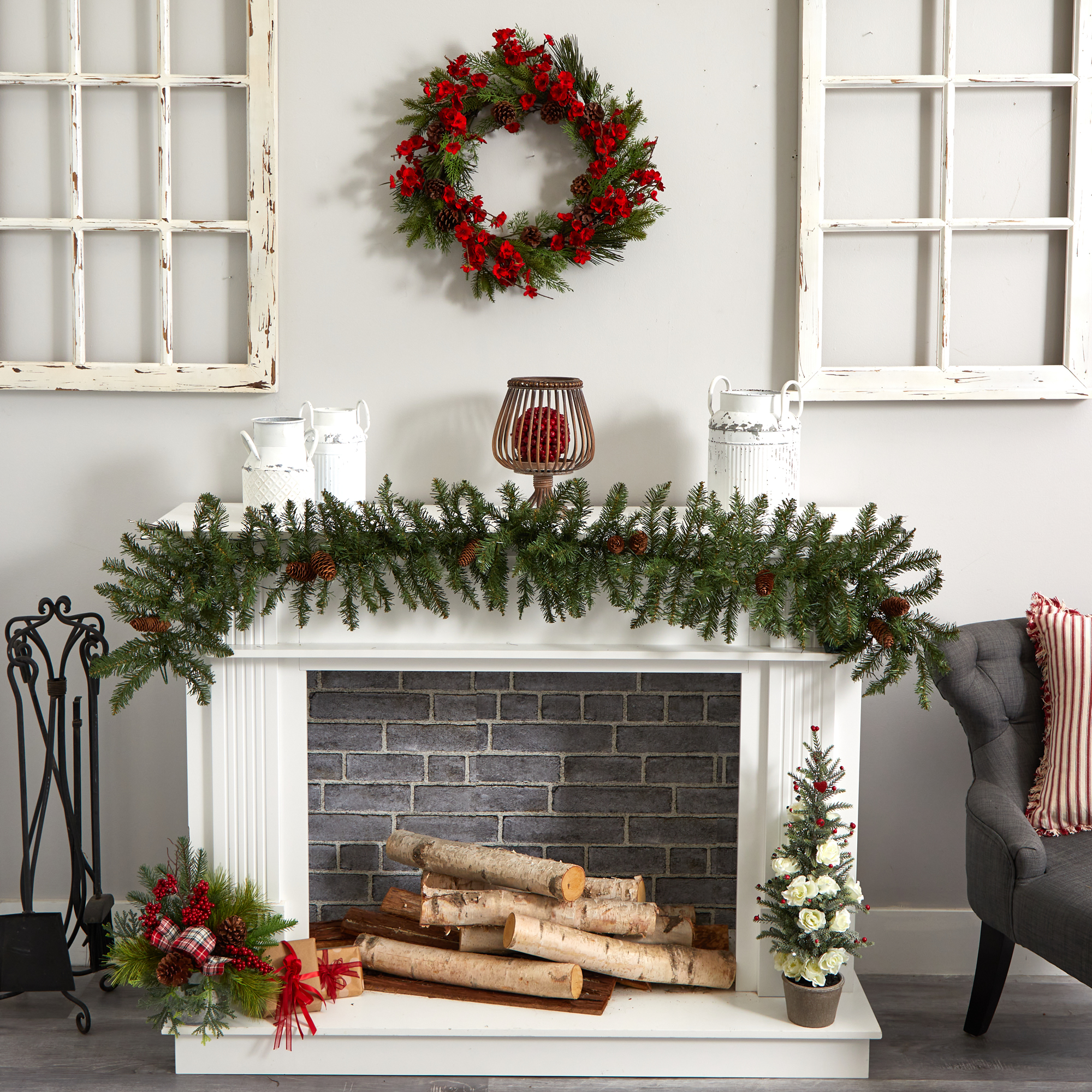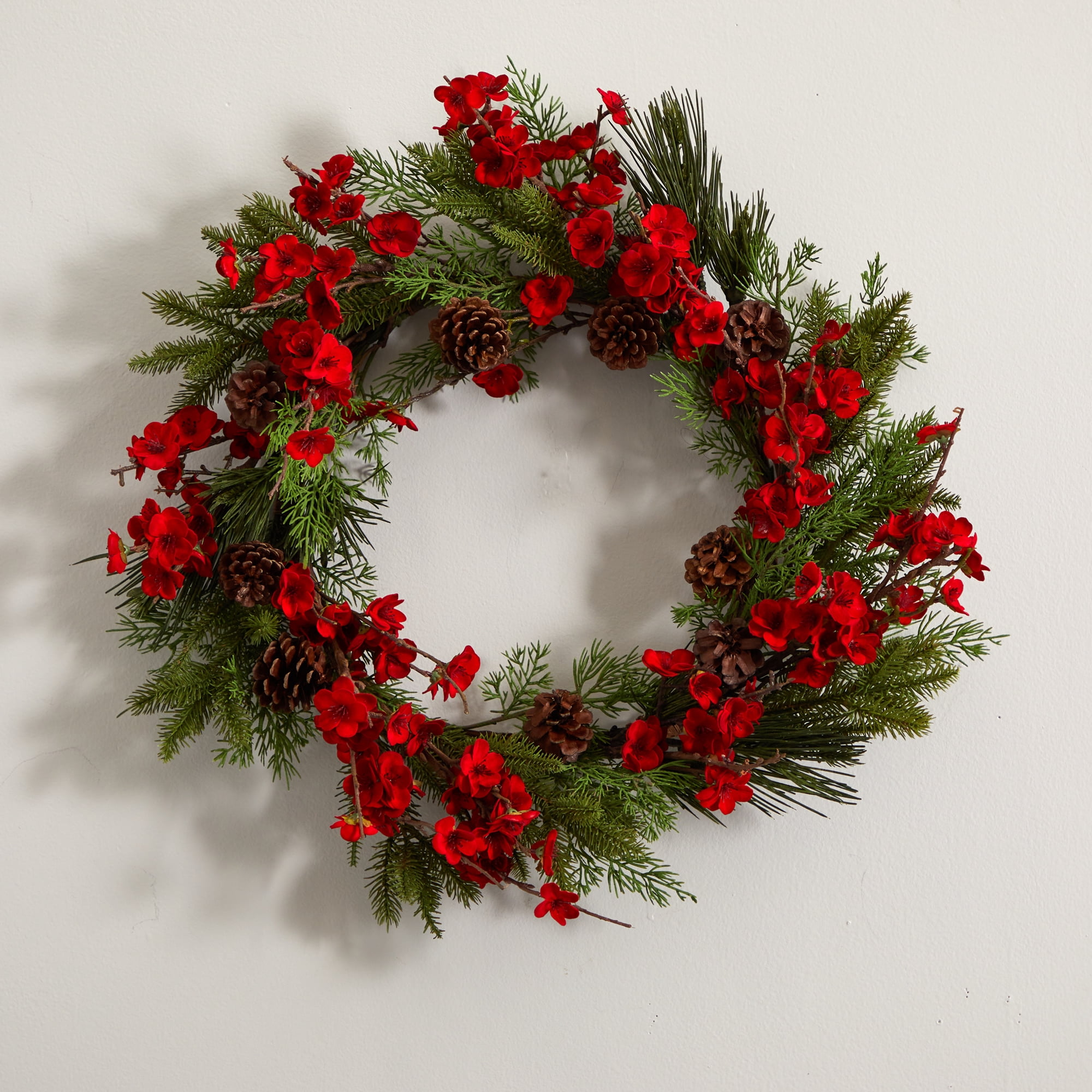 Nearly Natural 24in. Plum Blossom Pine Wreath, Red: Plum blossom flowers in holiday red Bright, seasonal pine leaves Handcrafted with life-like materials Dimensions: 24″ Diameter Perfect for hanging