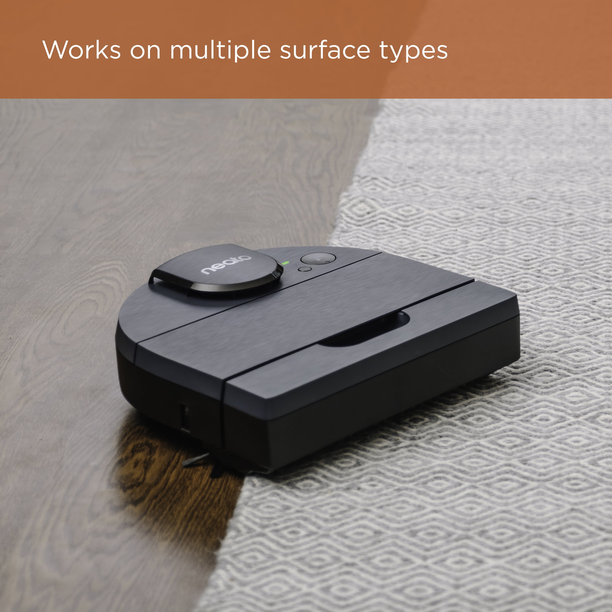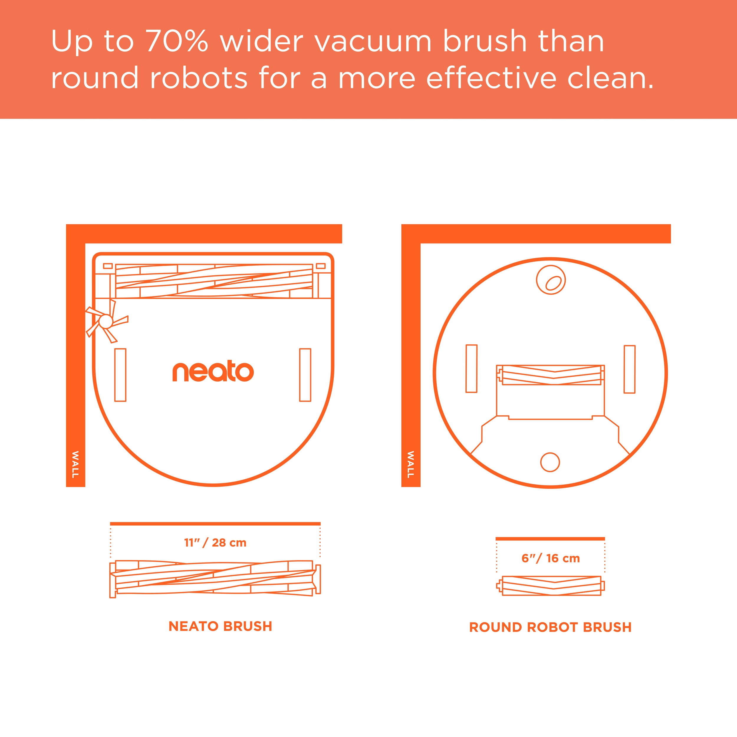 The Neato D8 has 100 minutes of runtime and can cover up to 750 square feet on a single charge, but if your robot needs more time, it it can also auto-recharge and resume to finish the job. Neato works smarter so your floors get cleaned faster. Neato’s D-shape design reaches dirt where round robots can’t—in corners and along walls with its LaserSmart LIDAR technology, the same technology used in self-driving vehicles, to map and navigate your home with precision, leaving your carpets with those satisfying straight vacuum lines. Clean with a Spiral Combo Brush that’s up to 70% bigger than those round robots. It’s effective on any surface—hardwood, carpet, or tile—so it’s great for any home. Neato’s large dirt bin at 0.7 liters means less frequent emptying Control your robot remotely through the MyNeato app. Schedule cleaning with Routines and create virtual No-Go Zones to define areas you want your robot to avoid. For those extra tough areas, just shift into Turbo mode for a deep, thorough clean with extra pickup. It increases suction and speeds up the Spiral Combo Brush, getting into every last crack and crevice—Neato D8 offers 20% greater dirt pickup than D3 & D5 (tested in internal labs). The high-performance filter is designed to trap the stuff that makes us sneeze and itch, capturing up to 99% of allergens. Product software features may be added and/or subject to change in the course of continuous product improvement. Certain features shown may not be available at time of purchase and will be delivered directly to your app and/or robot when available.
