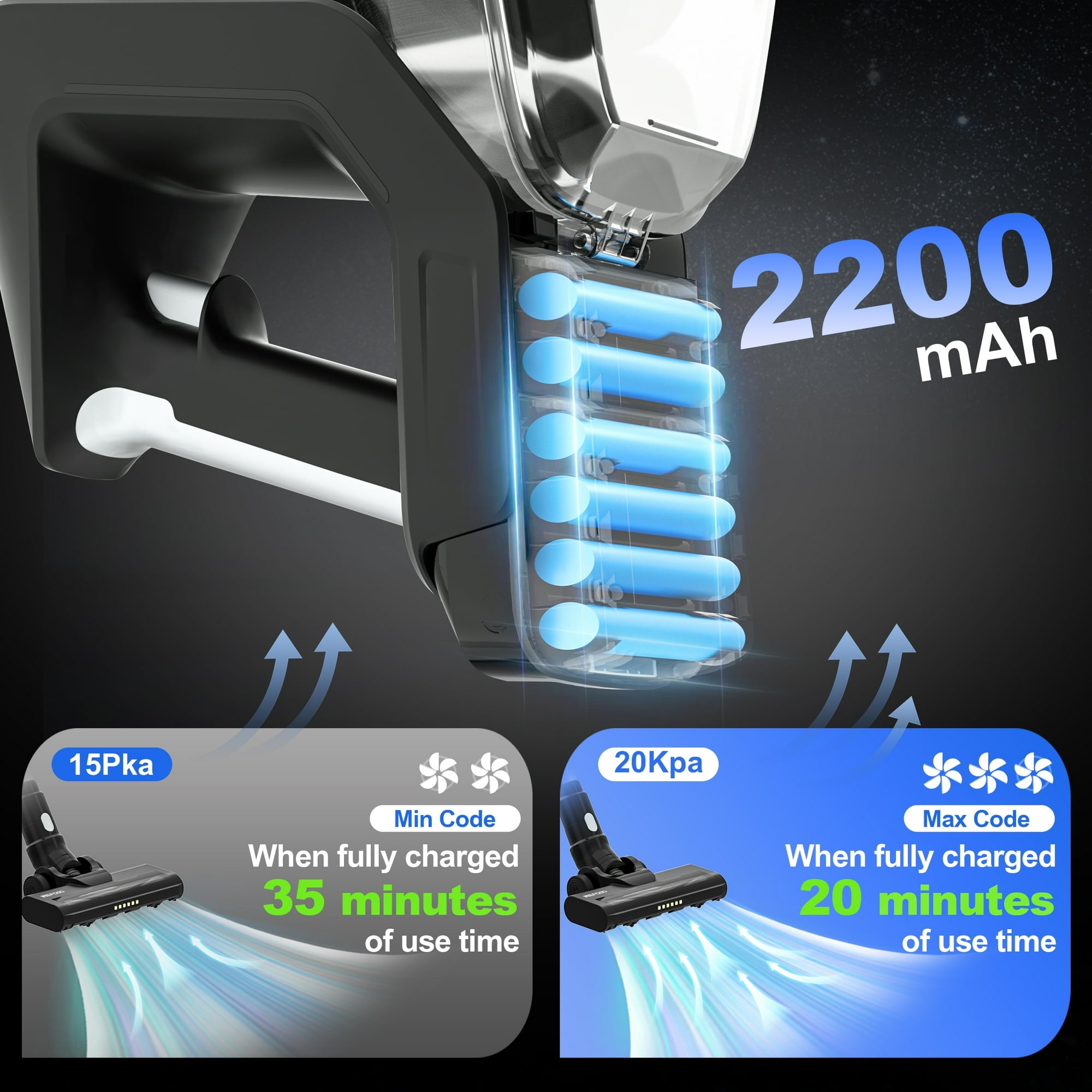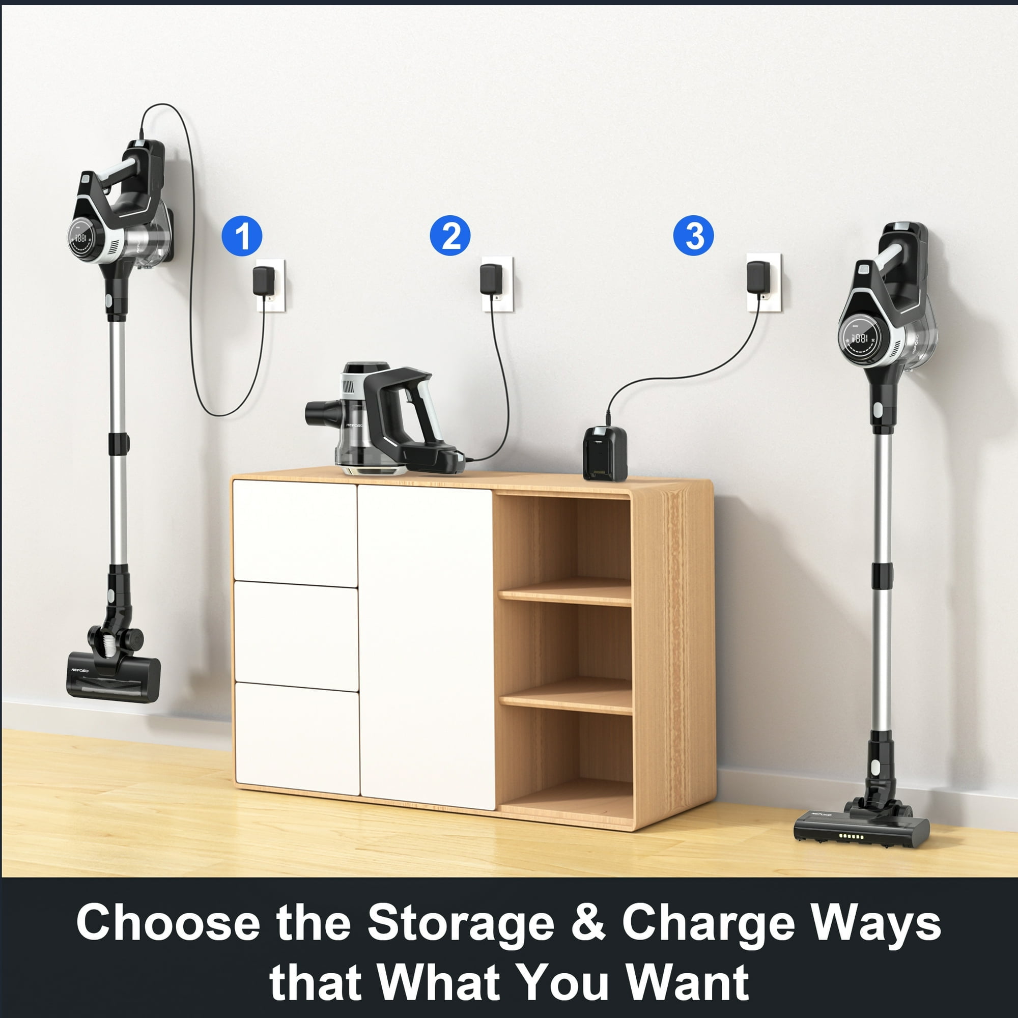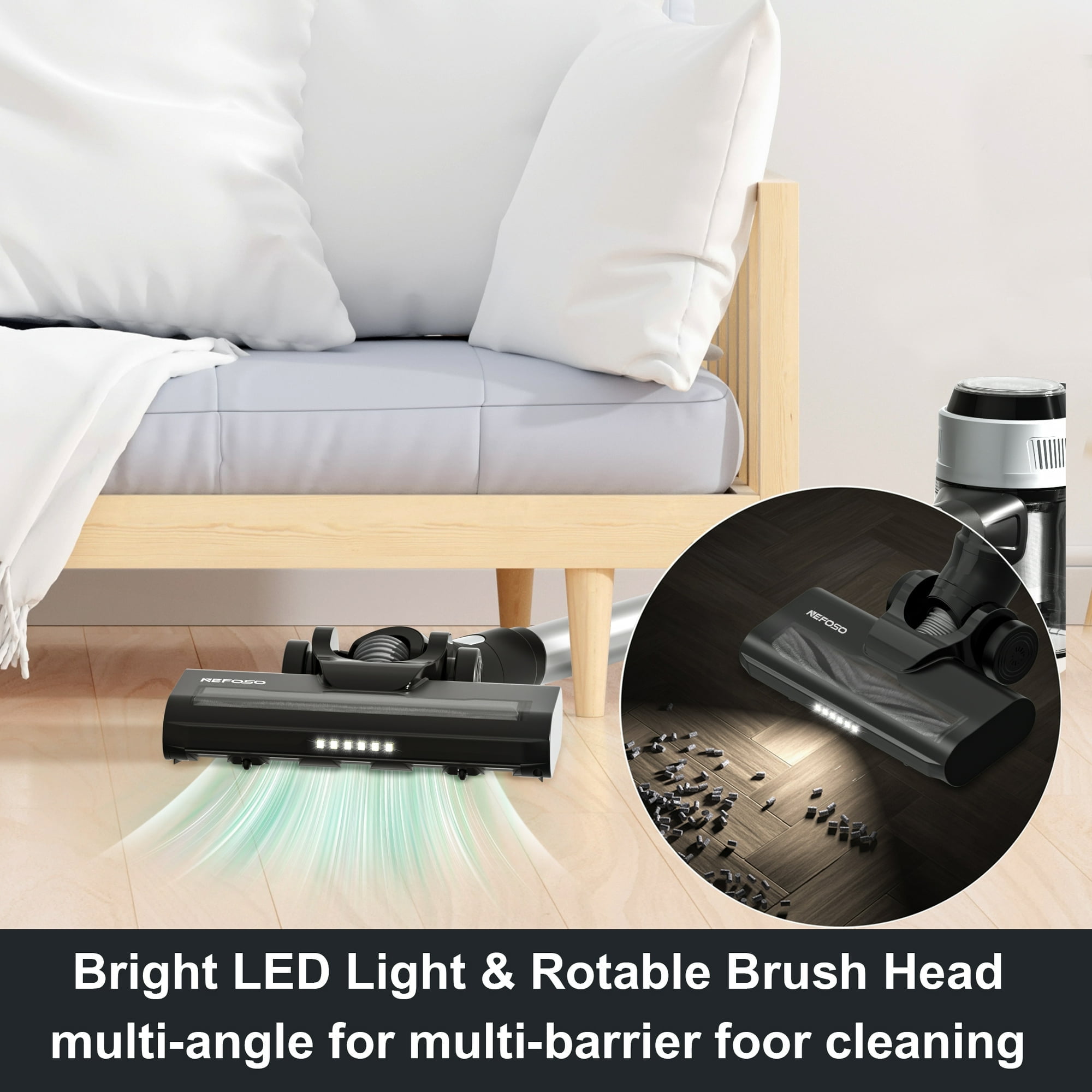 Nefoso cordless vacuum cleaner has a powerful 15-20kPa suction power, equipped with a 130W high-efficiency motor and a 2200mAh large-capacity rechargeable battery. It deeply and thoroughly clean carpet, debris on various surfaces, various floor, pet hair, bringing an easy cleaning experience. The lightweight vacuum cleaner is equipped with a smart LED display, allowing you to monitor the status of the stick vacuum cleaner at any time. The cordless stick vacuum cleaner also provides a long runtime of 20-35 minutes (fully charged), charges quickly and maintains full power, and continuously cleans from start to finish. With a versatile rotating electric brush head, 6 LED floor lights, 2 in 1 crevice heads and 1.2L dustbin, you can keep every surface in your home fresh and spotless. The vacuum cleaners for home equipped with a wall mount, it takes up less space and is very convenient to store or use.