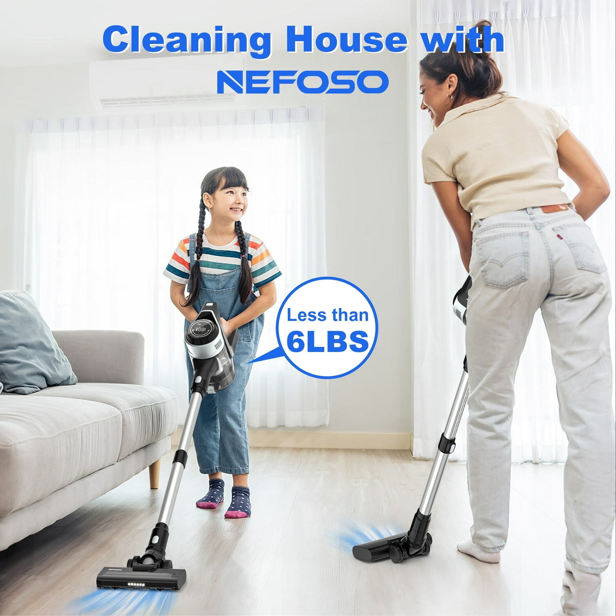 Up to 20kpa Suction:Nefoso cordless vacuum cleaner supports powerful power and can provide up to 20kpa strong suction in Max mode, which can immediately suck up pet hair, fine dust, debris, large particles in carpets, hardwood floors, tile floors and marble floors. Reduce 99.99% of pollution. Smart LED Display:This stick vacuum cleaner has a sensitive, user-friendly touch sensor system for easy monitoring. The smart display shows real-time battery power and suction level. It is also equipped with a unique anti-tangle reminder. when tangled, you can use our free anti-tangle brush to deal with it, reducing the trouble of daily maintenance. Long Running Time:The vacuum cleaner for home equipped with a large capacity 2200mAh removable battery and provides longer working time. 35 minutes at 30kPa in MAX mode (when fully charged) and 20 minutes at 15kPa in standard mode. Additionally, adopting the removable 6-cell lithium-ion battery, the charging time is shortened to 4 hours, and improve efficiency for home cleaning. Flexible LED Floor Brush Head:Cordless vacuum cleaner flexible floor brush can be rotated 150° left and right and 90° up and down, easy to clean the bottom and dead corners of the furniture without moving the furniture. The floor brush has 6 LED lights, it can light up every dark angle that needs to be cleaned, leaving no hidden dust untouched. Large Dust Cup & Easy to Use:1.2L dust cup meets multiple cleaning without frequent emptying, one button to empty the dust cup is convenient and fast. Cordless and lightweight design of the vacuum cleaner can be used anytime and anywhere. Equipped with a wall mount, it takes up less space and is very convenient to store or use. Multi-purpose:Different accessory combination modes can meet different needs. With a weight of less than 6LBS, it is no weight burden even for teenagers. It is less noisy (70db), so you can use it without worries even if there are elderly, children, and pets at home. How to deal with a clogged cleaning brush!!! 1. Disconnect the vacuum cleaner from the charger and wait for it to cool down before looking for the blockage. 2. If the vacuum cleaner roller brush is tangled or the air duct is clogged, the vacuum cleaner will automatically stop working. Please follow the instructions to find the blockage. 3. Remove the floor brush as instructed, check the telescopic tube, brush head, 2-in-1 crevice tool nozzle or roller brush for blockage, and remove the filter in the dust cup as instructed. Clear the blockage and rinse if necessary. 4. After cleaning, all parts must be thoroughly dried and reinstalled for next use.