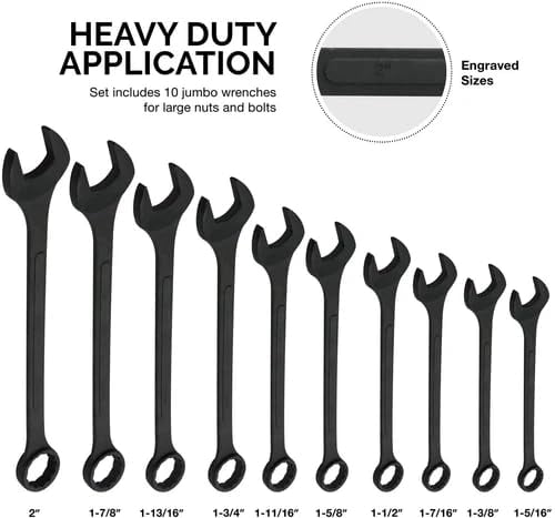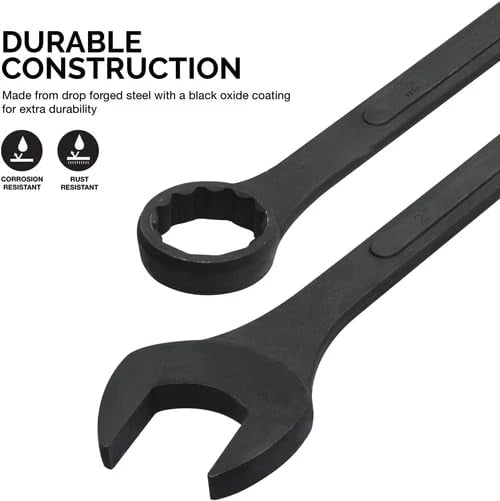 COMBINATION WRENCH SET: This jumbo wrench set includes 10 combination open-end and 12-point wrenches to loosen and tighten nuts and bolts up to 2 inches. The size is ideal for large trucks and vehicles, so it’s a great addition to any toolset. STEEL WRENCH: This large wrench set is made of extremely strong, drop-forged and heat-treated steel. The black oxide finish promotes longevity and durability in your tool collection whether at home or in the garage. COMBINATION WRENCHES: Each open-ended grip can hold tightly onto fasteners. The 12-point end is able to reach to those tight, narrow spaces to give you leverage in the even most difficult areas. No matter what the project, these wrenches can get the job done., POUCH INCLUDED: Each wrench set is stored in a flexible canvas carrying pouch that rolls up neatly for safe storage. The organizer pouch is complete with brass grommets for easy hanging in your automotive workspace, so you’ll have easy access to your tools.