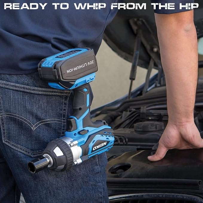 HIGH-POWERED IMPACT WRENCH: The NEIKO cordless impact wrench features a strong motor impact frequency of 0 to 3,500 bpm with a no-load speed of 0 to 3,000 rpm to constantly deliver high performance. Plus, it produces 300 ft-lb of max torque power every time. HIGH-QUALITY DESIGN: Made from a high-grade ABS shell, our torque wrench’s ergonomic body has a belt hook at the base for easy tool standby. The rubber surface handle creates a secure grip to give your hand control and keep automotive projects efficient. COMPACT WITH ADJUSTABLE TORQUE: The small size of this portable automotive wrench allows total torque power control. The variable-speed trigger and forward and reverse switch at the wrench head’s side make this tool even easier to use. BATTERY-POWERED WRENCH: Powered by a lithium-ion battery, our automotive torque wrench uses an energy indicator light to show when the battery level is at 100%, 75%, 50%, and 25%. The included fast charger will complete a full charge in 1 1/2 hours. WHAT’S INCLUDED: Our torque-wrench set includes an impact driver wrench, a rechargeable 20-volt 4.0-ampere-hour lithium-ion battery, a 2.4-ampere ETL-approved fast charger, a sturdy storage case, and 4 sockets in sizes 7/8″, 3/4″, 21 mm, and 17 mm.