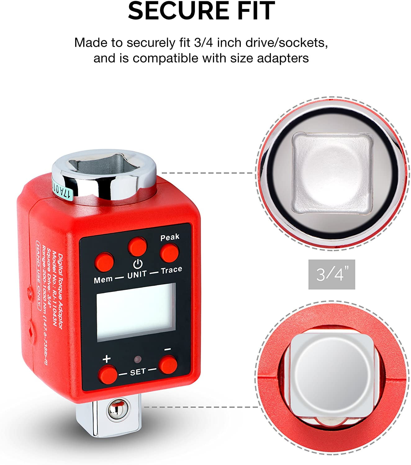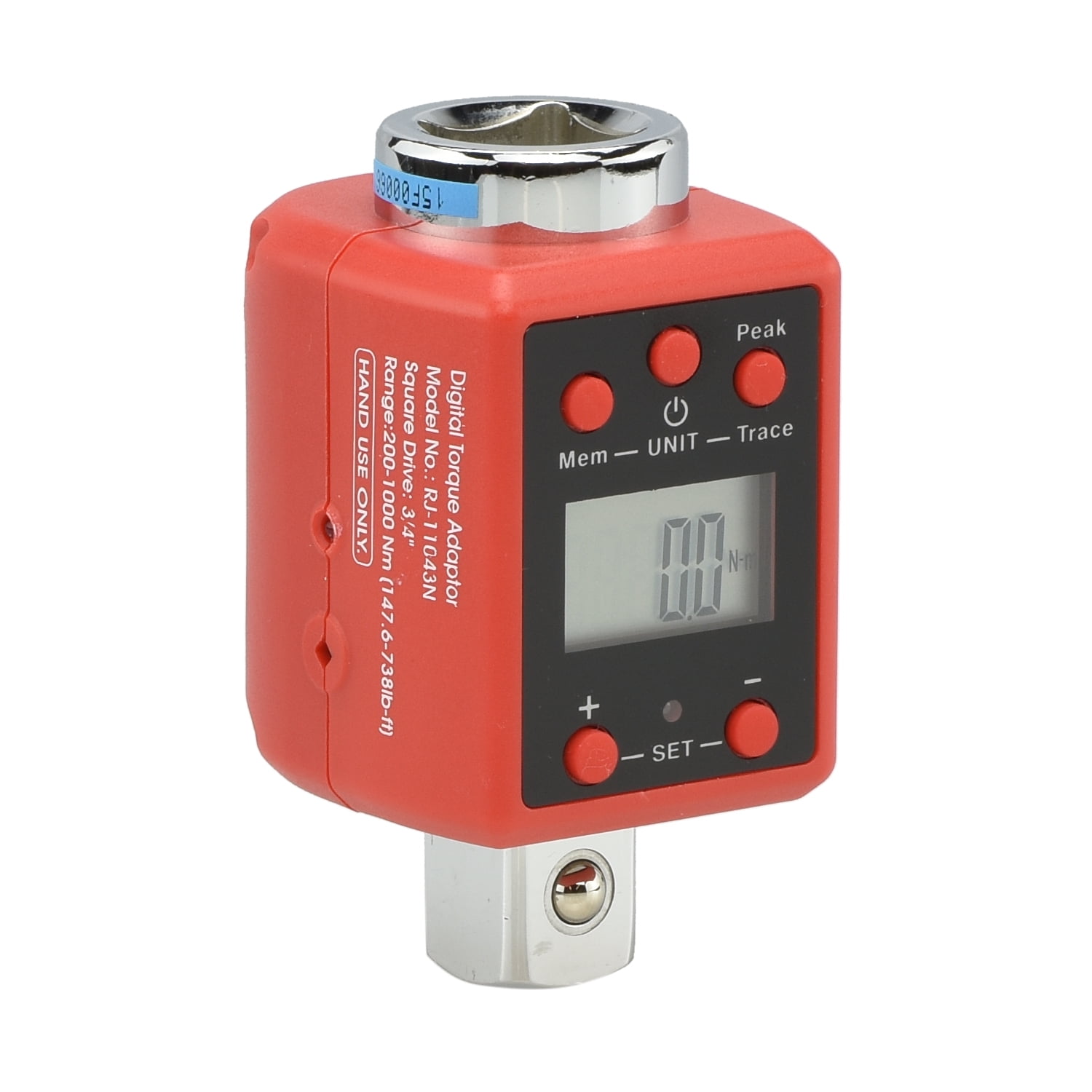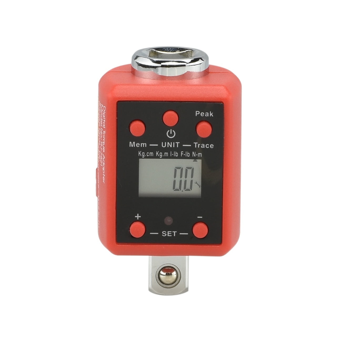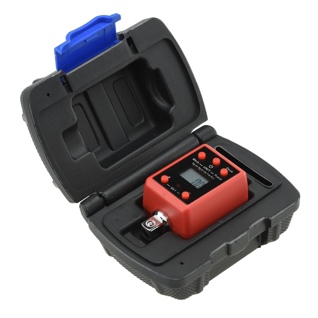 TORQUE WRENCH CONVERSION: This digital torque adapter converts any ratchet wrench into a precision torque wrench with a digital gauge and serves as an accurate calibration device for existing digital and analog torque wrenches. ADAPTER SPECIFICATIONS: Torque range: 150-750 Ft-Lb or 200-1000 N-m; Accuracy: +-2%; Memory: 50; Uses 2 AA batteries. PEAK AND TRACE MODE: This torque adapter unit provides two types of modes: a peak mode that indicates when a specific level of torque is reached and a trace mode that actively shows how much torque is being applied on the display. NOISE ALERT AT TORQUE SETTING: The audible confirmation is accompanied by a 3 LED light indicator system to give you a progressive audio notification when reaching specified torque ratings/settings and auto shuts off after 80 seconds of idle time. METRIC/SAE & BI-DIRECTIONAL: This digital adapter can calculate torque at both metric and SAE units (Ft.-Lb., N-m and kg-m) and bolsters a 3/4-inch drive with socket drive and can measure in both directions, clockwise and counter-clockwise.