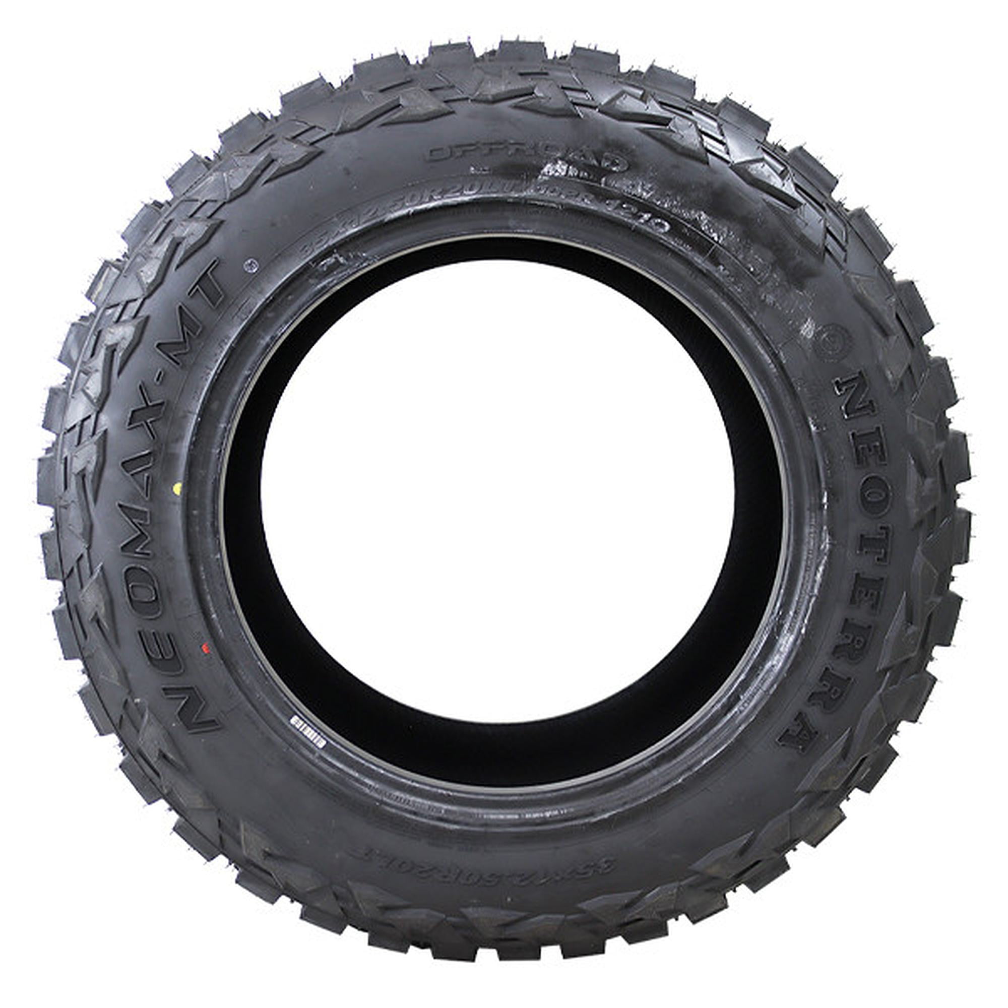 Neoterra Neomax-MT FEATURES AND BENEFITS Mud terrain traction Heavy-duty controllability Longer lasting tread life OVERVIEW The Neoterra Neomax-MT is a mud terrain, all season tire manufactured for light trucks. The tire promotes great mud-terrain traction. The aggressive tread design, with the staggered blocks and high void ratio, increase the tire’s off-road performance. The staggered and stepped blocks provide the biting edges needed to conquer soft, uneven, and loose terrain surface conditions. The traction generated by these tread elements enables the tire to upgrade its consistent forward motion. The tread design’s high void ratio and stone ejecting ribs allow the tire to enhance its self-cleaning ability. Stone retention is resisted, while mud and snow do not block the surface contact. Additionally, the tire also promoted excellent all season performance. The constant surface contact improves the tire’s handling and maneuvering. As a result, the tire is able to increase its terrain contact, which provides better steering responsiveness and driving stability. This guarantees the driver’s better control over the vehicle, promoting great handling. On the other hand, the reinforced construction makes sure the tire does not deform. The construction increases the tire’s load capacity, enabling the tire’s heavy-duty applications. The Neomax-MT also offers a longer-lasting usability. The reinforced internal structure protects the tire from external damage, especially during the tire’s off-road performance. The stabilized tread elements protect the tire from external damage. They ensure even pressure circulation, avoiding premature and irregular wear formations. This combination significantly increases the tire’s service life. The intended purpose of Mud Terrain tire types is off-road use. They are not designed for regular highway driving. Manufacturers recommend changing tires every 10 years. As long as tires are properly stored before they are sold, the year of their manufacture will not shorten their service life.