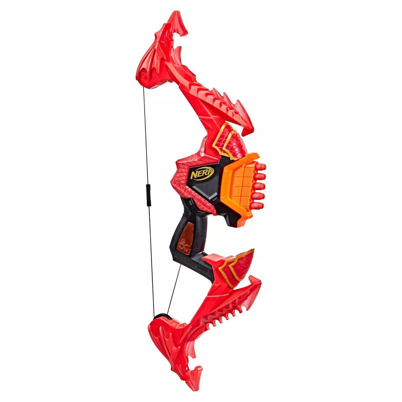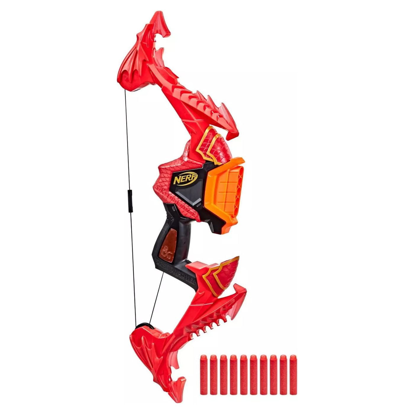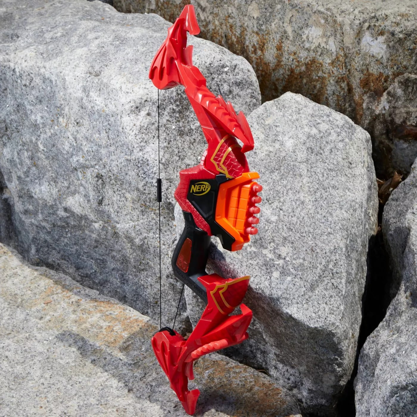 Blaze into amazing adventures with Nerf DragonPower blasters, and imagine yourself in a world where power is everything, and dragons are the most powerful beings of all! Nerf DragonPower blasters are inspired by the Dungeons and Dragons role-playing game and feature dramatic designs that capture the look of dragons. Launch into action with this bow that blazes with a fiery red color and is lavishing decorated with awesome spikes and dragon scale details. The Skyblaze bow fires Nerf foam darts and features real bow action. Load 1 dart into the bow, take aim at your opponent, then pull back the string and release it to send the dart flying through the air. It includes 10 Official Nerf Elite darts and has onboard 5-dart storage so you can reload as you play. Eyewear recommended (not included). No batteries required.