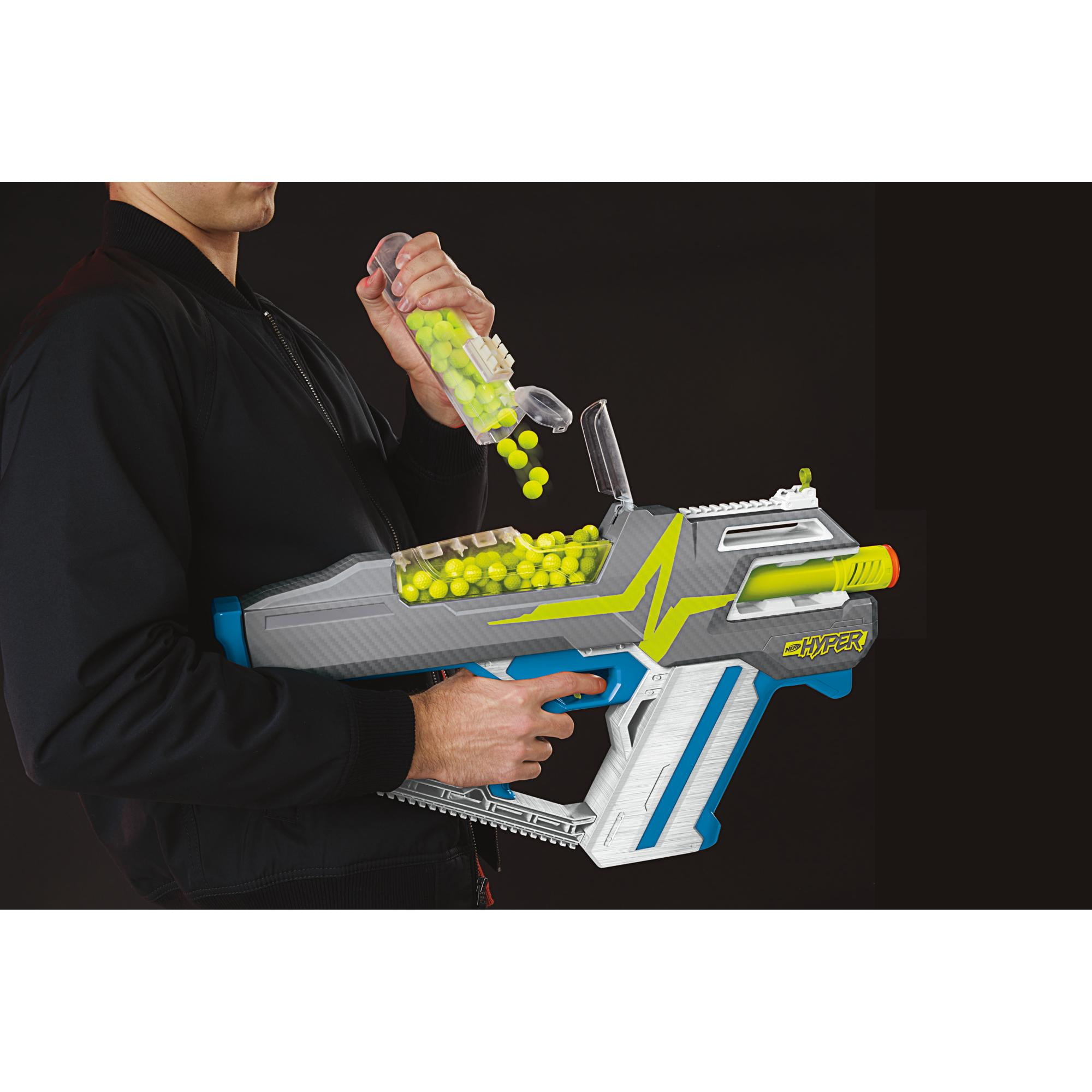 Nerf Hyper Mach-100 Fully Motorized Blaster and 80 Nerf Hyper Rounds, 110 FPS Velocity Outblast and outlast with the revolutionary Nerf Hyper system! Nerf Hyper blasters feature extreme speed and keep you blasting with massive round capacity! Engineered for velocity, they fire rounds at up to 110 feet per second. They include large hoppers, so you spend more time playing and less time reloading. The rounds maximize speed and capacity with their innovative design and material. Round reload canisters attach to tactical rails for fast, easy reloads. Blasters and canisters each sold separately. The fully motorized Nerf Hyper Mach-100 blaster includes 80 Nerf Hyper rounds and has large hopper with 100-round capacity. Power up the motor and unleash a hailstorm of rounds! Attach reload canisters to the 2 tactical rails to keep backup firepower in reach. Includes trigger lock. Requires batteries. Eyewear recommended. (Batteries and eyewear not included. Canisters and additional rounds sold separately.) Nerf and all related properties are trademarks of Hasbro. Includes: blaster, 80 rounds, and instructions. Ages 14 and up TO AVOID EYE INJURY: WARNING: Do not aim at eyes or face. Use of eyewear recommended for players and people within range. Use only official Hyper rounds. Other rounds may not be safe. Do not modify rounds or blaster. Requires 6x 1.5v D alkaline batteries (not included).
