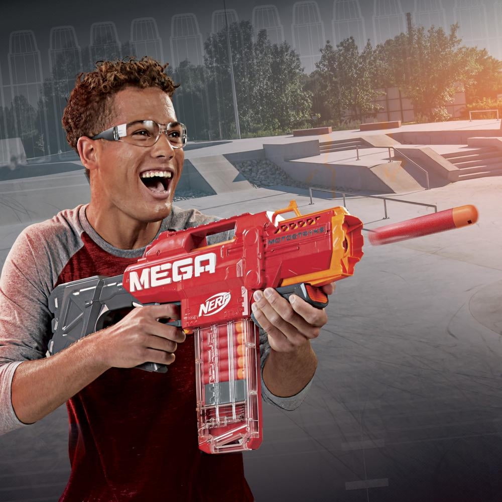 Intimidating? Definitely. Impressive? Absolutely! Huge, powerful, and fast, the Nerf Mega Motostryke blaster blisters the battlefield with motorized, 10-dart blasting. This is a blaster that demands attention — and gets it. Power up the motor and pull the trigger to send a big Nerf Mega dart whistling through the air. It has a 10-dart removable clip and comes with 10 Official Nerf Mega darts, so you can fire 10 darts in a row before it’s time to reload. So what are you waiting for? Start blasting! Load darts into the clip, and insert the full clip into the blaster. Hold down the acceleration button to rev the motor, and pull the trigger to fire 1 dart. Pull the trigger again to fire another dart. Strike big and strike fast with the Nerf Mega Motostryke blaster! Batteries required (not included). Eyewear recommended (not included).Nerf and all related propertiesare trademarks of Hasbro.MOTORIZED 10-DART BLASTING: Power up the motor and fire 10 Nerf Mega darts fast with motorized blasting from the clip-fed Nerf Mega Motostryke blasterBIG IN POWER, BIG IN SIZE: This big Nerf Mega blaster has the size and the power to overwhelm competitors with motorized, multi-dart, mega-sized blasting10 NERF MEGA DARTS AND 10-DART CLIP: Comes with a 10-dart removable clip and 10 big Official Nerf Mega darts that make a whistling sound as they fly through the air•