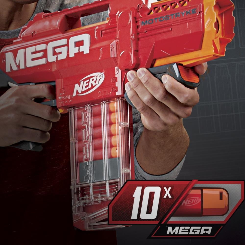 MOTORIZED 10-DART BLASTING: Power up the motor and fire 10 Nerf Mega darts fast with motorized blasting from the clip-fed Nerf Mega Motostryke blaster BIG IN POWER, BIG IN SIZE: This big Nerf Mega blaster has the size and the power to overwhelm competitors with motorized, multi-dart, mega-sized blasting 10 NERF MEGA DARTS AND 10-DART CLIP: Comes with a 10-dart removable clip and 10 big Official Nerf Mega darts that make a whistling sound as they fly through the air