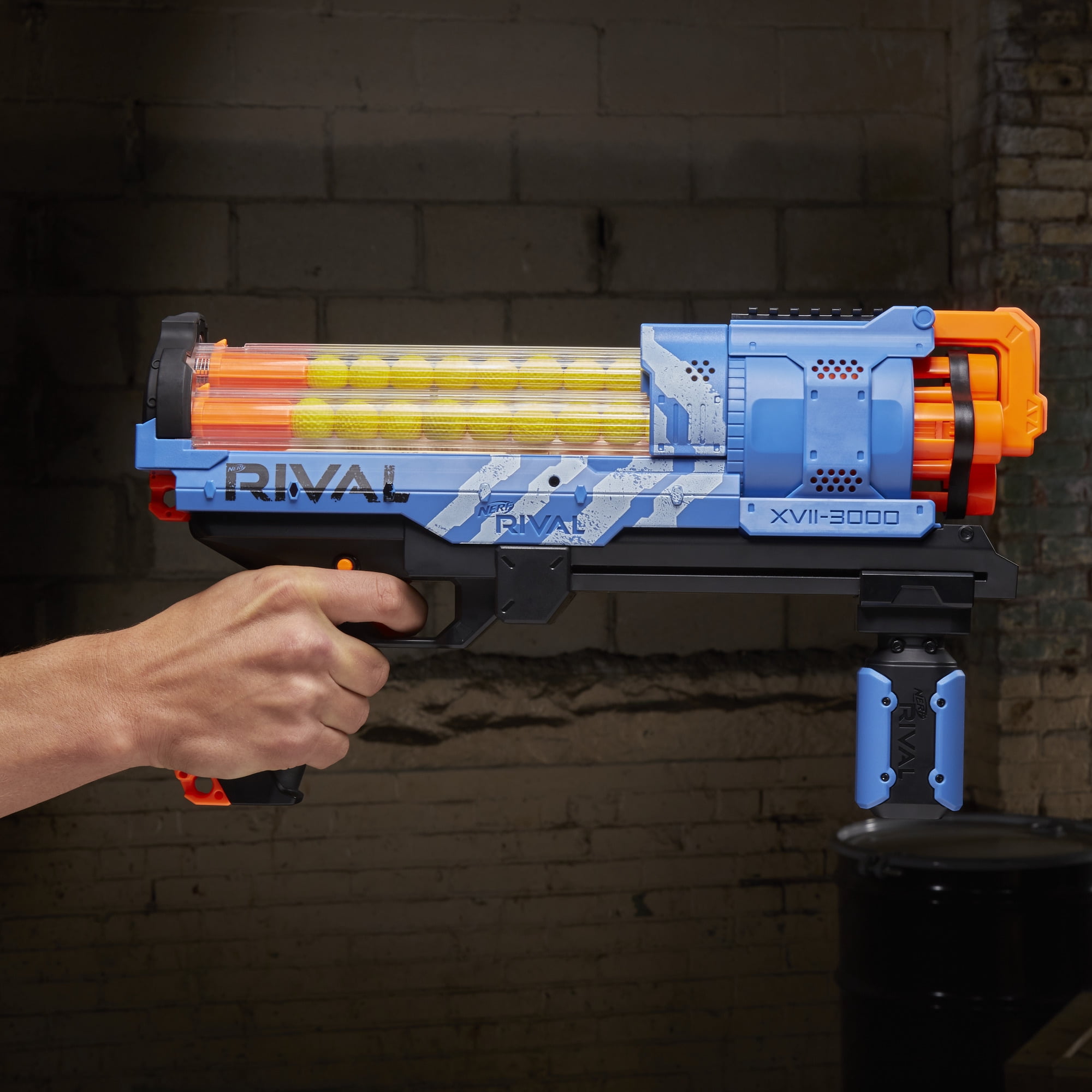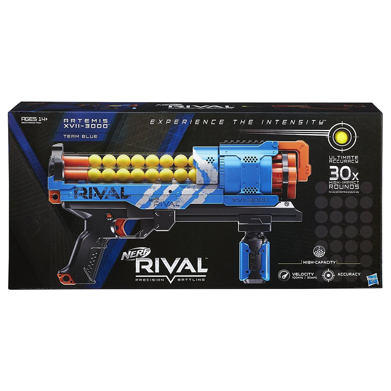 Load and Fire:The high-capacity Artemis XVII-3000 blaster holds 30 high-impact rounds and fires them at a velocity of 100 feet per second (30 meters per second). The integrated, easy-load magazine lets battlers get ready for action fast — slide the magazine cover back, load the rounds, and slide the magazine closed! Launch each round with calculated targeting, or inundate opponents by unleashing all 30 rounds rapidly with slam-fire action. The Artemis XVII-3000 blaster has a rotating barrel, trigger lock, and tactical rail. Experience the intensity of the Nerf Rival Artemis XVII-3000 blaster! Precision Battling:Experience the excitement of precision battling with the high-capacity Nerf Rival Artemis XVII-3000 blaster. Go into battle as Team Blue and unleash high-impact rounds at a velocity of 100 fps (30 mps). The action is intense with the Nerf Rival Artemis XVII-3000 blaster! Nerf and all related properties are trademarks of Hasbro.Includes blaster, 30 rounds, and instructions. Ages 14 and up. For use with Nerf Rival products only.