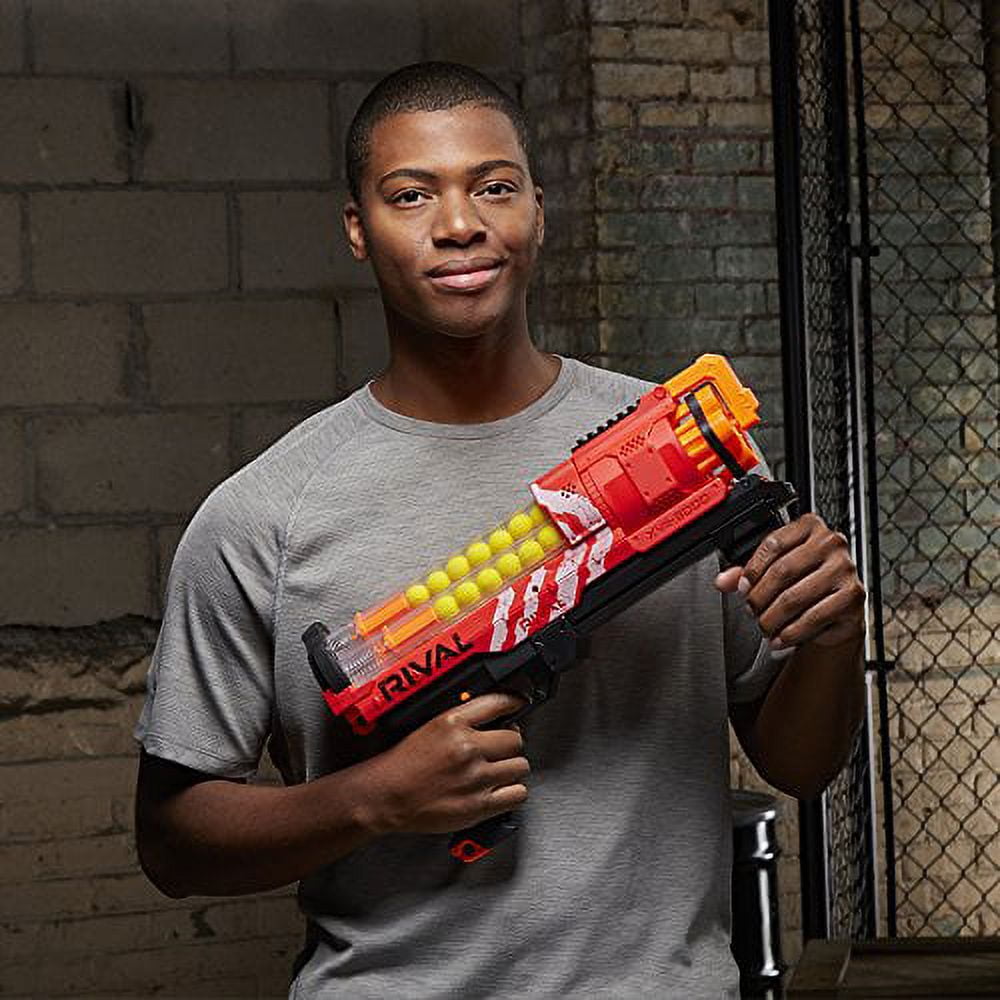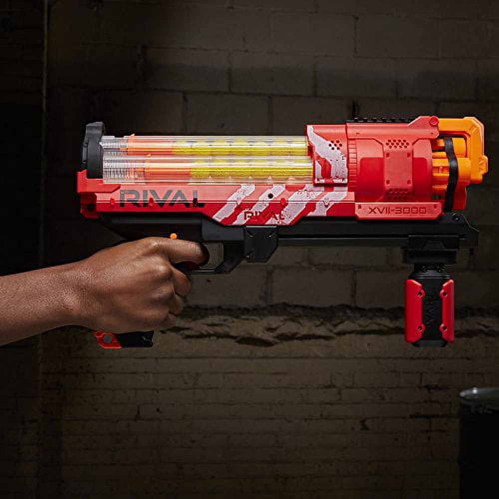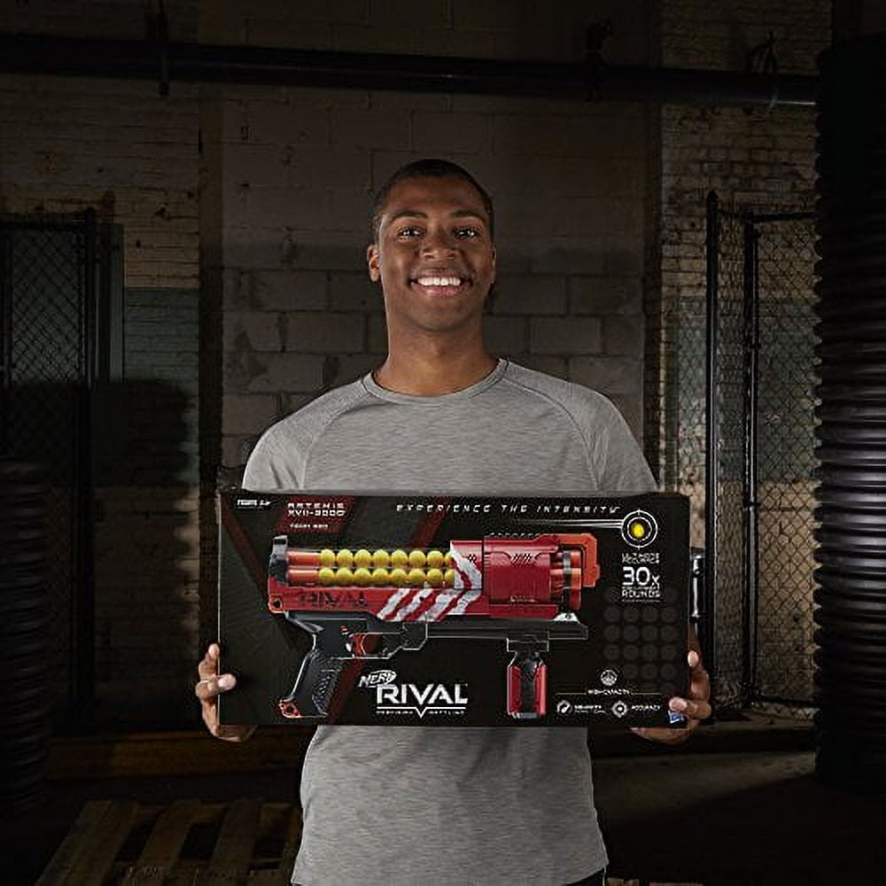Experience head-to-head competition with the precision and power of the Nerf Rival Artemis XVII-3000 blaster! Choose a blaster color and go into battle as the Red Team or the Blue Team. The high-capacity Artemis XVII-3000 blaster holds 30 high-impact rounds and fires them at a velocity of 100 feet per second (30 meters per second). Get ready for battle fast with the easy-load integrated magazine. Launch each round with calculated targeting, or inundate opponents by unleashing all 30 rounds rapidly with slam-fire action. The Artemis XVII-3000 blaster has a rotating barrel, trigger lock, and tactical rail. Experience the intensity of the Nerf Rival Artemis XVII-3000 blaster! Nerf Rival and all related properties are trademarks of Hasbro.