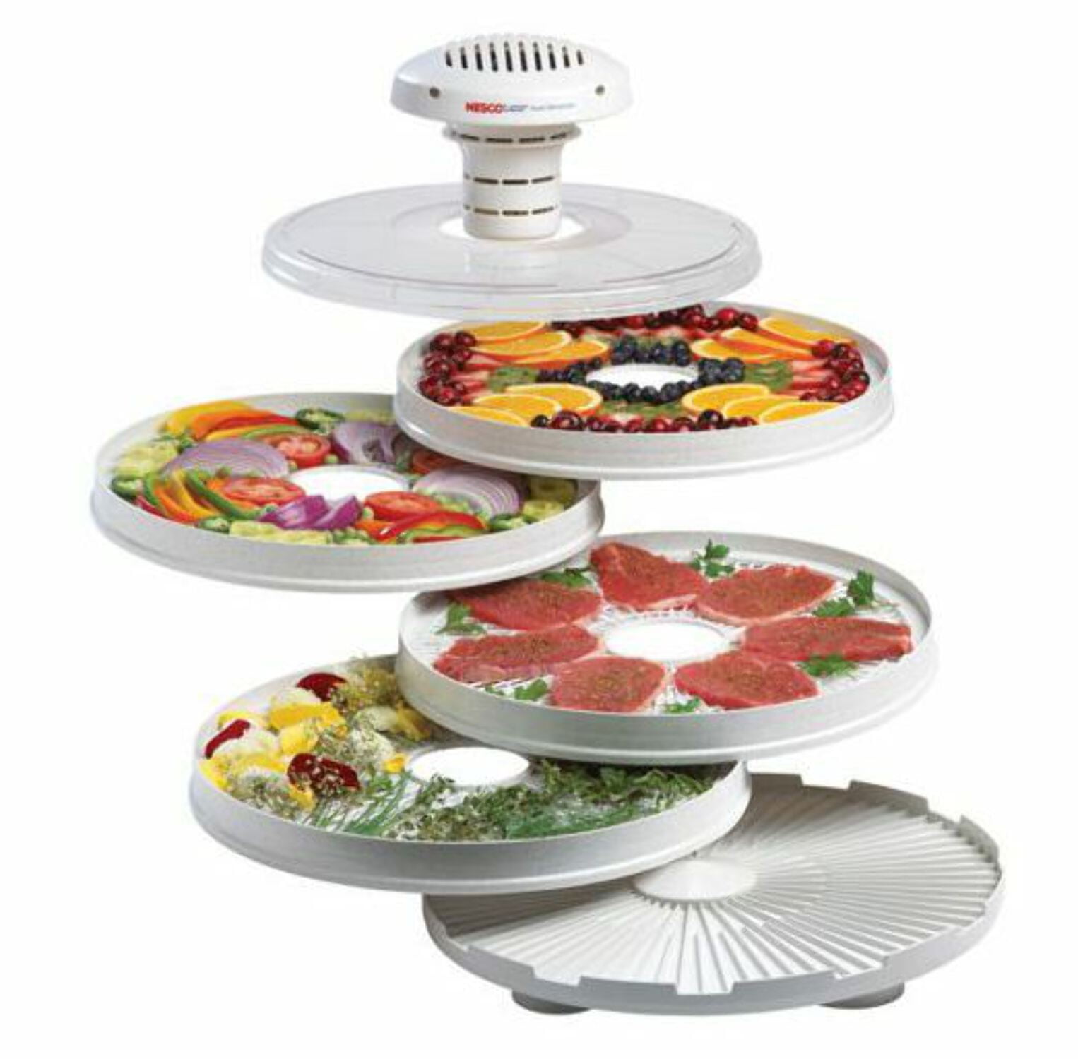 This unit features Nesco/American Harvest’s innovative Top Mounted Powerhead that dries food quickly and evenly with superior results. Detaches to make dehydrator dishwasher safe for easy clean up. Fan-Flow Technology means faster, more even drying with no tray rotation necessary. Make great tasting beef jerky or venison jerky. General Information Manufacturer: The Metal Ware Corporation Manufacturer Part Number: FD-37 Brand Name: Nesco Product Model: FD-37 Product Name: FD-37 Food Dehydrator Product Type: Food Dehydrator Miscellaneous Package Contents: FD-37 Food Dehydrator 4 x Speckled Trays Country of Origin: United States Warranty Limited Warranty: 1 Year