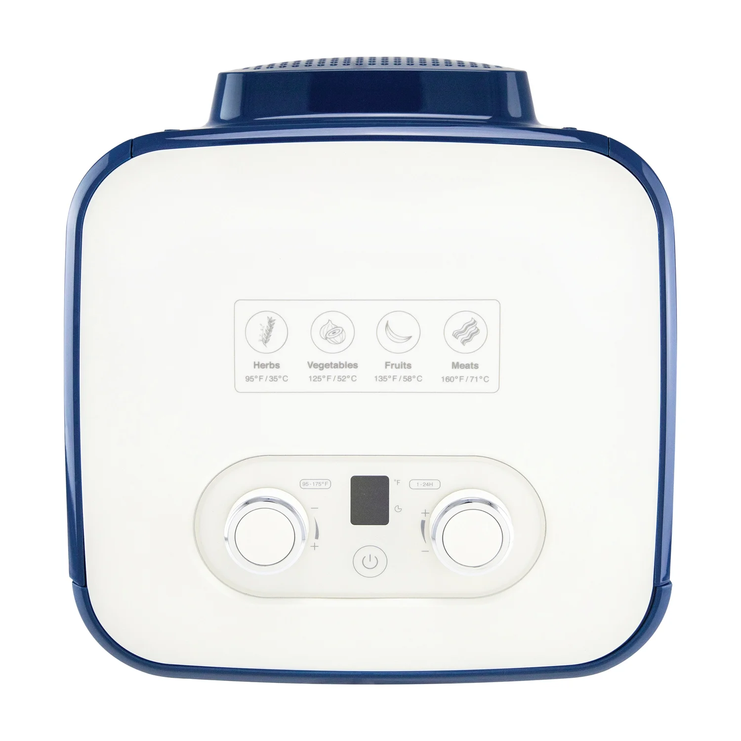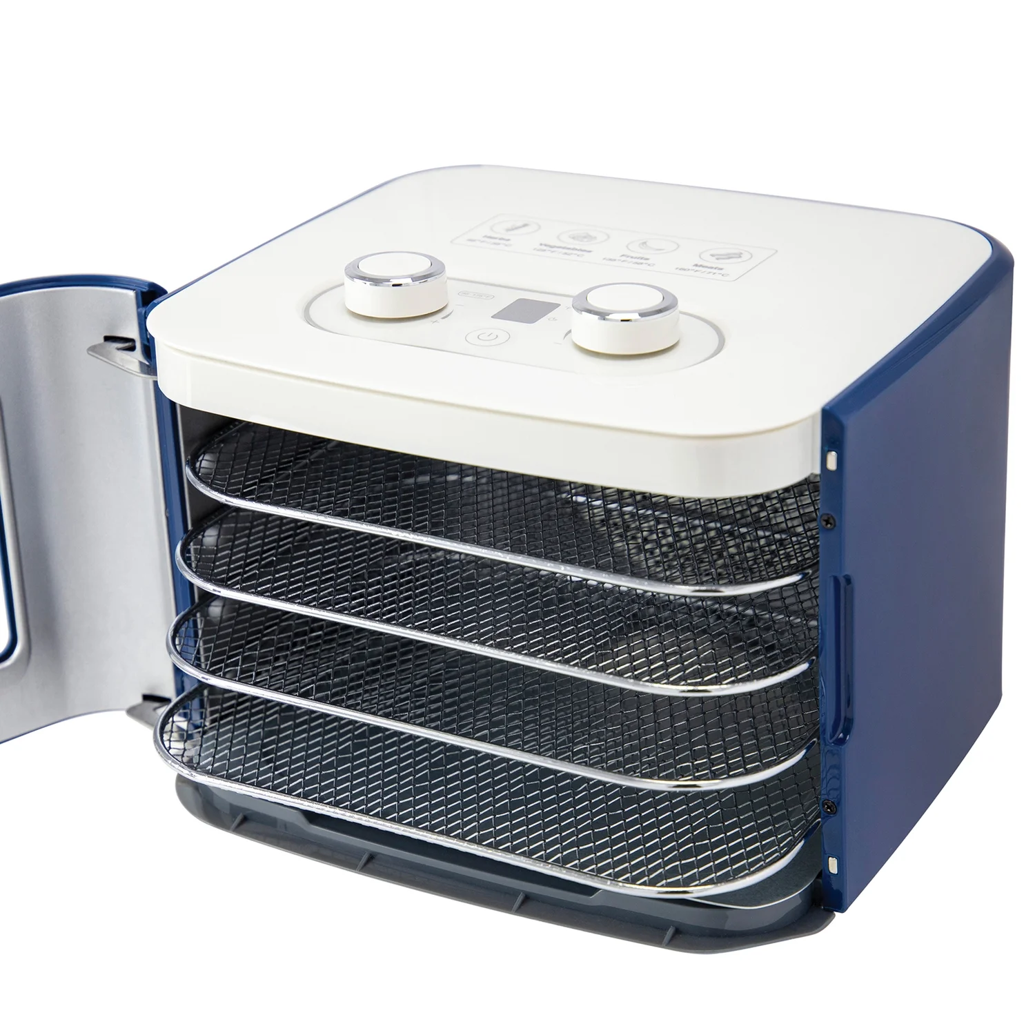 400 watts of drying power; provides even heat distribution Food dehydrator for smaller quantities; stylish and compact design Digital display with time (1 hour to 24 hours) and temperature controls (95°F to 175°F) Magnetic door closure with viewing window Easy-to-clean all-metal interior Includes 4 mesh drying trays and drip pan