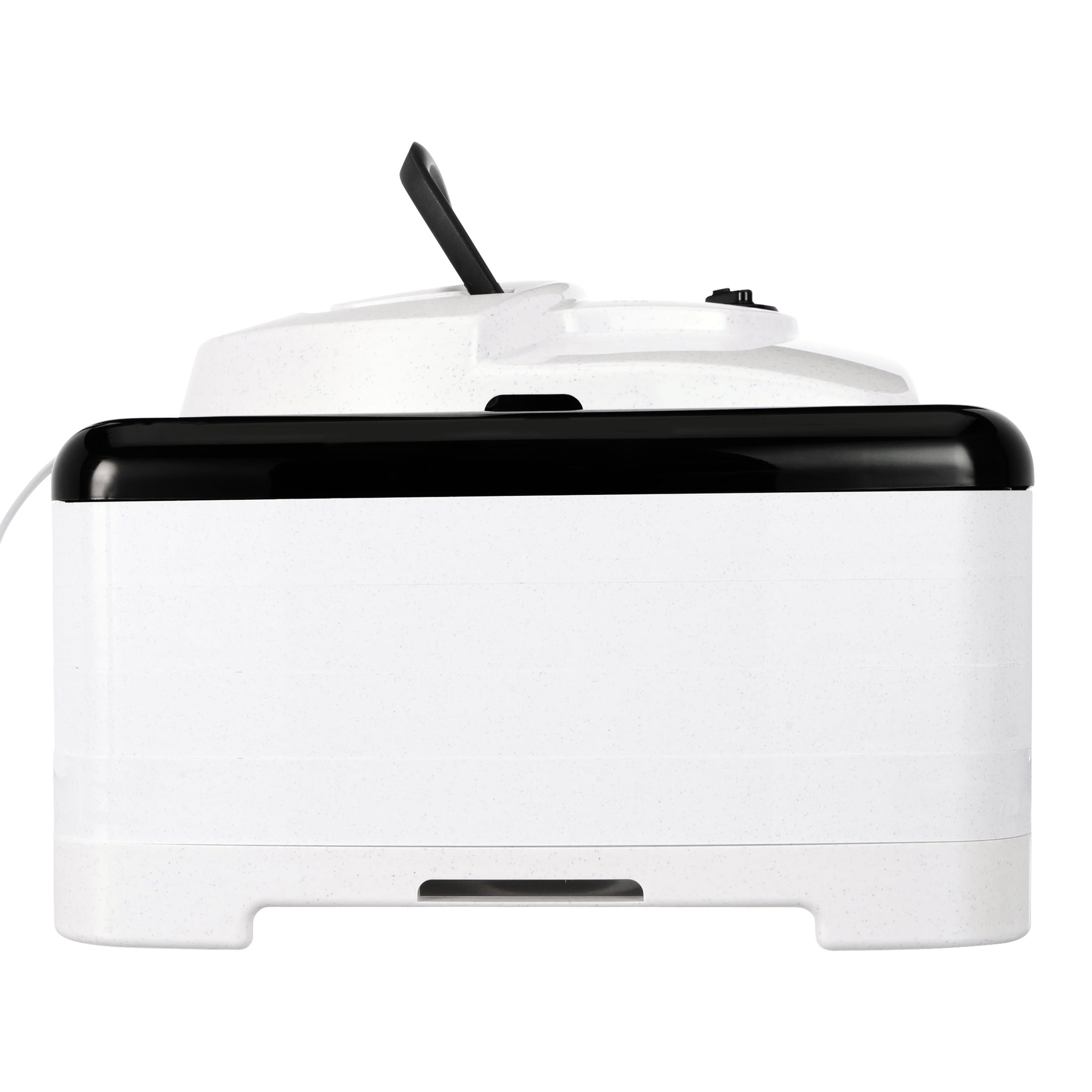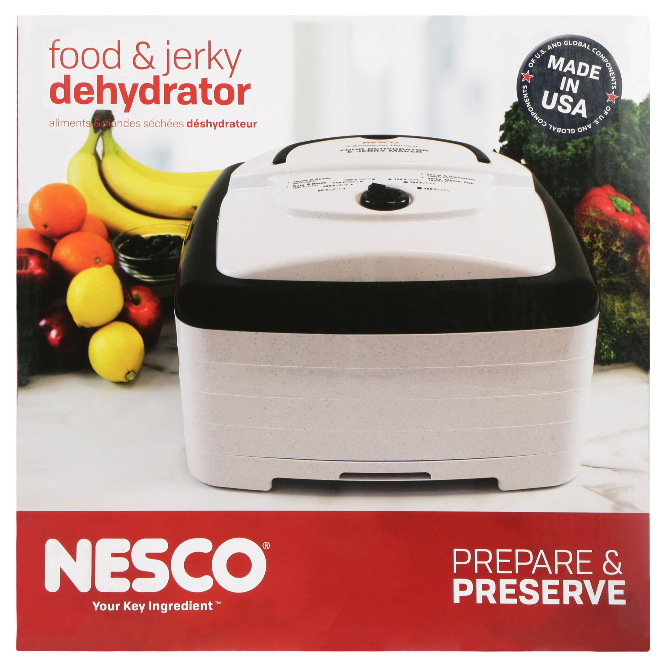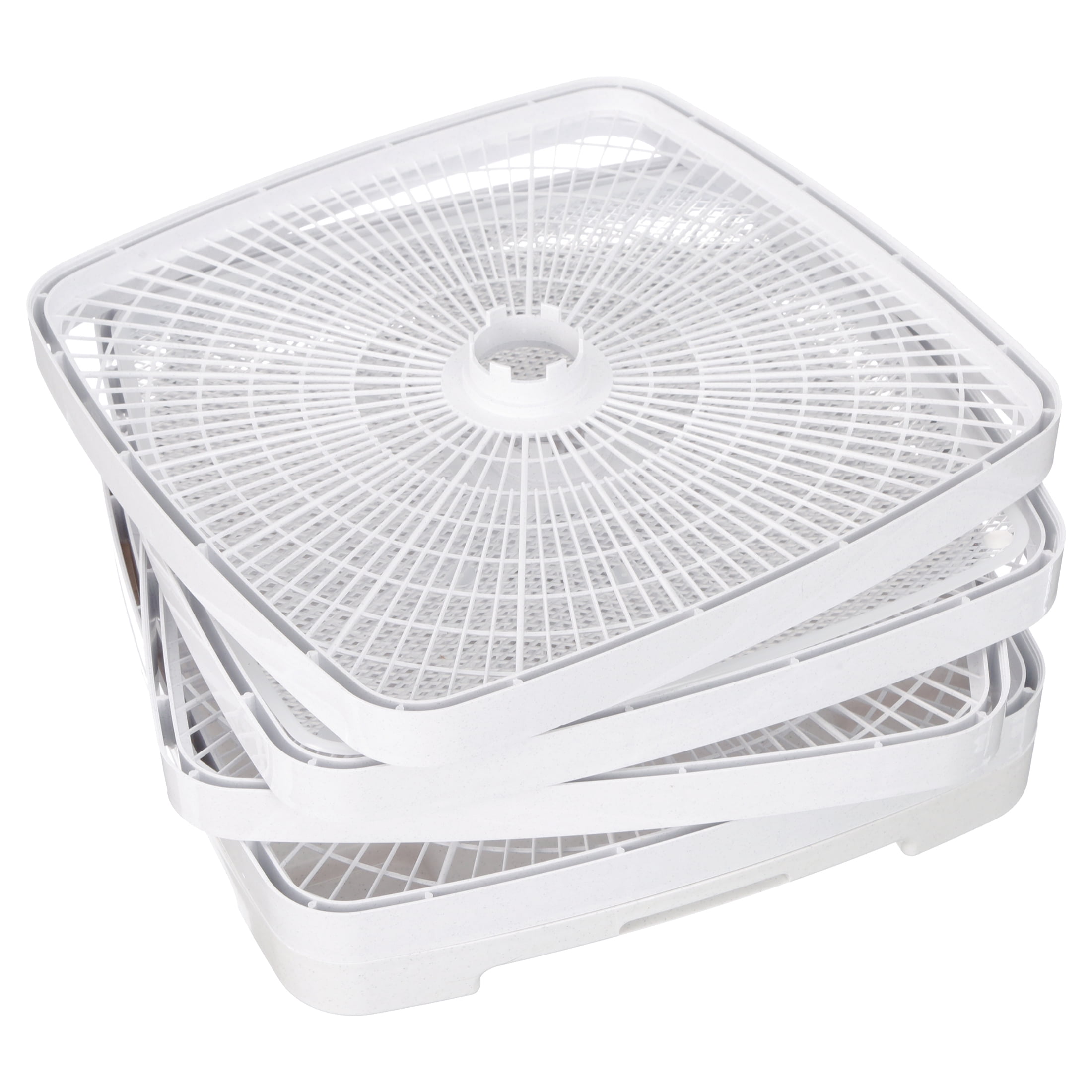 Dry fruit and vegetables, herbs and flowers, granola or strips of jerky in hours instead of days with this 700-watt food dehydrator. The unit’s patented Converga-Flow drying system forces air down the exterior pressurized chamber, then horizontally across each individual tray, converging in the center, for fast, even, and nutritious drying. Flavors don’t mix, and there’s no need to rotate the trays. It’s top-mounted fan eliminates the worry of liquids dripping into the heater chamber. A simple control knob adjusts the heat and printed guidelines on the motor housing help determine the correct thermostat setting. Other highlights include: a bale handle for removing the power head, dishwasher-safe parts, and an instruction manual for getting started. Features 120 Volt fruits, vegetables, and jerky. Patented Converga-Flow drying system forces air down the exterior pressurized chamber (not through the trays). The hot air is forced horizontally across each individual tray, converging on the core for fast, even and nutritious drying. No flavor mixing and no need to rotate trays. Mary Bell’s Complete Dehydrator Cookbook2 Original Jerky Spice with Cure Packets 2 Cracked Pepper & Garlic Jerky Spice with Cure Packets1 Clean-A-Screen Included Outside Tray Dimension 14.5 x 14.5 x 1The dehydrator measures 14.5-inch by 14.5-inch by 9-5/8-inch.