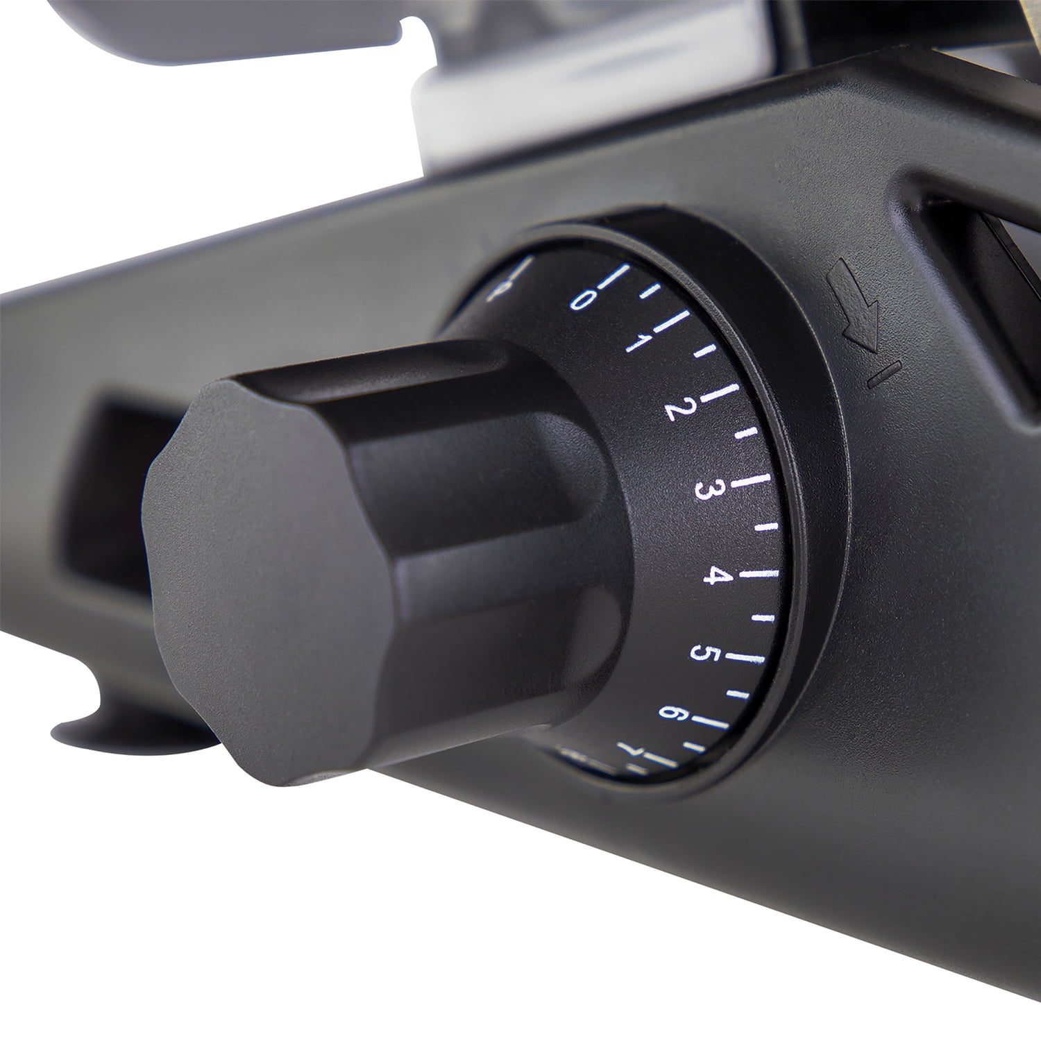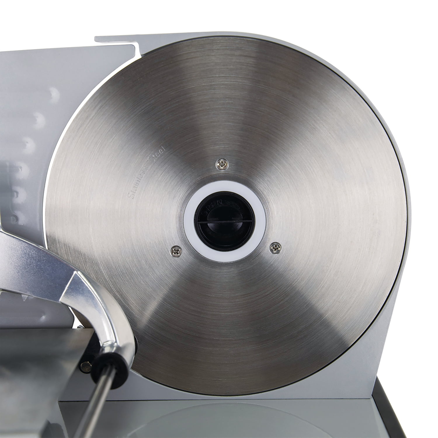 120 watts of power Die-cast aluminum housing with DC-powered motor Stainless steel food carriage with forward tilt Detachable, 8.7-in. non-serrated stainless steel blade Adjustable thickness control dial ranges from deli thin to 9/16 in. Recessed power switch Nonslip feet Quick-release feature for easy cleaning Includes support plate, slicing guard, power switch, thickness control, food carriage rod, base, release rod, locking screw, and blade