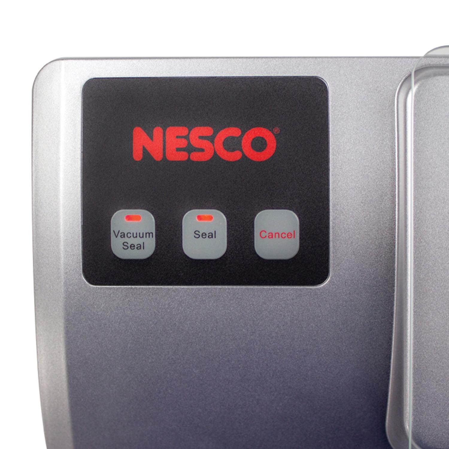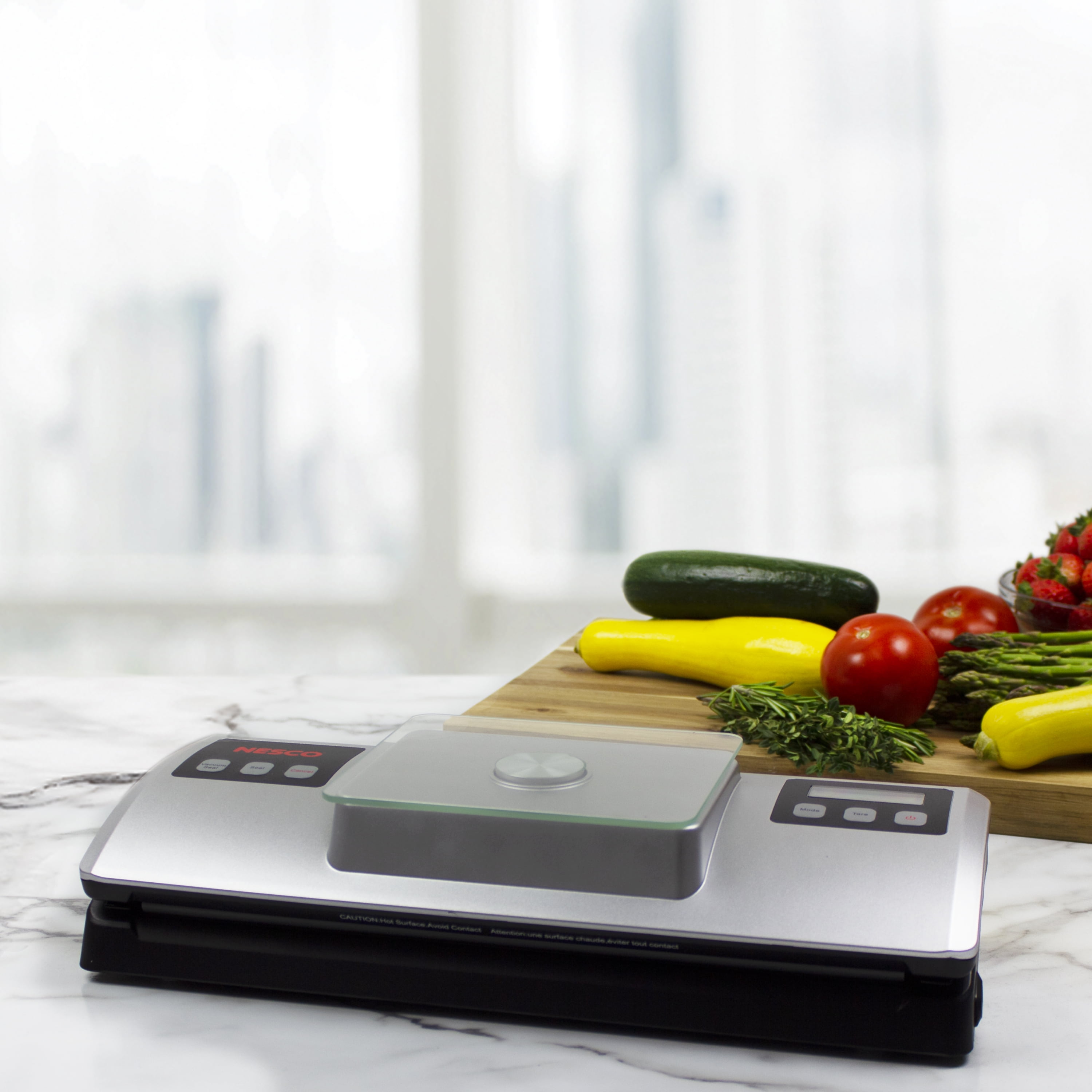The NESCO Vacuum Sealer with Digital Scale makes it easy to prep, weigh and preserve your favorite fresh foods. This double-duty appliance is compact to save kitchen counter space, and the stainless steel finish matches any décor. The easy-to-read digital scale can weigh foods from 0.01 ounces up to 11 pounds making it simple to weigh out perfect portions of meat, produce or whole grains. The smooth tempered glass scale platform is easy to clean, while the scale can be tared to account for food containers. The digital scale runs independently from the vacuum sealer and is powered by two AAA batteries (included). Multiple functions on this vacuum sealer make it easy to size it up and seal the deal. The “Seal” function produces an airtight, break-proof seal in one touch, while the “Vacuum & Seal” function makes it simple to preserve any food, perfectly every time, no matter how fragile. This vacuum sealer works with all brands of vacuum sealer bags and comes with 10 sample bags in two sizes to get you started. An integrated power cord compartment under the sealer provides convenient storage. Portion control and meal prepping is easy and convenient with the NESCO Vacuum Sealer with Digital Scale.