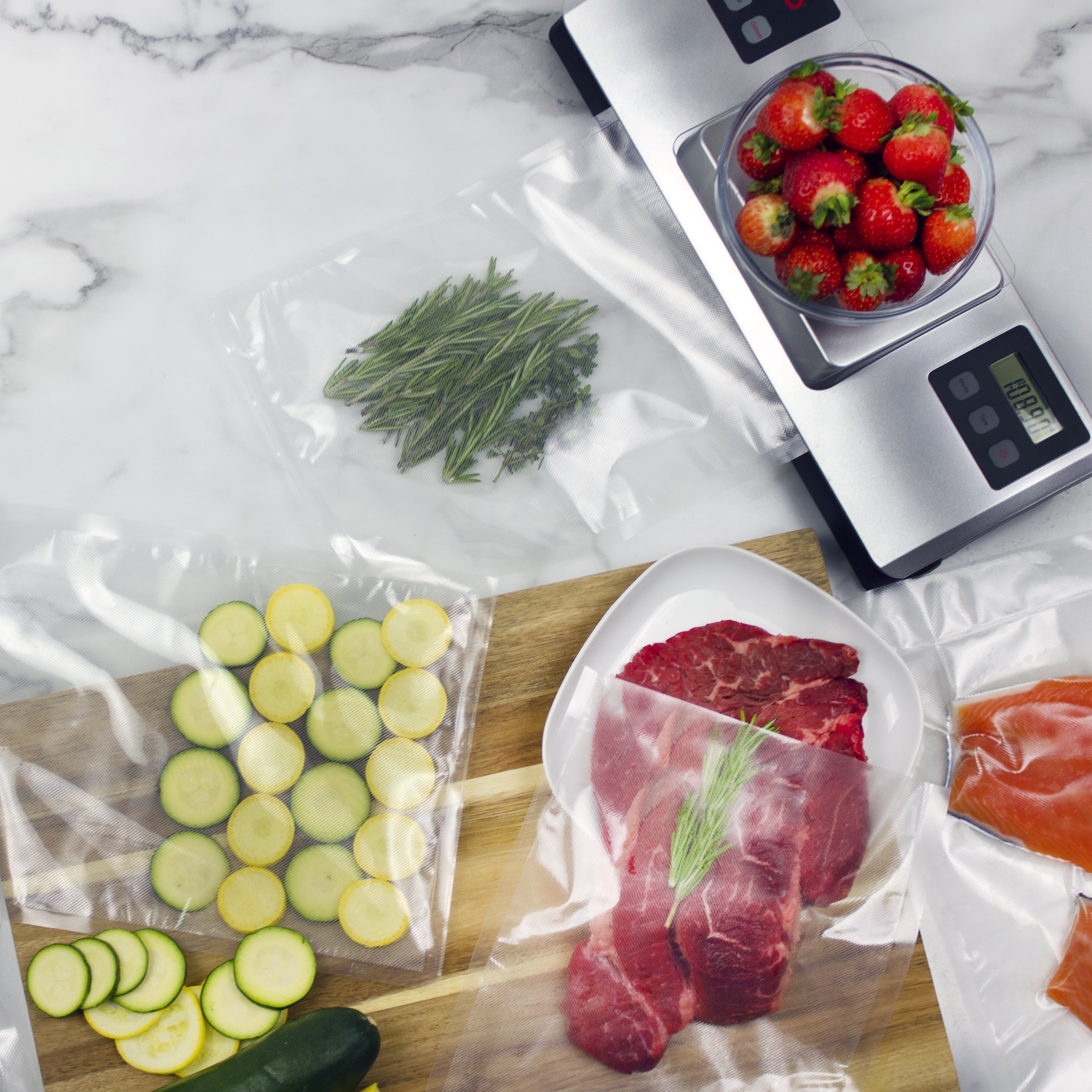 Electric vacuum sealer with built-in power cord storage Battery operated digital scale with temper glass platform (batteries included) Sealer functions include vacuum seal, seal and cancel Scale settings include pounds, ounces, grams and kilograms, Scale Weight: 0.01 oz. to 11 lbs. Includes (5) 8.6″ x 11.8″ quart-sized bags and (5) 11″ x 13.75″ gallon-sized bags