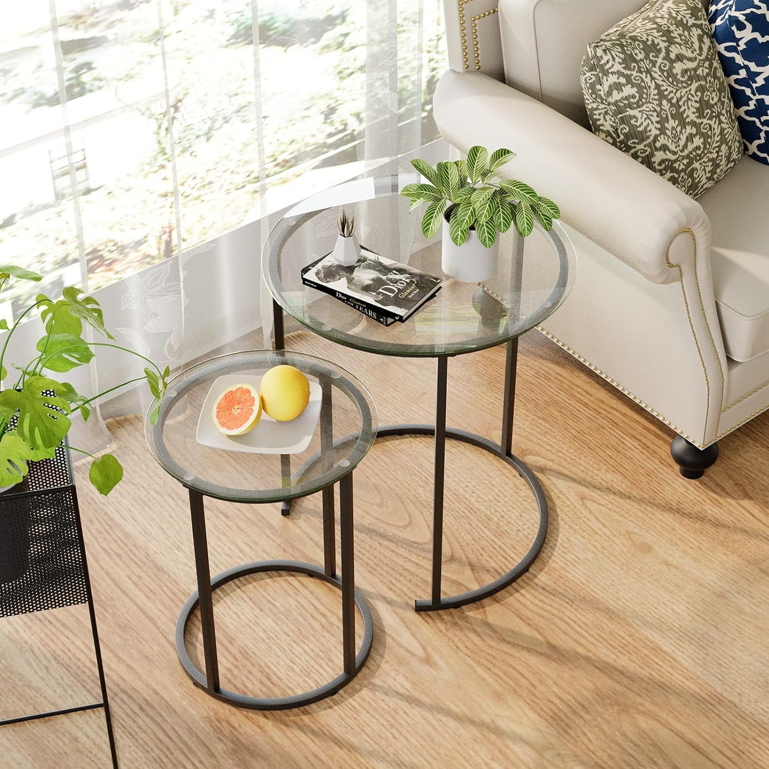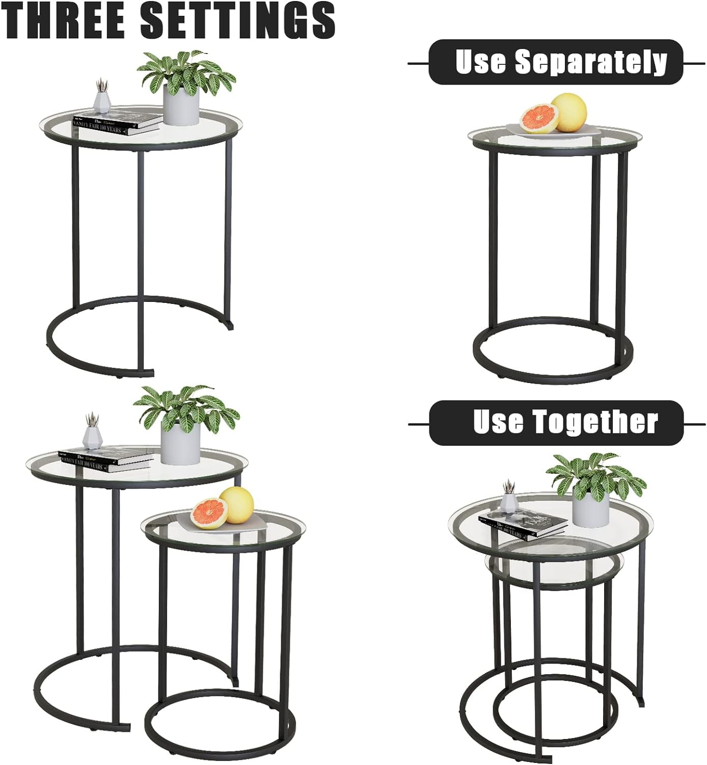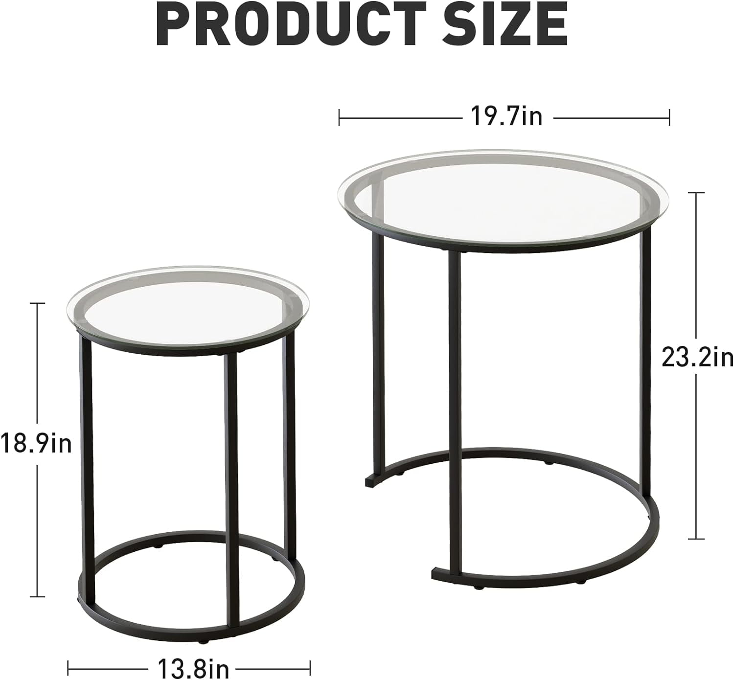 【NESTING TABLE】This modern and fashionable nesting table is composed of a large circular coffee table and a small side table. The size of this coffee table is 19.6 “Lx19.6” Dx23.6″H. The table supports a stable weight of 203 pounds, so you can rest assured to use. 【SIMPLE & ELEGANCE】This set of side table is made of high quality tempered glass,which is hard in material and has good heat resistance. The table legs have a multi-layer spray painting process, with uniform color and smooth touch, and the paint surface is not easy to fall off. 【DURABLE TEMPERED GLASS】Open storage design, beautiful appearance, take things and put things at a glance. Each layer height of the bookshelves is 10in, enough to hold books of various sizes 【MORE DETAILS】The glass tabletop is fixed with double-layer screws and strongly adsorbed by suction cups, ensuring the stability of the glass and preventing it from sliding.The foot of the table is also equipped with non-slip pads You can move the coffee table freely without damaging your floor. 【WIDELY USED】This nested table is perfect as a coffee table or side table, cocktail table, and can be placed in the living room, balcony, and dining room.You can also combine or use this coffee table separately according to your needs.