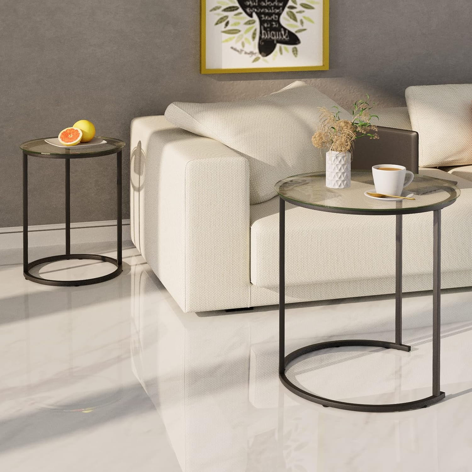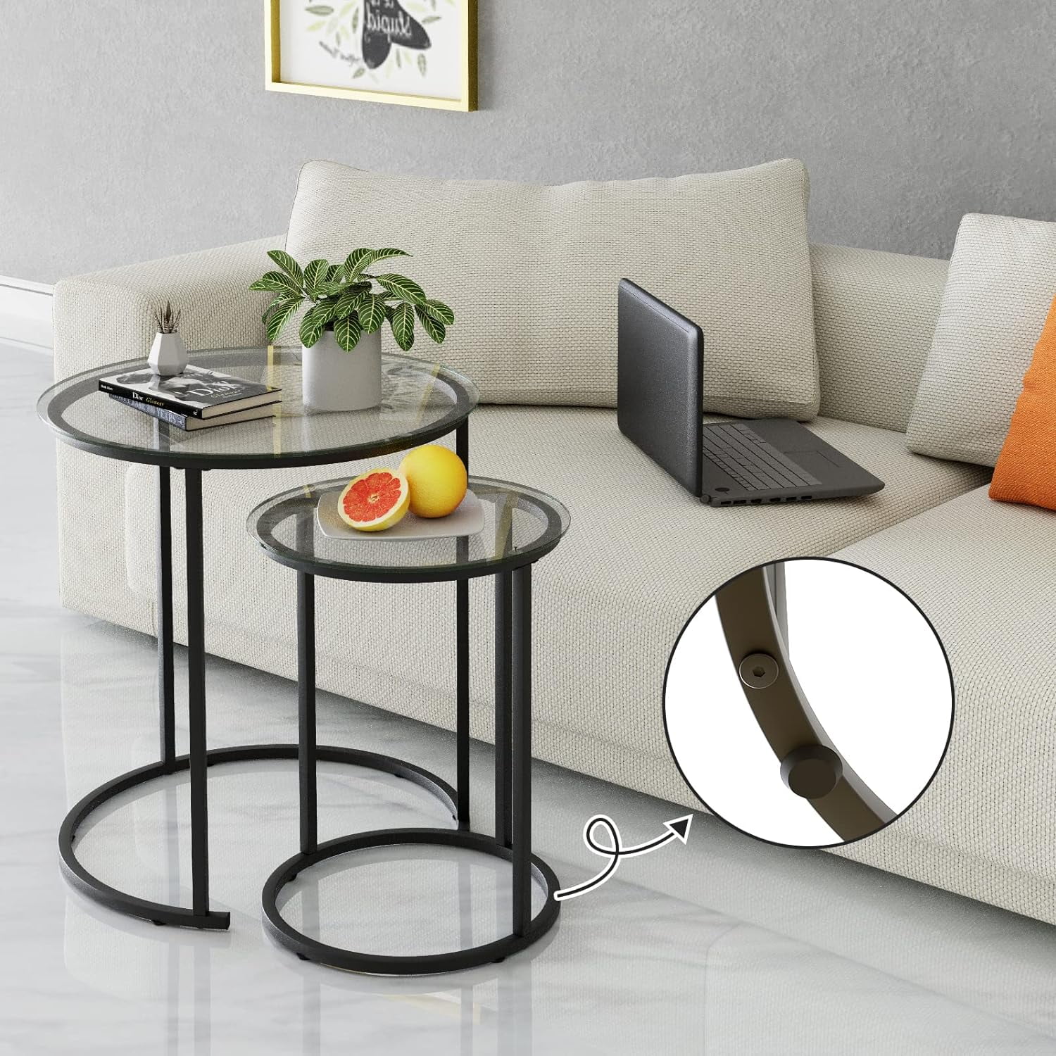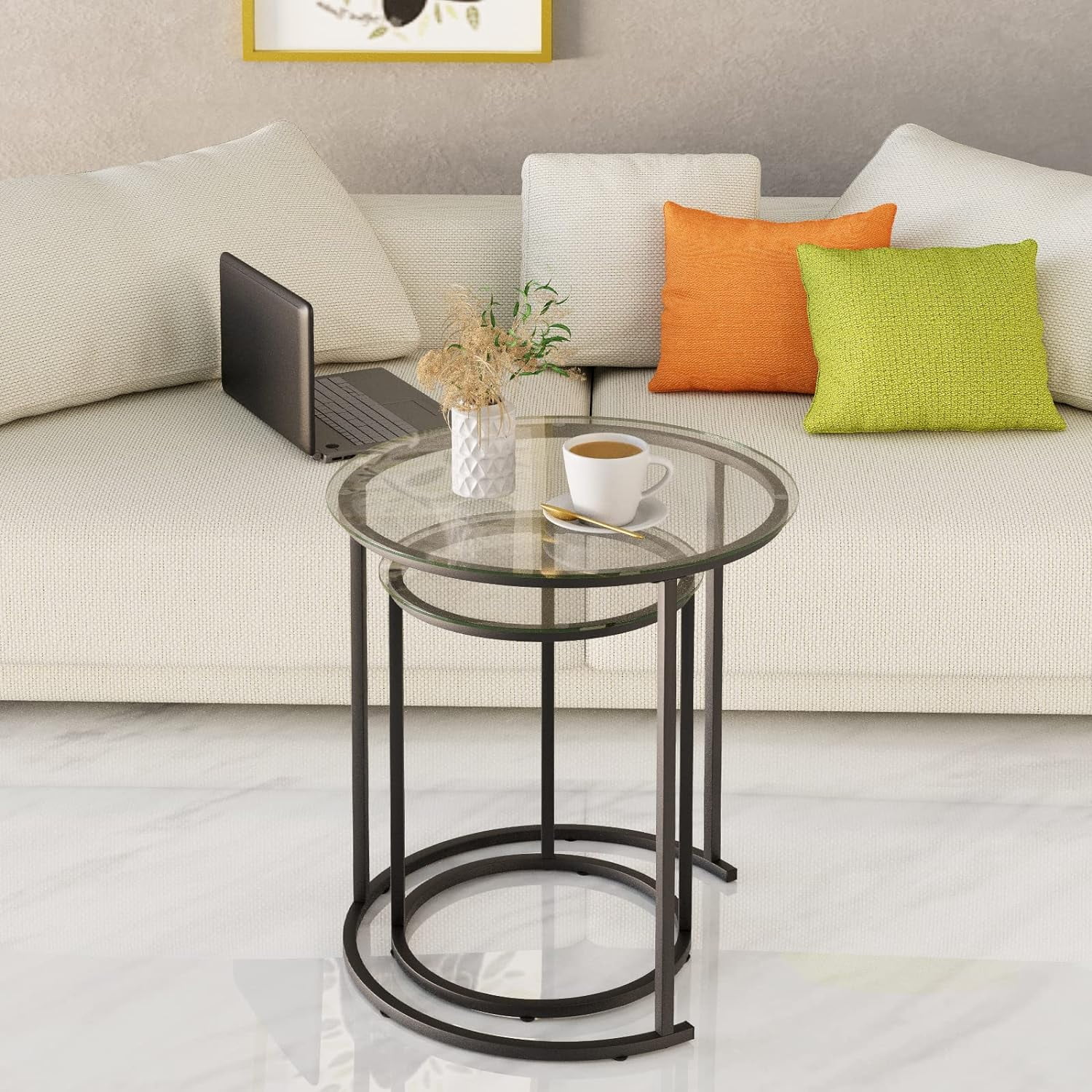 【NESTING TABLE】This modern and fashionable nesting table is composed of a large circular coffee table and a small side table. The size of this coffee table is 19.6 “Lx19.6” Dx23.6″H. The table supports a stable weight of 203 pounds, so you can rest assured to use. 【SIMPLE & ELEGANCE】This set of side table is made of high quality tempered glass,which is hard in material and has good heat resistance. The table legs have a multi-layer spray painting process, with uniform color and smooth touch, and the paint surface is not easy to fall off. 【DURABLE TEMPERED GLASS】Open storage design, beautiful appearance, take things and put things at a glance. Each layer height of the bookshelves is 10in, enough to hold books of various sizes 【MORE DETAILS】The glass tabletop is fixed with double-layer screws and strongly adsorbed by suction cups, ensuring the stability of the glass and preventing it from sliding.The foot of the table is also equipped with non-slip pads You can move the coffee table freely without damaging your floor. 【WIDELY USED】This nested table is perfect as a coffee table or side table, cocktail table, and can be placed in the living room, balcony, and dining room.You can also combine or use this coffee table separately according to your needs.
