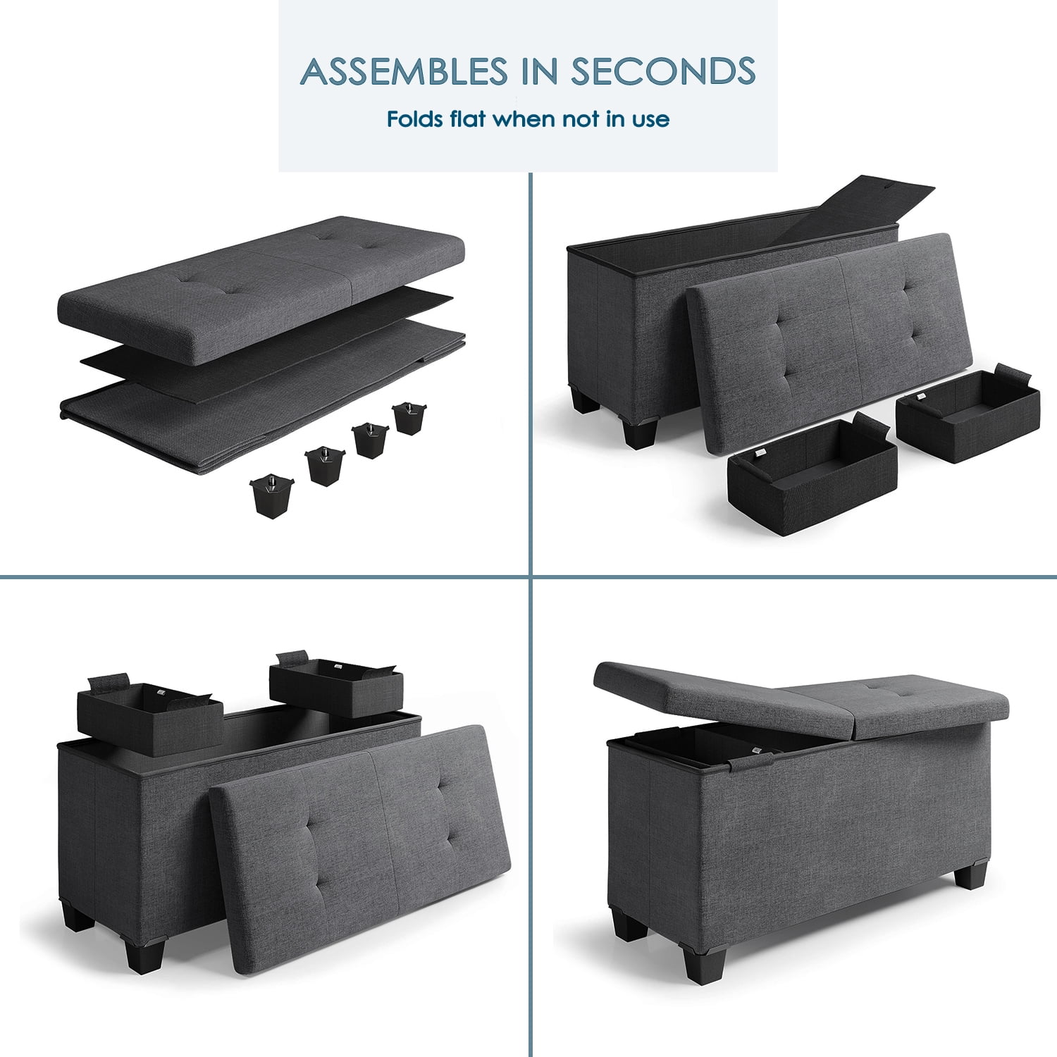 Nestl Linen Ottoman Storage Bench ,30″ Bench, Gray The Nestl tufted storage ottoman bench serves as a foot rest ottoman for living room or fall decor. Your ottoman with storage can also be used as a coffee table or additional seat. Our storage ottoman can fold flat when not in use, adapting the ottoman to suit your storage needs. The durable fabric, gray ottoman helps organize essentials and accessories with this multipurpose storage bench. The sturdy, cushioned lid of our ottoman for bedroom storage is comfortable and supportive, with an invisible hinge design that allows it to be bent and lifted up from either side without removing the entire lid. The large ottoman space stores bulkier items like throw blankets and pillows.