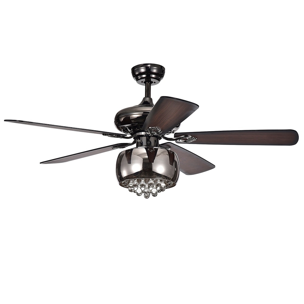 Stay cool and comfortable while adding elegance to your space with the Nettle 3-light Shaded Glass and Crystal 5-blade 52-inch Pear Black Ceiling Fan by Warehouse of Tiffany. The stunning chandelier crystals inside a shaded glass bowl offer brilliant illumination, while the reversible blades and three motor speeds let you adjust airflow to optimal comfort levels. Features: Elegant chandelier crystals inside a shaded glass bowl for brilliant illumination Reversible blades with 0-12 degrees blade pitch for optimal comfort levels Three motor speeds for customized airflow Includes a remote control switch for easy operation Requires (3) 25W bulbs (not included) Features a pear black finish and 5 wood blades for a stylish look Comes with a light kit Motor is reversible for year-round use Additional information: Lamp Type: Glass Bowl Chandelier Lamp Material: Crystals, Metal, Wood Number of Lights: 3 Lights Light Bulb Type: Incandescent Ceiling Fan Light: Light Kit Included Finish Color: Pear Black Motor speeds: 188 RPM (Level 1), 133 RPM (Level 2), and 77 RPM (Level 3) This product requires a Professionally Licensed Electrician for installation.