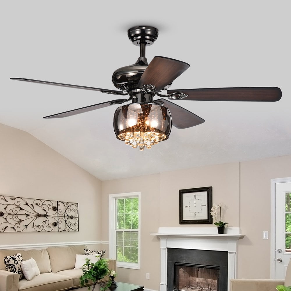 Elegant chandelier crystals inside a shaded glass bowl for brilliant illumination Reversible blades with 0-12 degrees blade pitch for optimal comfort levels Three motor speeds for customized airflow