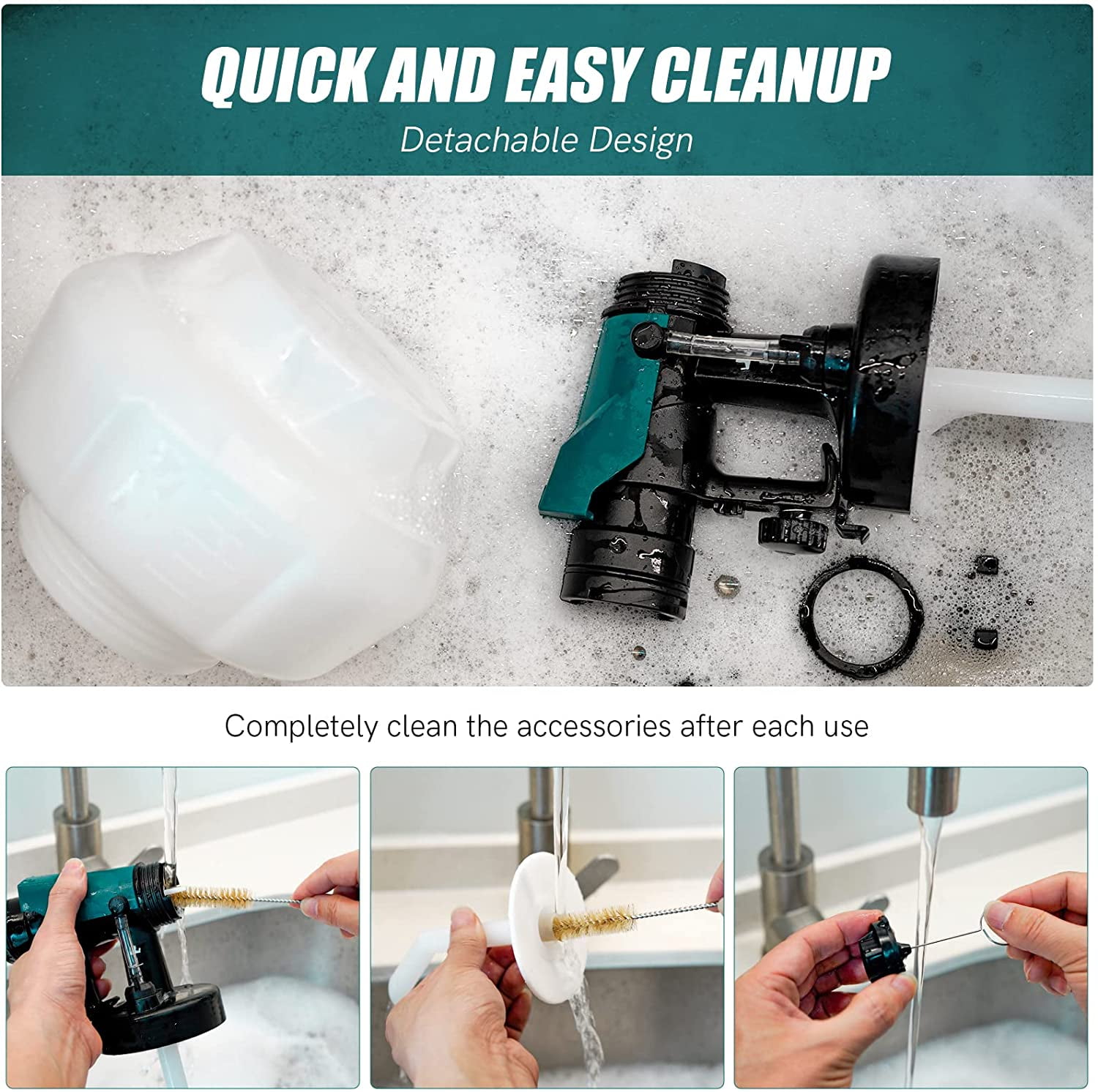 500W Paint Sprayer: High power motor is designed for higher efficiency work, which would be work faster than roller or brusher for sure, saving DIY homeowner ton of time and getting the job go much quicker. Great Time Saver! Adjustable Design: Paint spray gun with a great feature of 3 adjustable spraying patterns(vertical, horizontal, circular) and material flow control Knob, pretty easy to dial in the perfect settings for different spray options. Ultra-Convenience: The Light sprayer gun (3.5lbs) with 6.65FT cord doesn’t hurt your wrist to hold for long periods of time, and no more fighting with the plug every time you move. Detachable design makes it relatively easy to use and clean. No experience needed! Plenty of Usages: HVLP sprayer can make your spraying project more extensive, like internal and external walls, furniture, fence, decor, cabinet, craft and more. And Max Viscosity up to 100DIN-s makes it applicable for a wide variety of materials such as thinned latex paints, chalk, stain, sealer and varnish, etc. 4 Nozzles & 10 Strainers: 4 spray nozzle sizes (1.5mm/2.0mm/2.5mm/3.0mm) make spraying easier of choice for different surfaces. And 10PCS Strainers comes with that help to filter the impurities of the diluted paint for atomized particles finer (ps: pls clean the accessories immediately after usage)