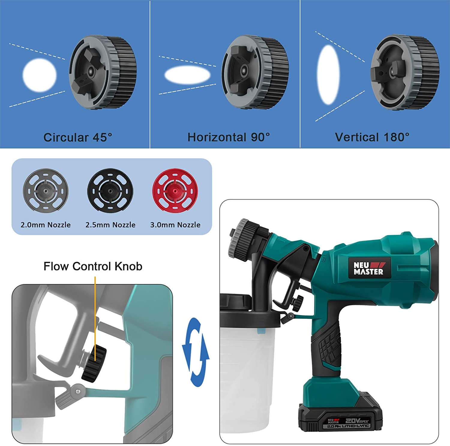 Cordless Design & Bigger Capacity: Enjoy the freedom of movement with a cordless paint sprayer. The 900ml paint container allows for large area spraying, covering up to 54 sq. ft in one fill (spray 900ml paint within 4 minutes) Flexibility for Household Projects: Ideal for achieving a consistent finish and fast coverage on various surfaces including decks, patios, fences, furniture, and cabinets Top Cap Design and Soft Grip Handle: The convenient top cap design makes adding paint easier than traditional wireless paint guns. The lightweight, non-slip soft grip handle enhances comfort and control, reducing fatigue during use Advanced Adjustability: Easily set up for any project with adjustable power settings, variable paint flow, and changeable pattern size and direction (circular, horizontal, and vertical). Comes with three nozzle sizes (2.0mm, 2.5mm, 3.0mm) for versatile applications Easy to Use & Clean: User-friendly design ensures easy assembly and operation. Includes cleaning attachments for efficient maintenance after use