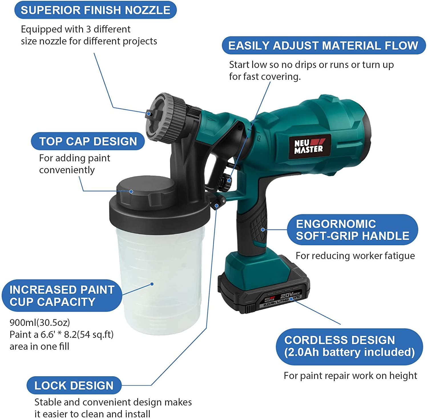 NEU MASTER NSG0060, Cordless HVLP Paint Sprayer, 900ml, 3 Nozzles, 3 Patterns, 5.52 lb