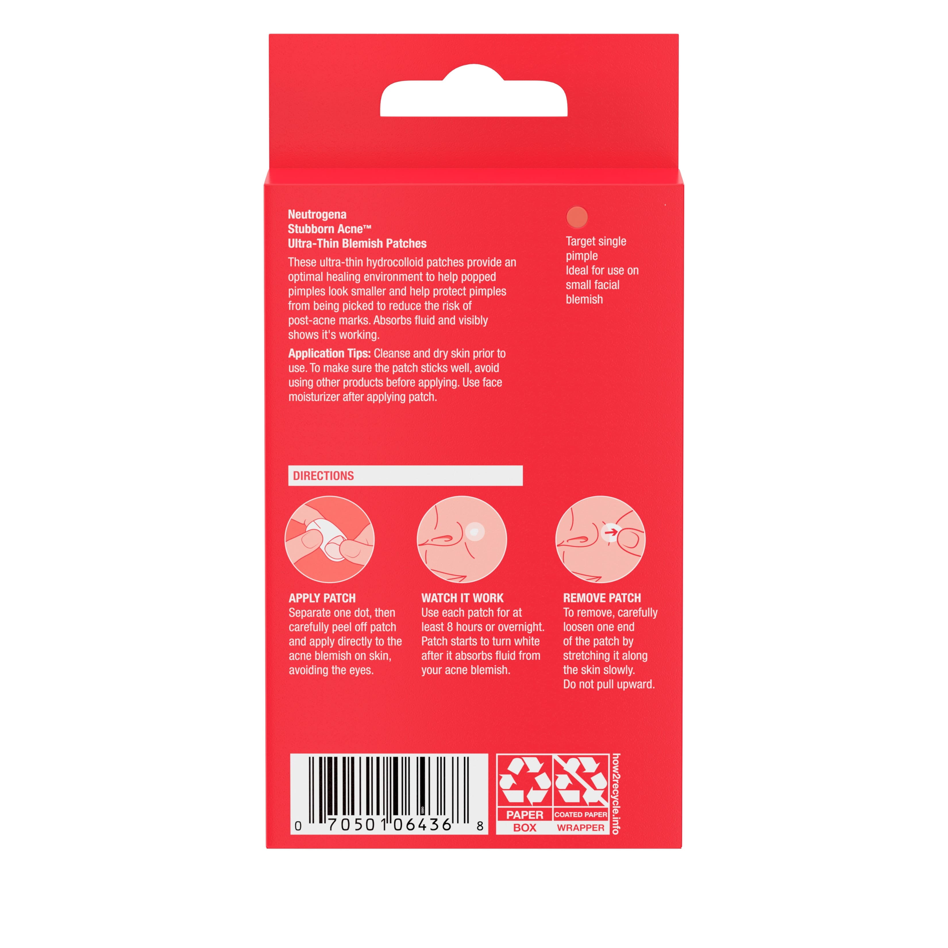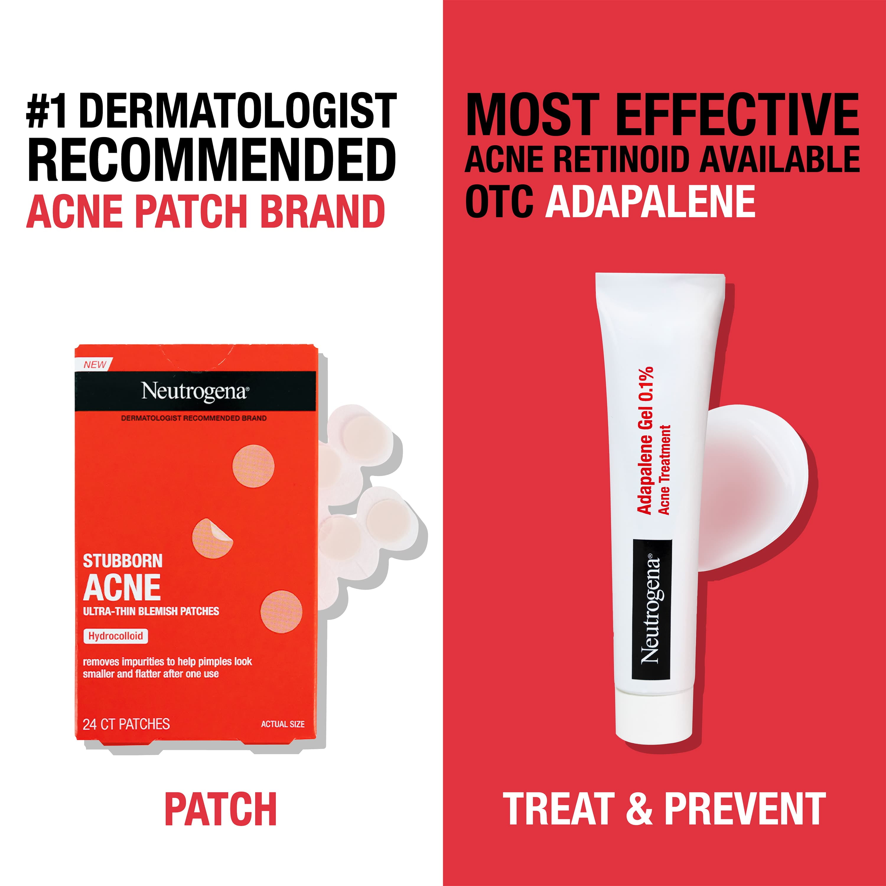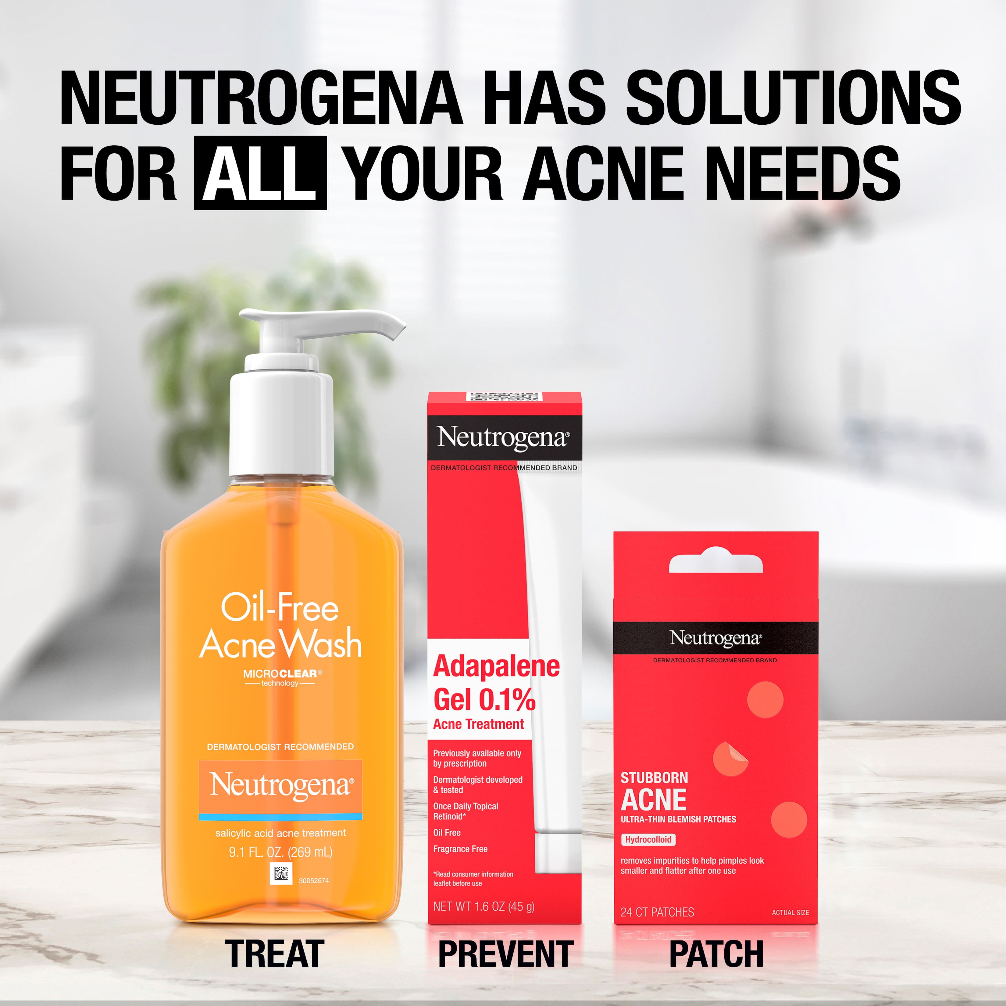 Neutrogena Acne Skincare Solutions to cleanse, treat, & patch breakouts for acne-prone skin Neutrogena Oil-Free Acne Facial Cleanser with salicylic acid acne medication to help treat breakouts Face wash gently cleanses deep down into pores to cleanse skin & prevent future breakouts in 1 step Neutrogena 0.1% Adapalene Gel Acne Treatment to help treat and clear blemishes from acne-prone skin Adapalene is a topical retinoid that helps regulate skin cell turnover to keep pores from clogging Neutrogena Ultra-Thin Hydrocolloid Blemish Patches help absorb fluid from acne blemishes Non-medicated patches help popped pimples look smaller & flatter after 1 use Neutrogena addresses all your acne needs