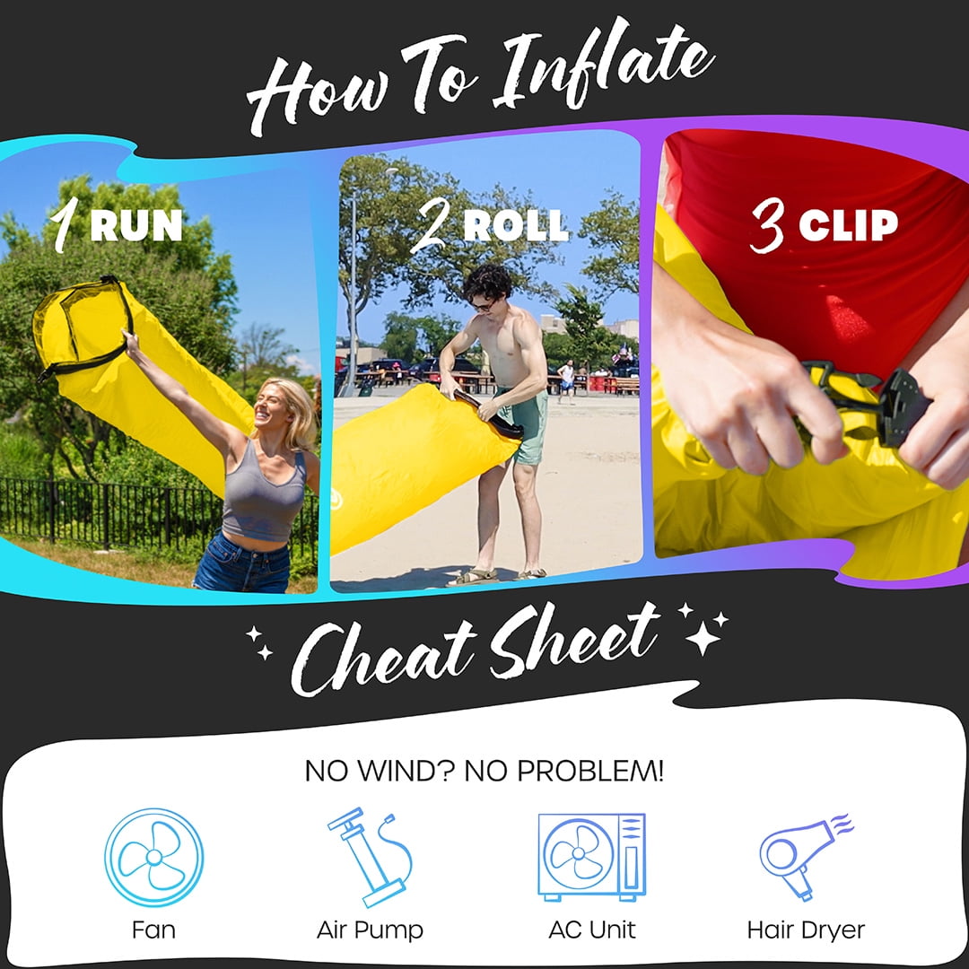 No air pump required to inflate. Made of lightweight, anti-tear polyester (210T) for comfort and durability. 3 pockets for conveniently storing your belongings. Peg allows you to anchor inflatable chair to the ground. Matching drawstring travel bag makes it easy to store and transport air couch. Weighs 2 lbs and can hold up to 450 lbs. Ideal for pool parties, concerts, the beach, camping and more! 1 Inflatable Lounger With 3 Pockets 1 Drawstring Travel Bag 1 Peg Unbuckle and unroll the lounger. Hold from the opening, face the wind and run a short distance to catch some air. Once 80% full, close the opening (while still in motion) and roll 3-5 times. Close the buckle to seal the lounger and secure it to the ground with the provided peg. Lie back and enjoy! 12″ x 8″ x 2″ when folded. 73″ x 16″ x 31″ when fully inflated.