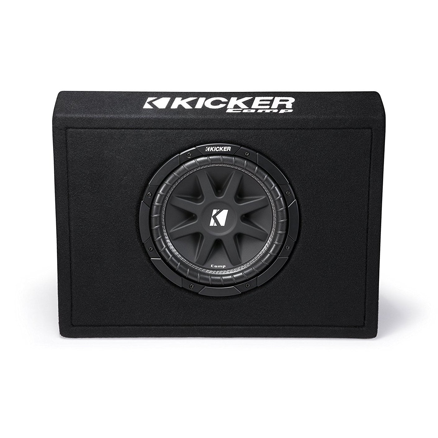 Convenience and raw power in a single little package of audio perfection, the new Kicker 43TC104 Single 10-Inch Comp 150W Loaded Subwoofer Enclosure will turn your car audio awesome-ness up to 10.This loaded box features a 10-inch subwoofer with a single 4-ohm terminal, 600 watts of peak power, and 300 watts of RMS power. The thin profile takes up less space in your vehicle, and the whole enclosure measures 21.75 x 7.69 (bottom) x 4.75 (top) x 15 inches.Kick your car audio up a notch with the Kicker 43TC104 Single 10-Inch Comp 150W Loaded Subwoofer Enclosure.