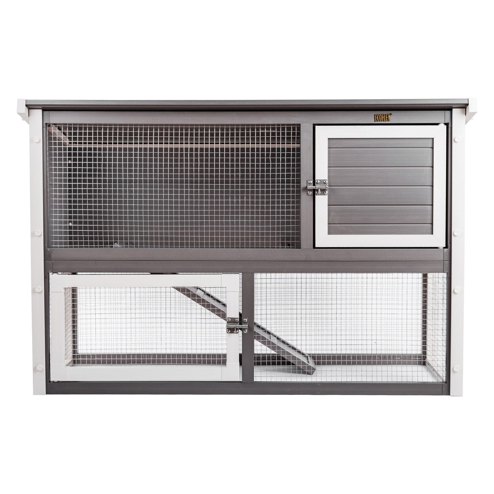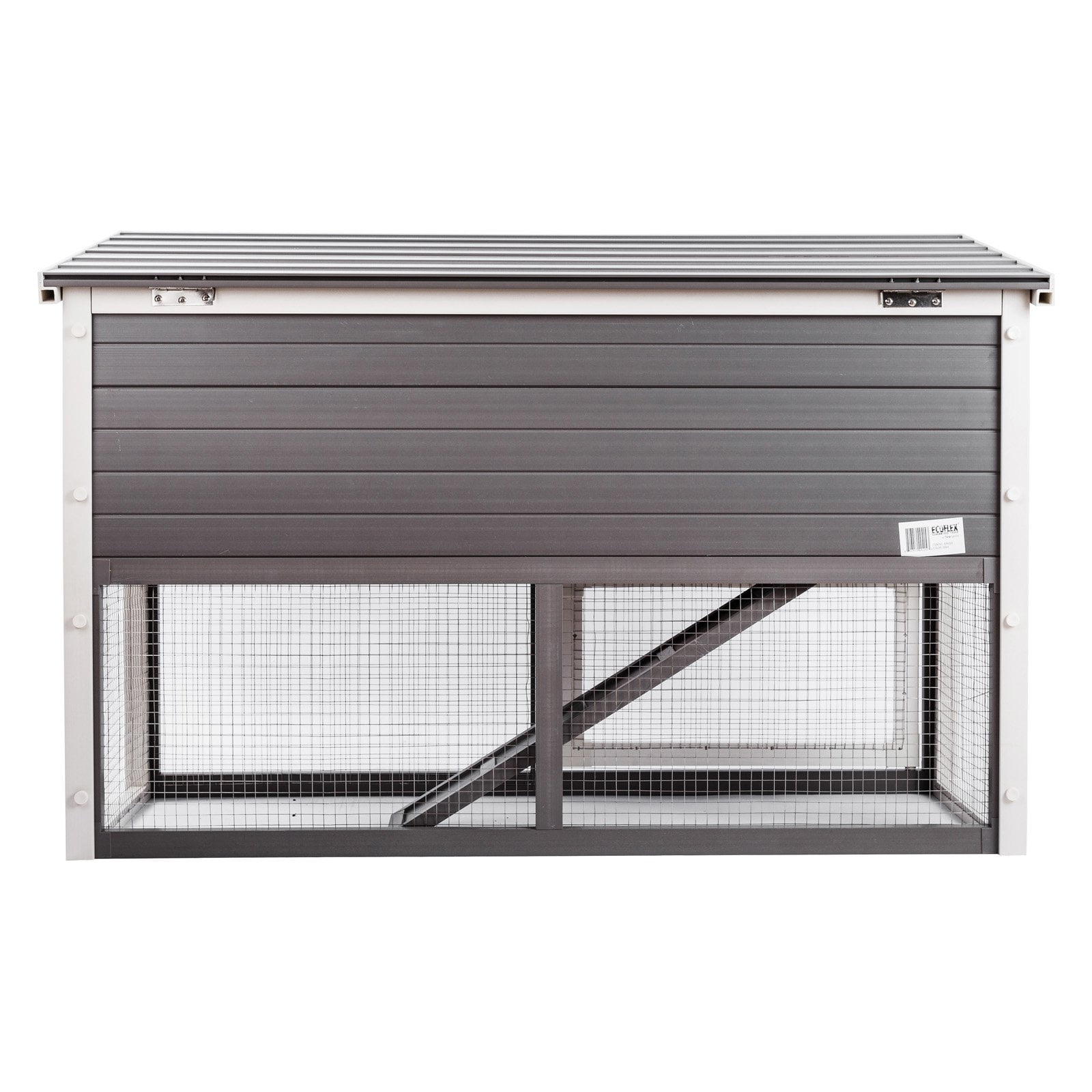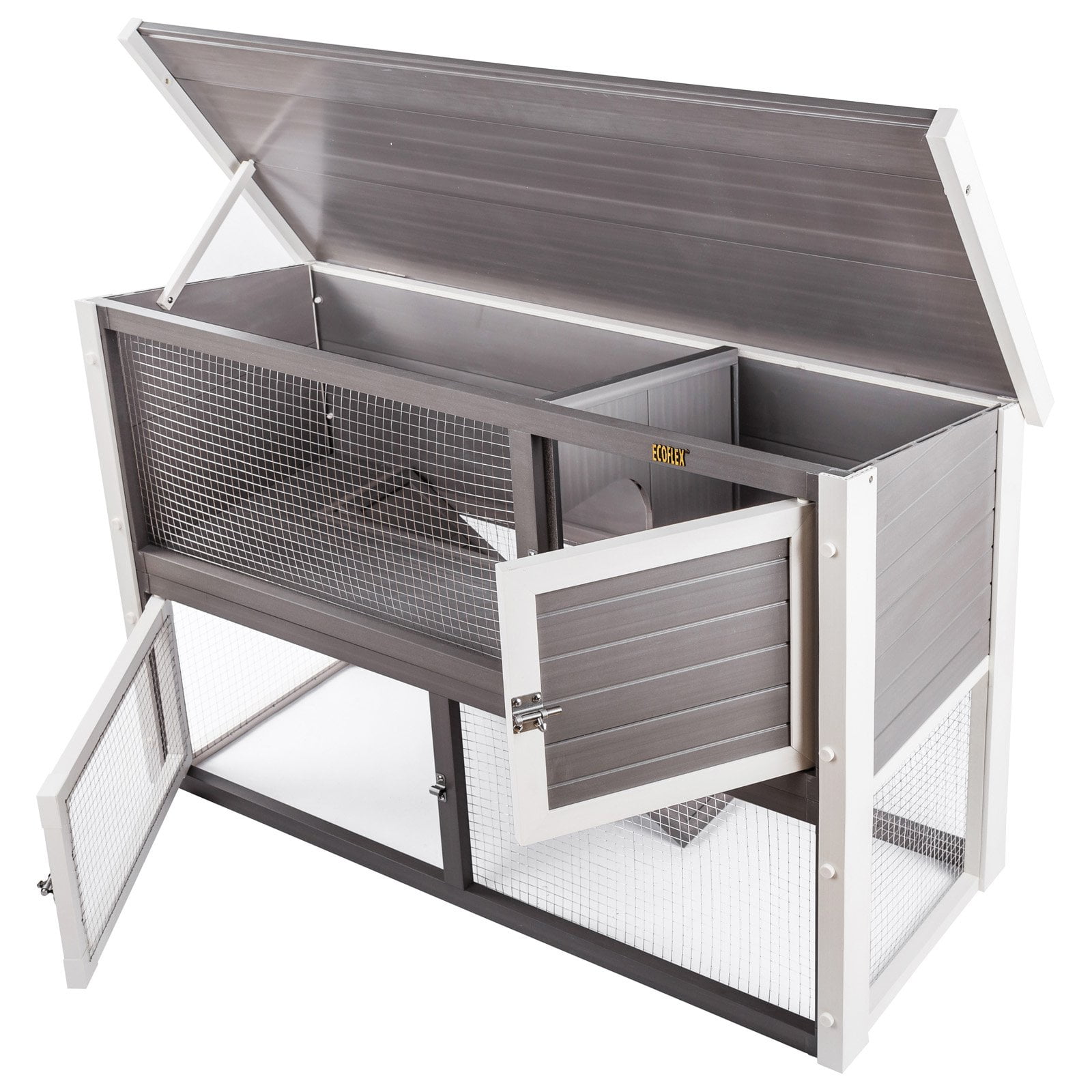 [Durability and Sustainability] Crafted from ECOFLEX®, a robust blend of recycled polymers and reclaimed wood fibers; designed to withstand the elements and resist moisture and odors, ensuring a durable habitat for rabbits and small animals [Spacious and Comfortable Living] Offers two levels of living space, including a cozy denning area on the top level for privacy; the bottom level features an open ground design, allowing pets to feel the grass under their feet, promoting a natural and healthy living environment. [Easy Assembly and Maintenance] Requires no tools for assembly, making setup quick and hassle-free; constructed with materials that are easy to clean, ensuring a hygienic environment for your pets [Safe and Secure Access] Equipped with a sturdy ramp; ensures your rabbit can safely move between the upper denning space and the open ground bottom level; designed for easy and secure access, enhancing your pet’s freedom and enjoyment. [Enhanced Safety and Durability] Constructed with ECOFLEX® and reinforced with NeveRust™ stainless steel wire; this rabbit hutch is designed to provide a secure and long-lasting home for your pet, resistant to both weather and wear. Hinged roof for easy access [Peace of Mind with Warranty] Backed by a 10-year manufacturer’s warranty; have confidence in the quality and longevity of your Rabbit Hutch, ensuring your pet’s home stands the test of time.