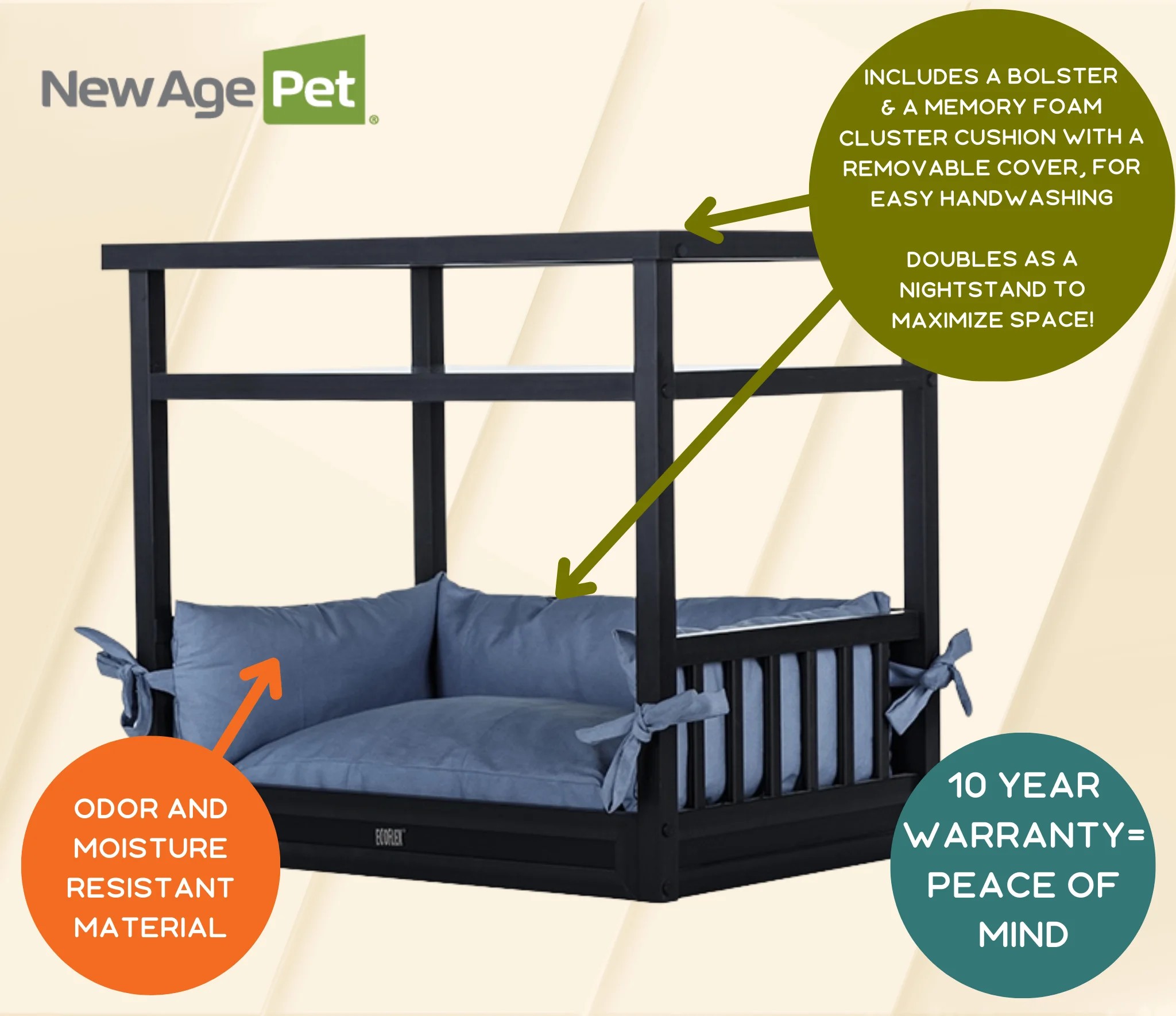Ecoflex Sundown Nighstand Bed – Espresso Description: The New Age Pet Nightstand Bed is made with ECOFLEX, a proprietary composite blend of recycled polymers and reclaimed wood fiber by-products. The ECOFLEX material is non-toxic, eco-friendly and impervious to moisture and odor, making it the perfect material for your pets’ furniture. All New Age Pet furniture is backed by a 1-year limited manufacturer warranty. Give your pup his own place to rest with our Nightstand Bed. This bed features a plush, memory foam cluster cushion with removable cover for your pup, and table top and shelf for lamps, books, photos and more. Available in Espresso and Gray. New Age Pet products are easy to assemble, easy to clean and easy to LOVE! Proof of purchase required for any warranty claims. Features: Color: Espresso. Size: 30.7″L x 22″W x 27.2″H Made with ECOFLEX, a durable and long-lasting wood plastic composite. Moisture resistant for superior odor control and easy cleaning Non-toxic and eco-conscious. Quick and easy assembly. Includes memory foam cluster cushion with removable cover, for easy handwashing 1-year limited manufacturer warranty Warranty covers material or manufacture defect on all ECOFLEX parts Brand Name: New Age Pet Model No: 1012-EHNB602