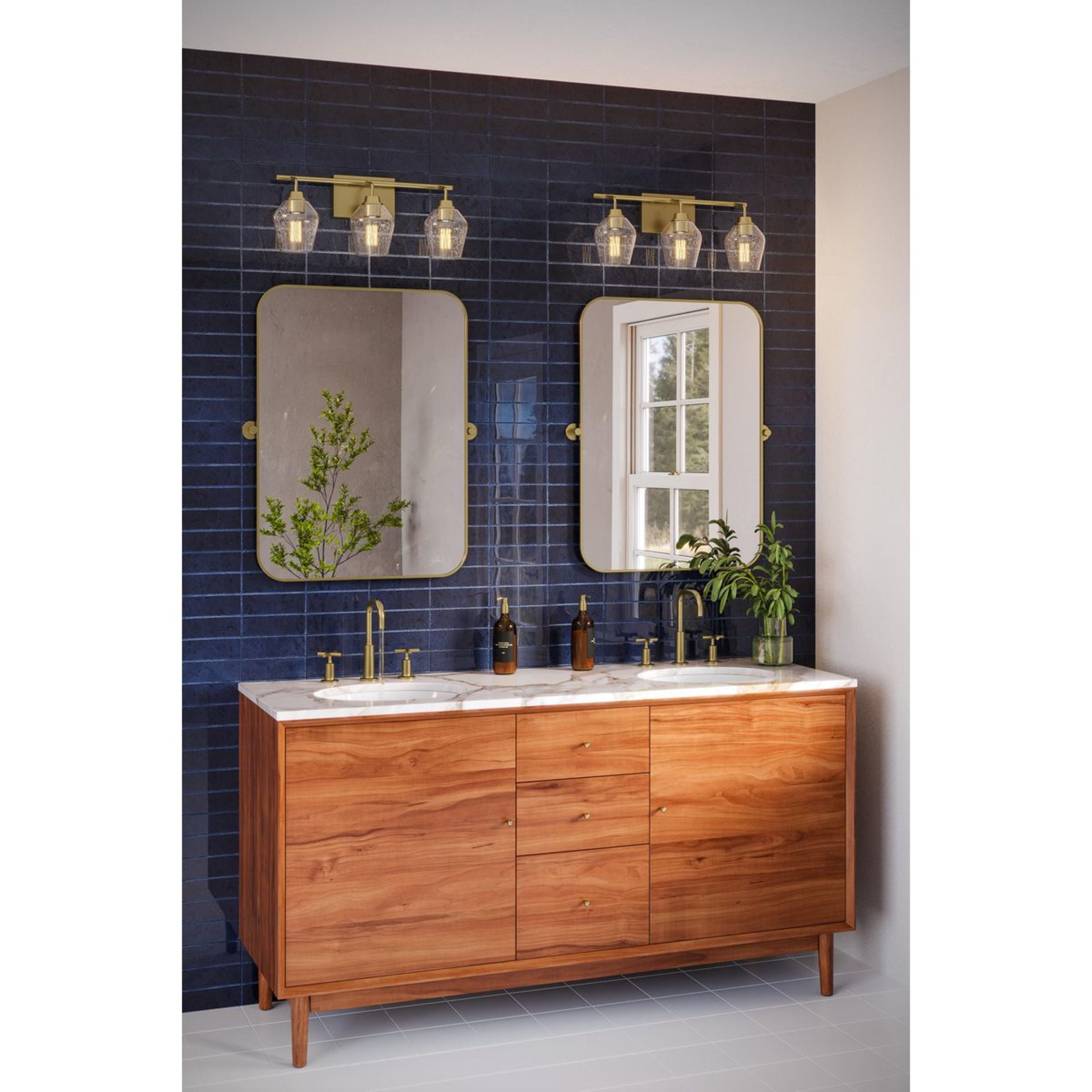 Clear shades with a softened diamond silhouette and an elegant gold-toned frame brings modern appeal to the AVEC Adalyn A300000-191 Incandescent 3-Light Vanity Light. The geometric clear glass shades deliver elegant, bright illumination to bathrooms in modern craftsman and farmhouse settings. Mount the light fixture with the glass facing up or down for more design flexibility and the proper amount of illumination so that you can easily get ready for whatever your day or evening brings.